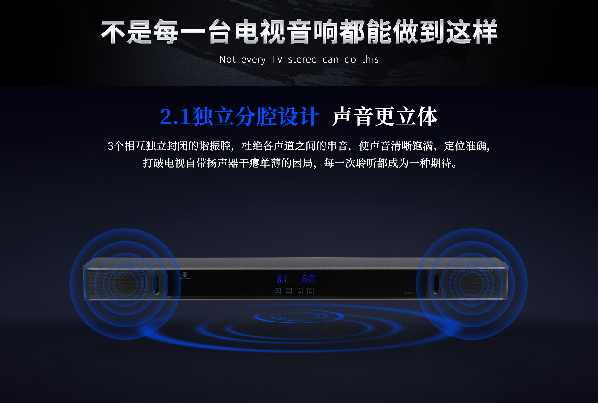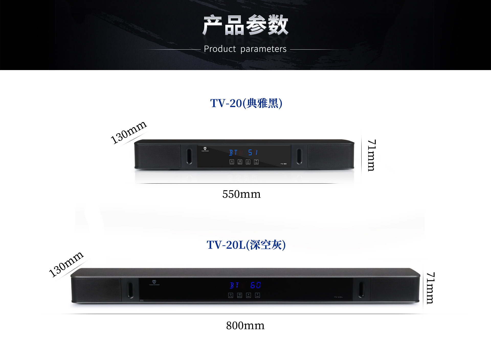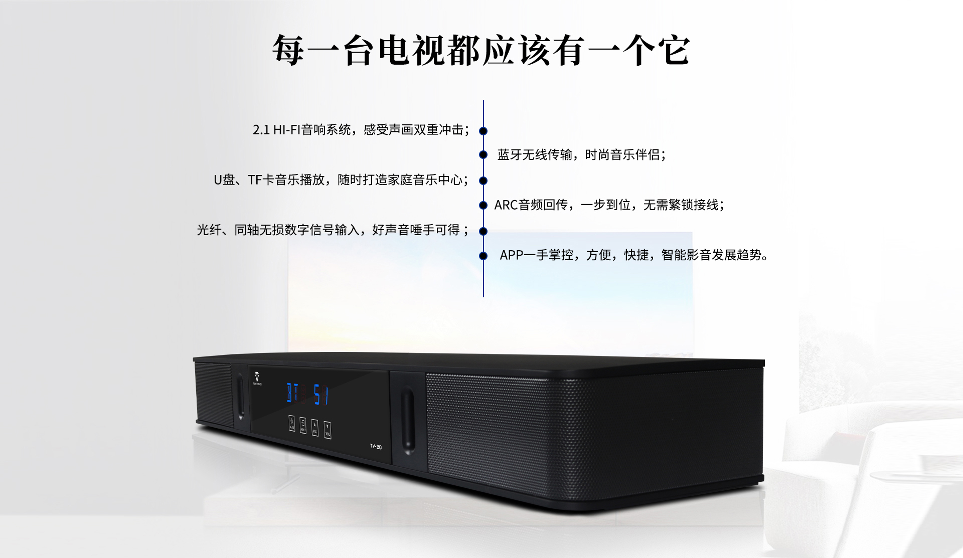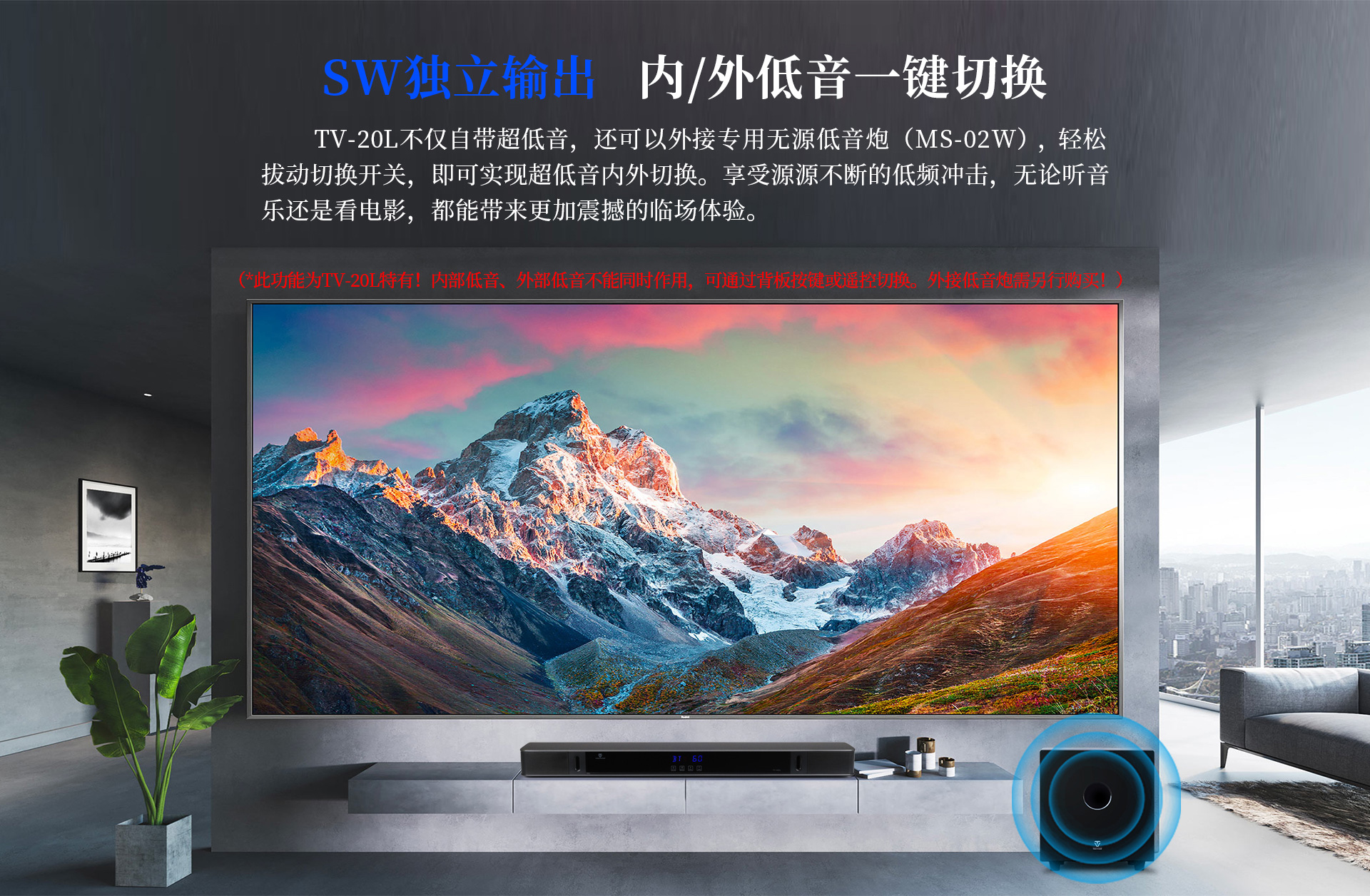 一、總體特點: 1. 2.1獨立音腔,三個獨立封閉的諧振腔,杜絕各聲道之間的串音; 2. 兩個2英寸大功率低失真全頻單元和一個3.5英寸長沖程低音單元,聲音優(yōu)美自然,溫暖醇厚,大幅提升電視音質(zhì); 3. TV-20L配有SW低音獨立輸出,接駁有源低音炮,即可體驗更加震撼的聲音體驗; 4. HDMI ARC音頻回傳,電視、音箱一線牽,獲得更優(yōu)聲音的同時保持客廳整潔; 5. 獨立超重低音調(diào)節(jié),讓低音更加震撼; 6. 藍牙傳輸,不僅是電視音箱,更是藍牙音箱,海量無損網(wǎng)絡(luò)資源任意聽; 7. 支持128G的U盤/TF卡本地播放,源碼直出,音質(zhì)更動容; 8. APP智能操控,選曲、音量調(diào)節(jié)、高低音調(diào)節(jié)等功能一手掌控; 9. 模擬、光纖、同軸等接口一應(yīng)俱全,可接駁多種設(shè)備,音源選擇更少限制。