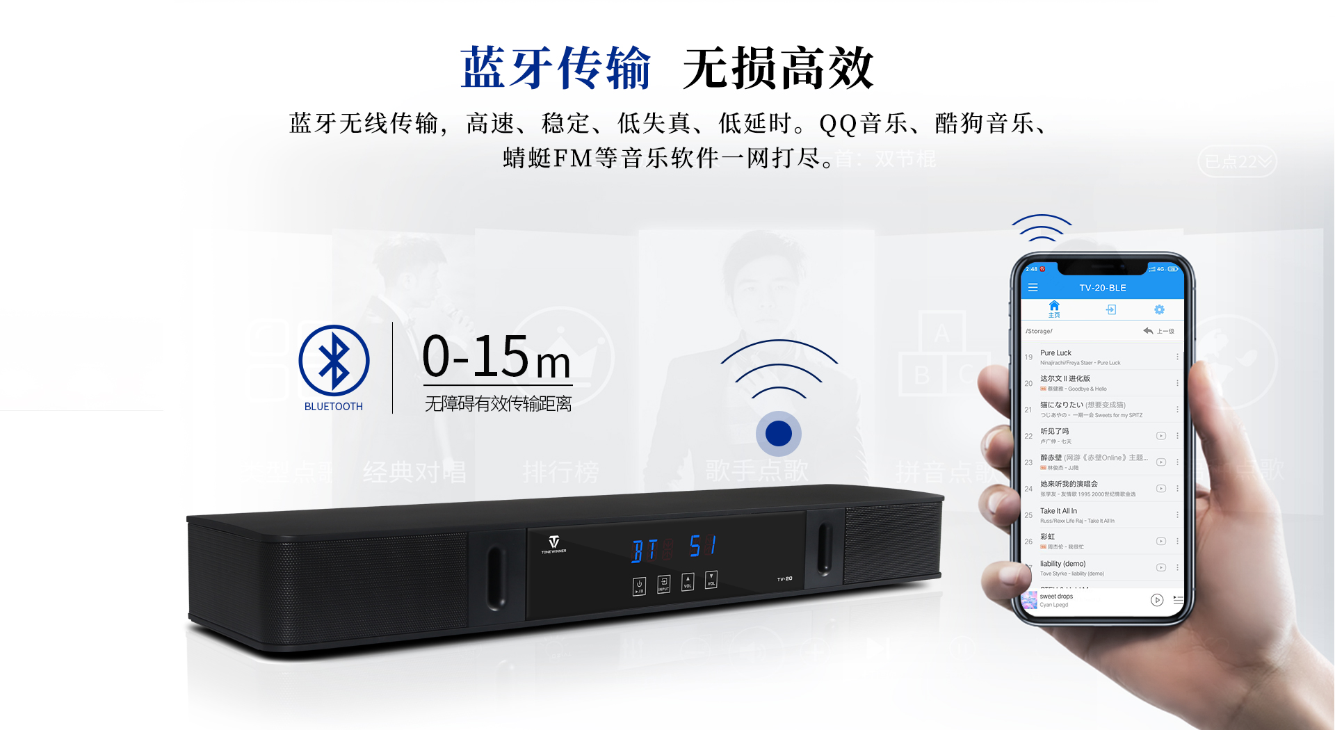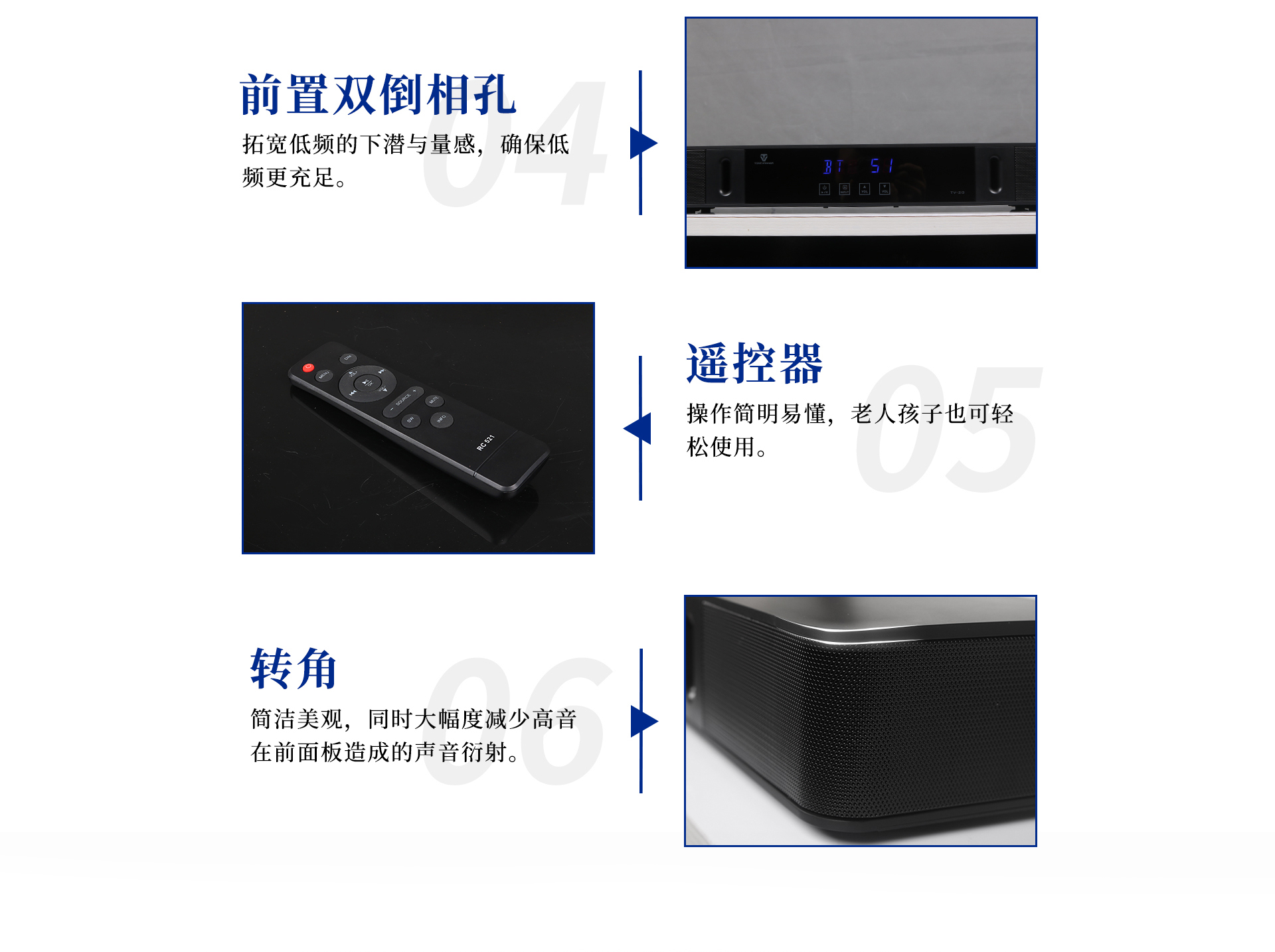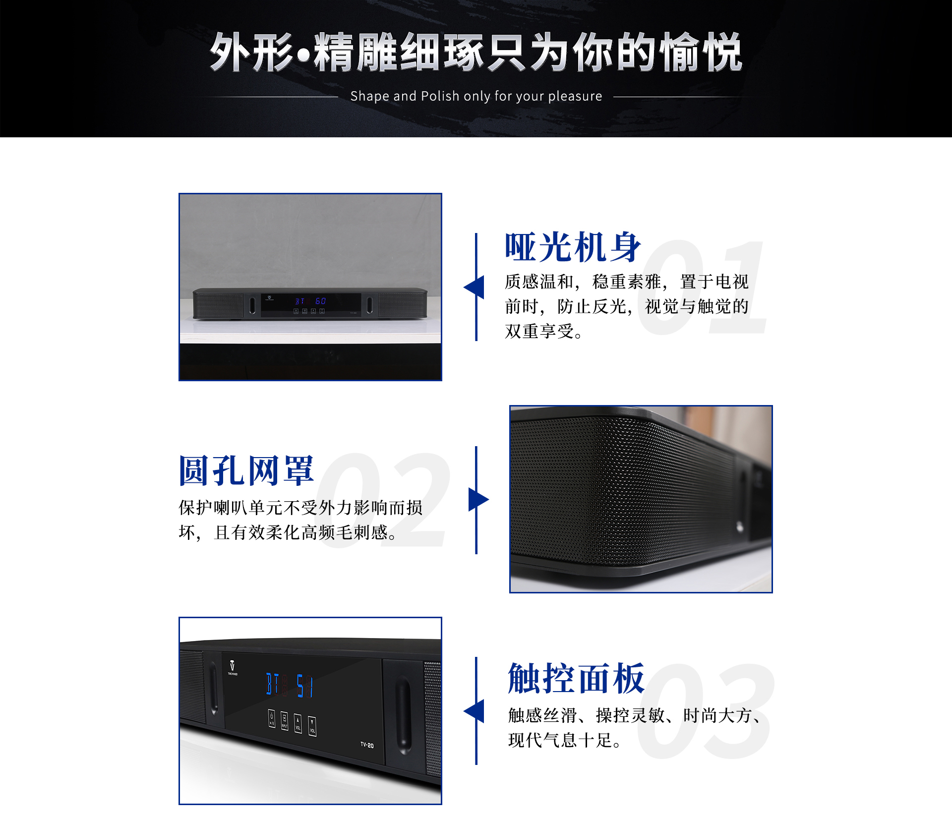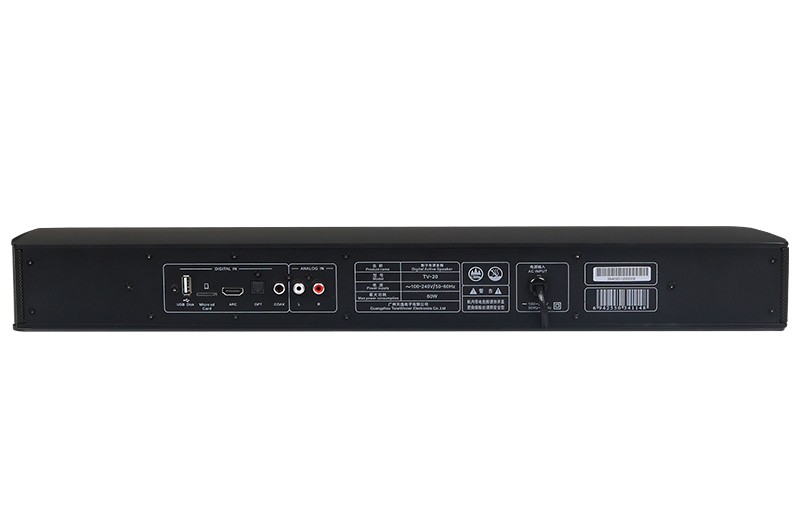 一、總體特點: 1. 2.1獨立音腔,三個獨立封閉的諧振腔,杜絕各聲道之間的串音; 2. 兩個2英寸大功率低失真全頻單元和一個3.5英寸長沖程低音單元,聲音優(yōu)美自然,溫暖醇厚,大幅提升電視音質(zhì); 3. TV-20L配有SW低音獨立輸出,接駁有源低音炮,即可體驗更加震撼的聲音體驗; 4. HDMI ARC音頻回傳,電視、音箱一線牽,獲得更優(yōu)聲音的同時保持客廳整潔; 5. 獨立超重低音調(diào)節(jié),讓低音更加震撼; 6. 藍牙傳輸,不僅是電視音箱,更是藍牙音箱,海量無損網(wǎng)絡(luò)資源任意聽; 7. 支持128G的U盤/TF卡本地播放,源碼直出,音質(zhì)更動容; 8. APP智能操控,選曲、音量調(diào)節(jié)、高低音調(diào)節(jié)等功能一手掌控; 9. 模擬、光纖、同軸等接口一應(yīng)俱全,可接駁多種設(shè)備,音源選擇更少限制。