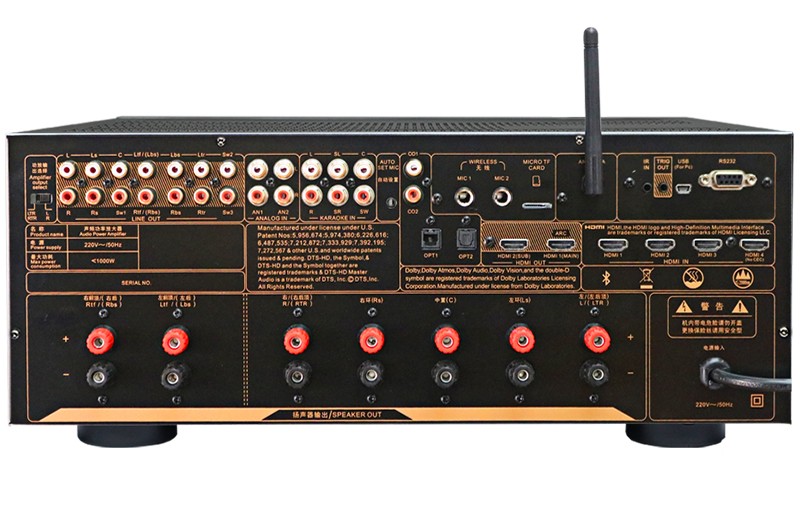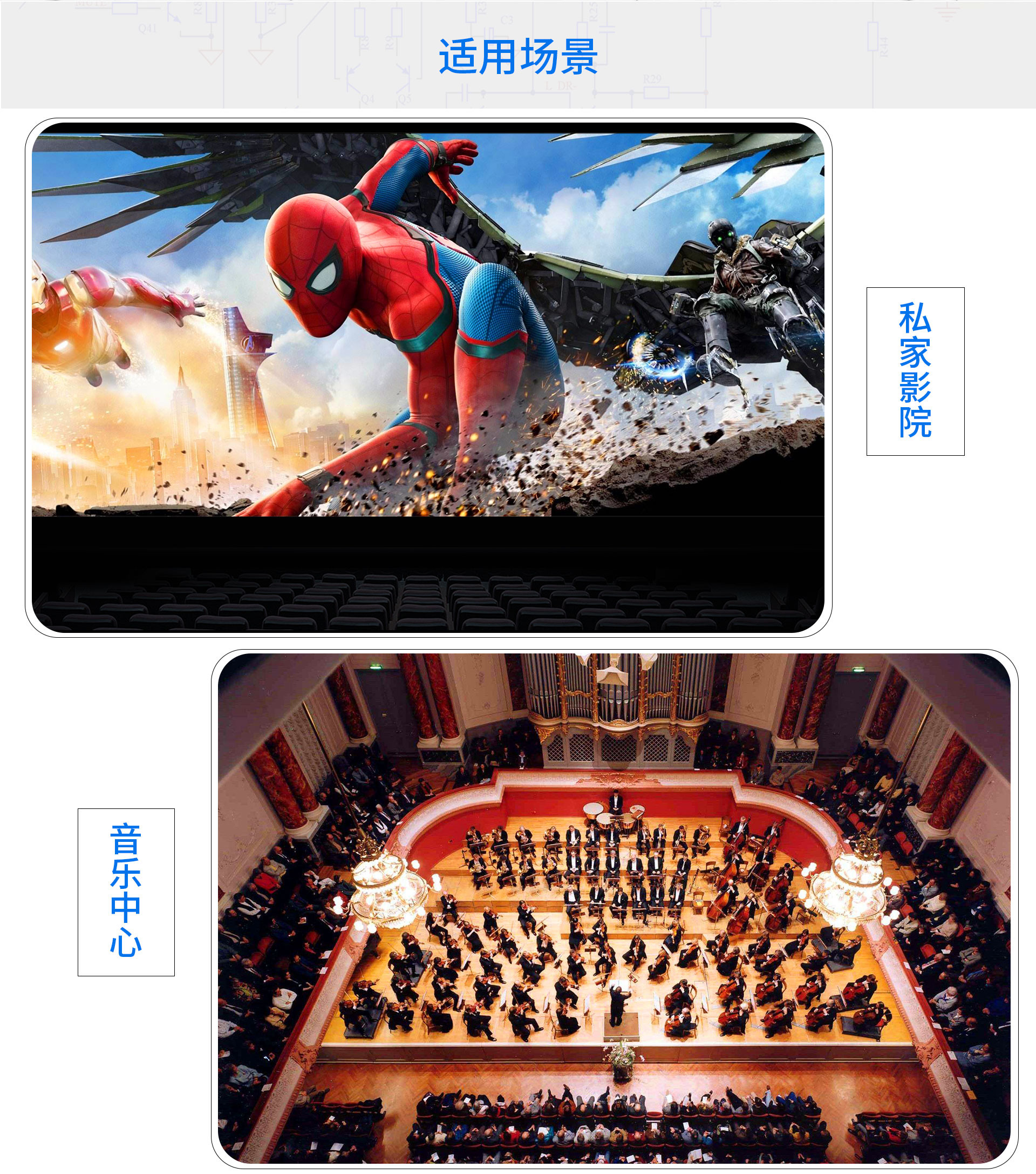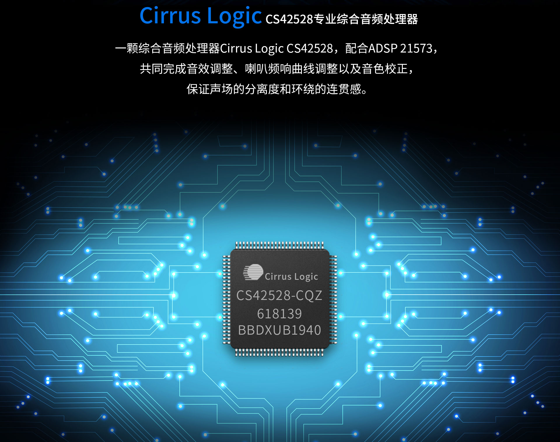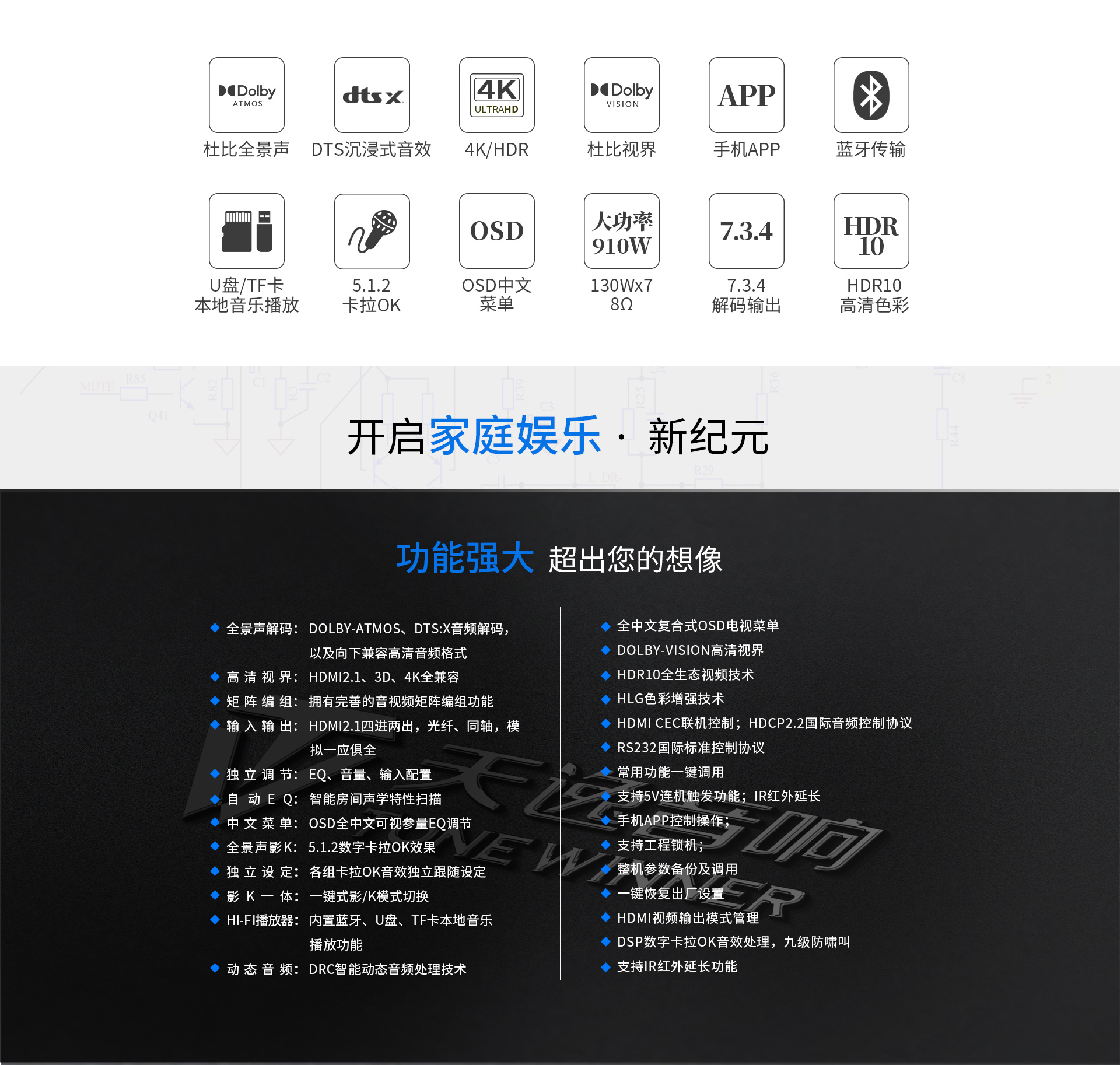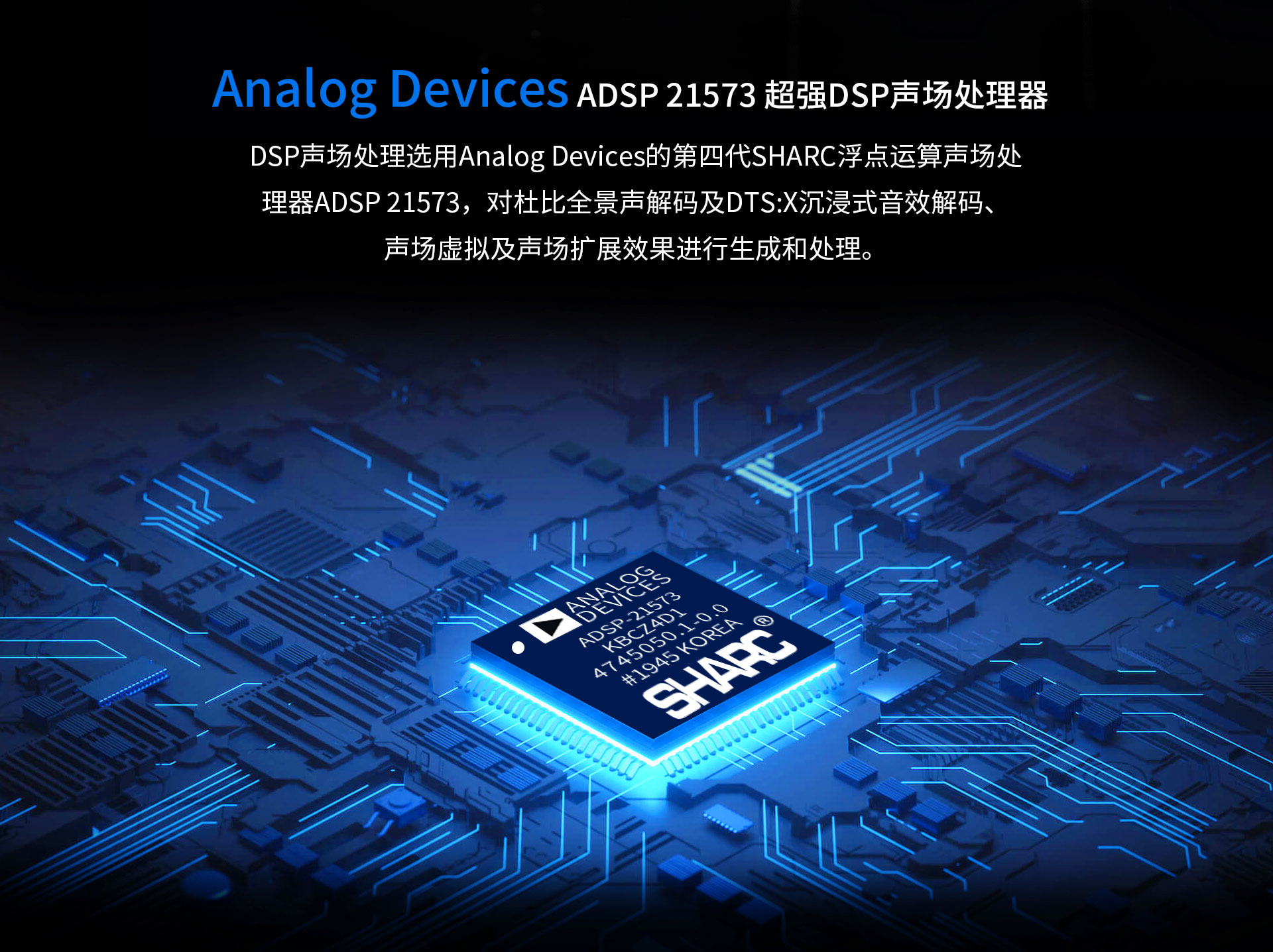 二、用料及電路設計 1.內置7×180W大功率H類HiFi功放,可直接驅動5.1.2聲道配置的揚聲器。 2.內置450W巨型環牛為功放動力之源,能量充沛。 3.采用日本松下MN864788作為多路HDMI輸入/輸出的重要處理芯片,Analog Devices公司的第四代SHARC浮點運算聲場處理器ADSP-21573完成DSP聲場處理,搭載兩顆經典的多功能綜合音頻處理器CS42528,全面應對Dolby Atmos和DTS:X的解碼,以及負責進行DSP聲場后處理,包括聲場虛擬及聲場擴展,并進行音效的調整和諸多喇叭的頻響曲線調整和音色校正。 4.整機采用發燒級電路設計,精選集成元器件及多層沉金電路板,為影院級音效打下夯實基礎。