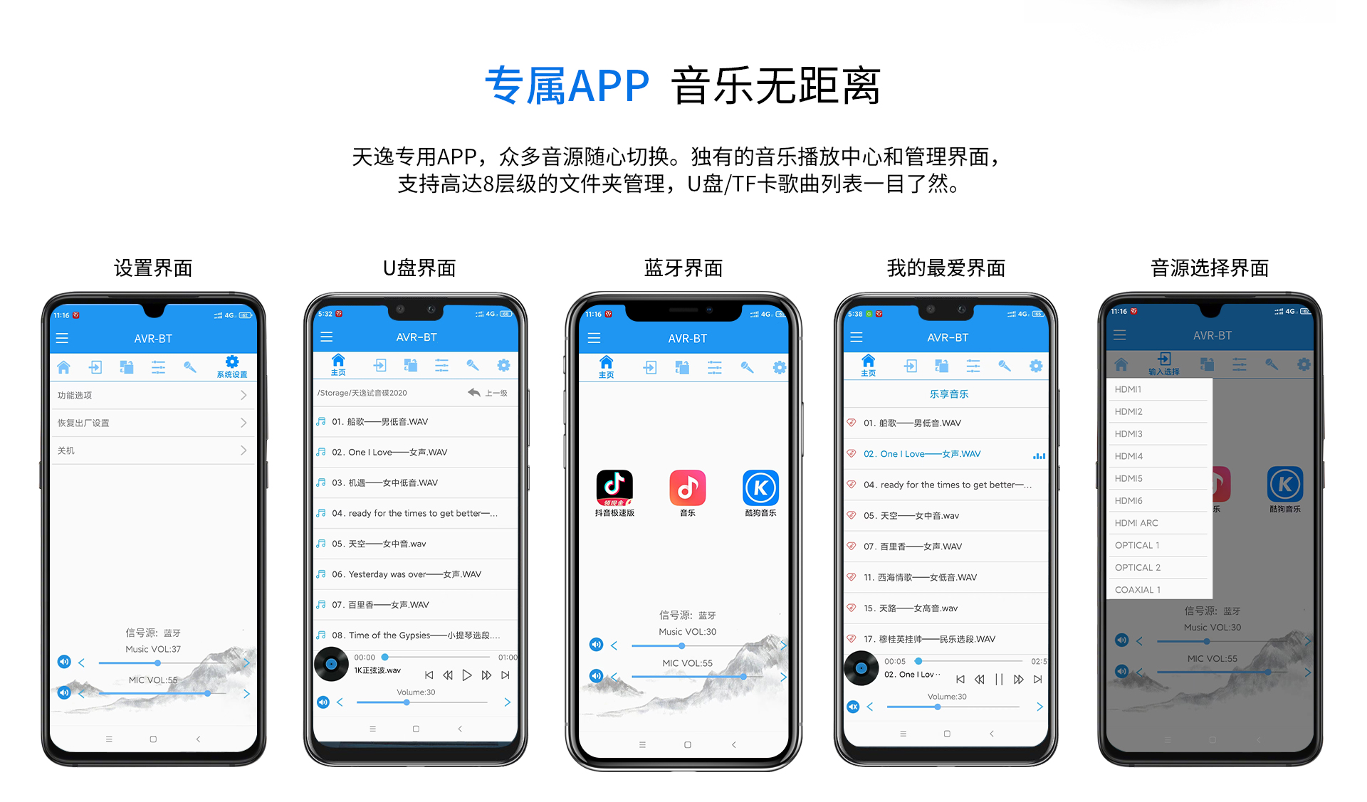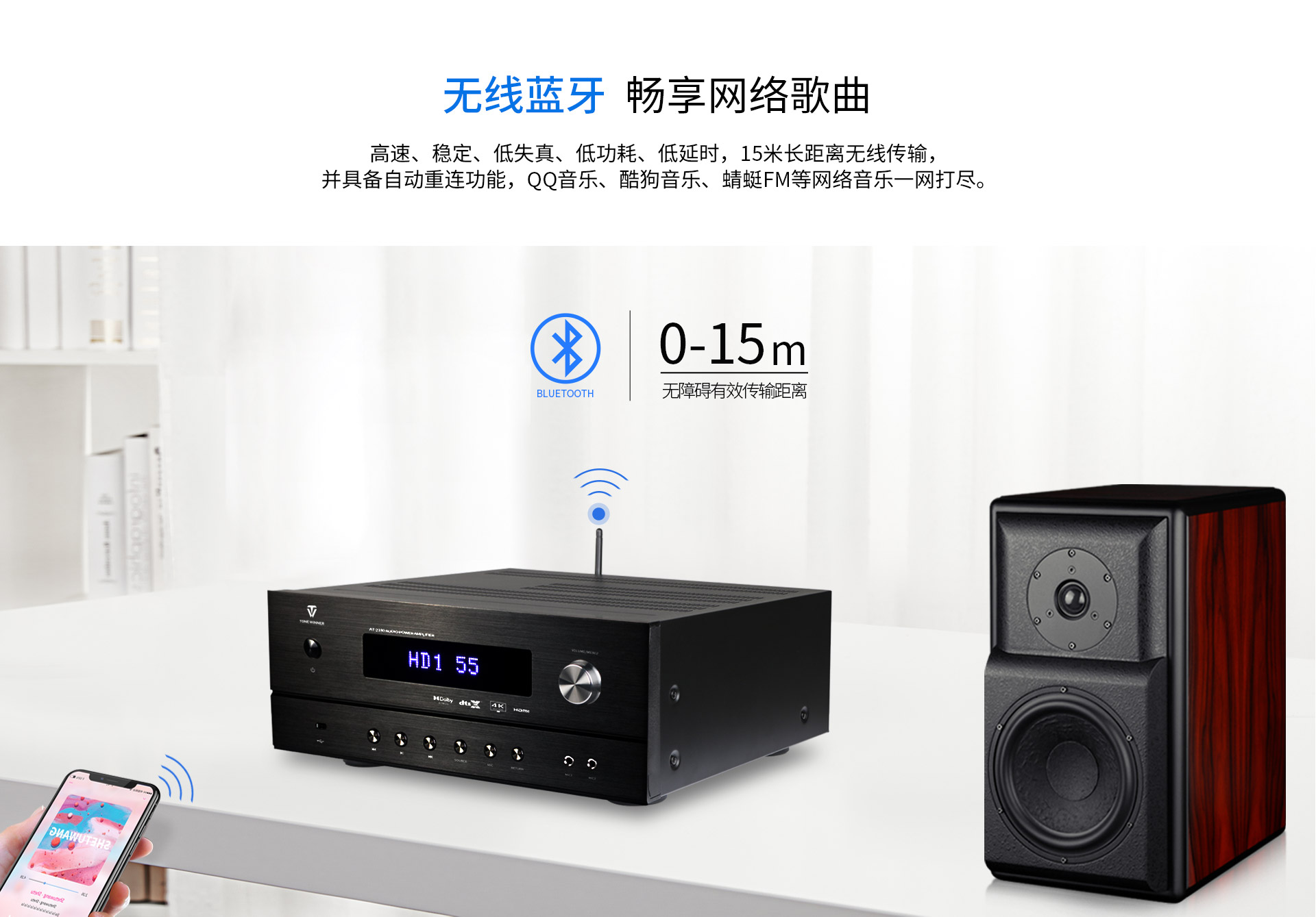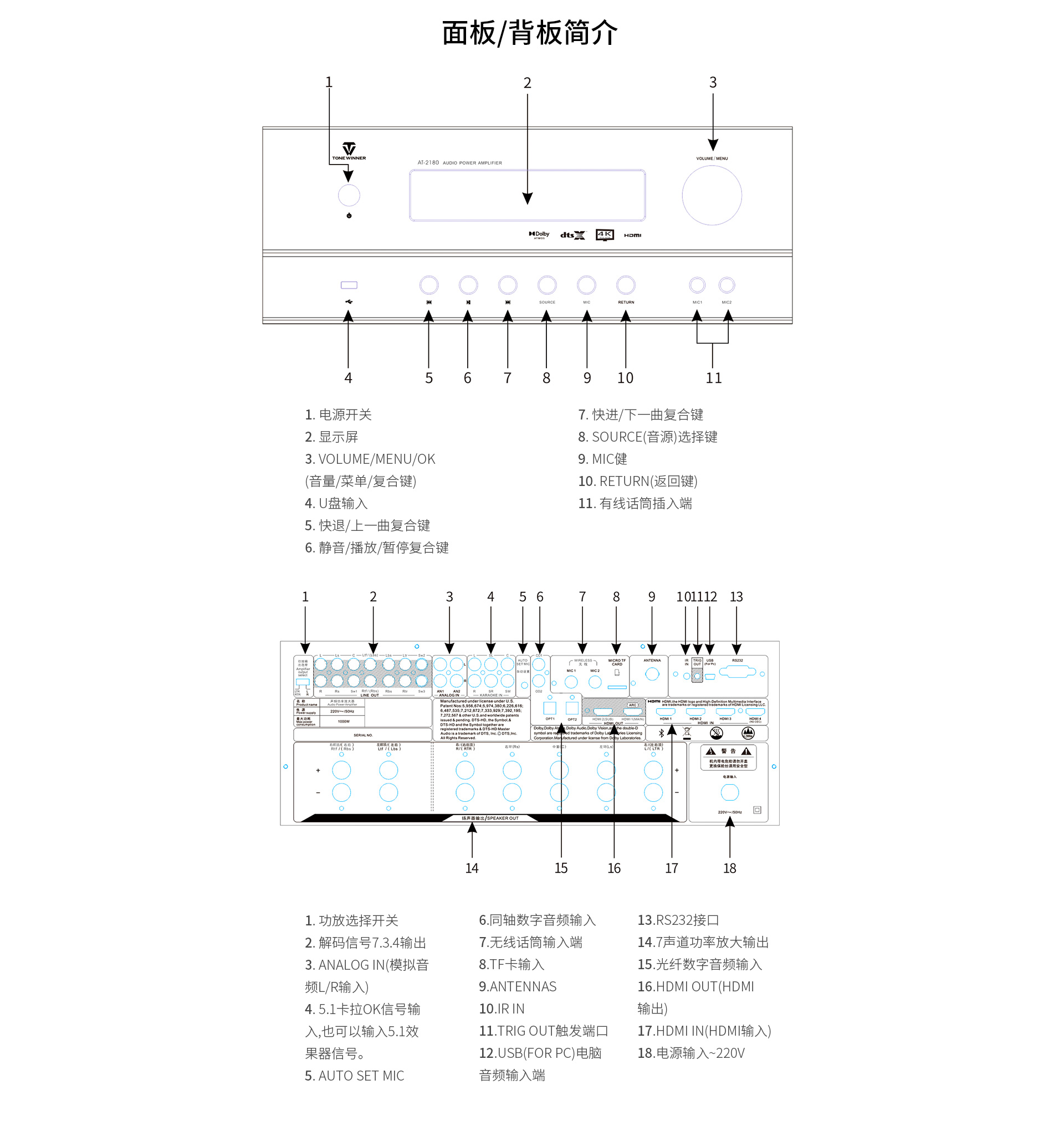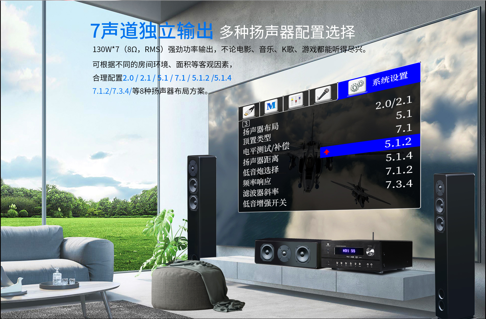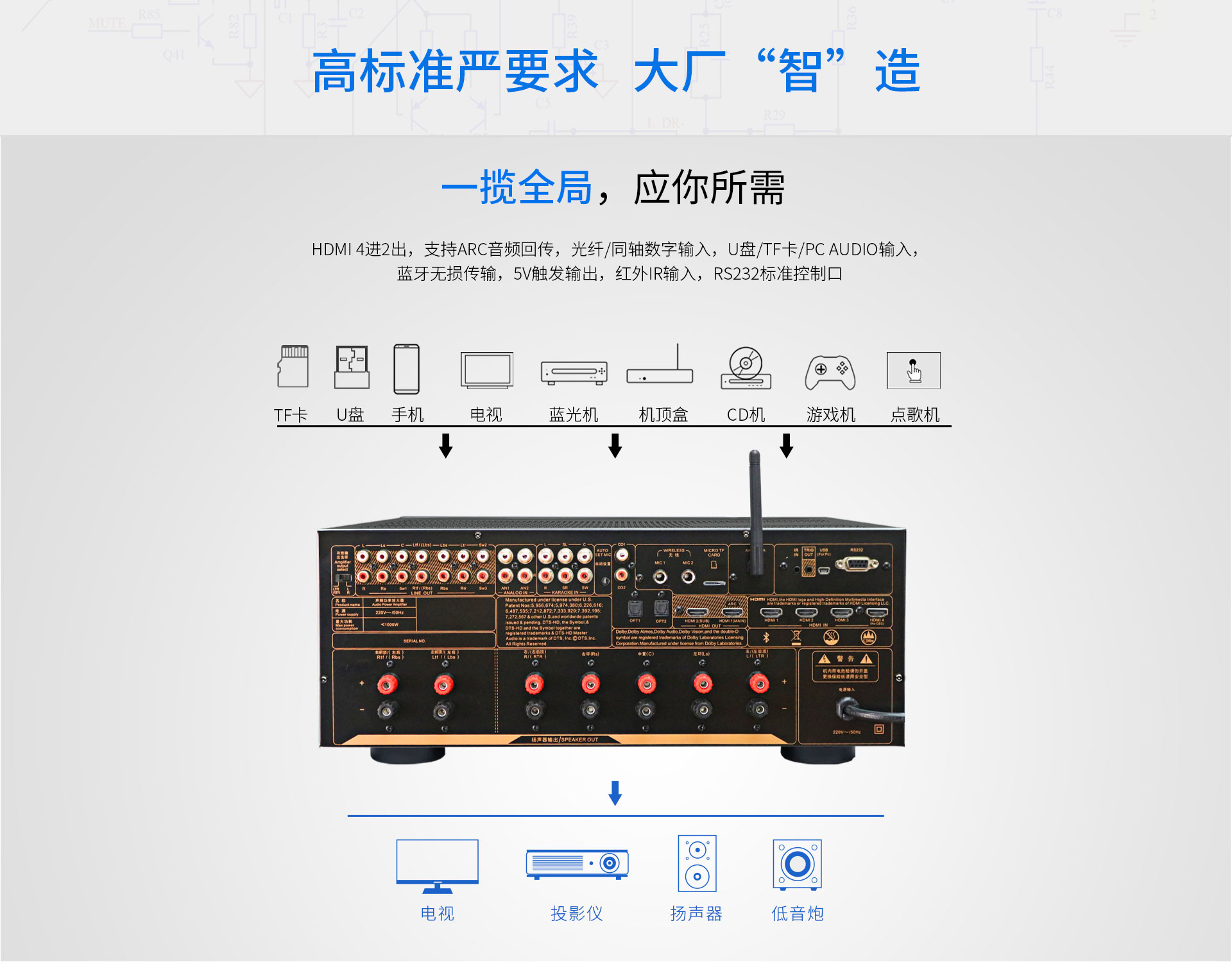 三、功能特點 1.支持Dolby Atmos、DolbyTrue-HD等所有杜比無損及有損壓縮音頻編碼文件;支持DTS:X、DTS-Master等所有DTS無損及有損壓縮音頻編碼文件。 2.支持4K/60Hz,RGB 4:4:4,18GHz全帶寬視頻信號,支持Dolby Vision及HDR 10視頻信號。 3.支持HDMI2.0,支持HDCP2.2。 4.多達14聲道的全景聲7.3.4音頻解碼線路輸出。 5.內置全景聲卡拉OK系統,強大的DSP數字混響效果及九級防嘯叫移頻處理技術,多種人聲風格選擇。 6.房間EQ、揚聲器距離、延時、聲壓的自動測試及補償,一鍵式操作,全自動校正,同時支持用戶手動調節。 7.內置藍牙數字音頻接收器。 8.內置高品質音樂播放器播放器,支持TF卡及U盤音頻文件播放,支持FLAC、APE、WAV、MP3等多種無損及有損壓縮音頻格式,支持多層文件夾管理。 9.支持手機APP操作。 10.支持全中文疊加式OSD屏幕顯示菜單。 11.支持本地音樂信息手機及電視可同步讀取顯示。 12.支持從2.0聲道到7.3.4聲道等8種揚聲器配置。 13.支持HDMI 4進2出,2組同軸2組光纖數碼音頻輸入,3組模擬音頻輸入。 14.支持5.1聲道外部混音輸入,可外掛混響器。 15.支持RS232集中控制器。 16.支持HDMI ARC音頻回傳,支持CEC控制。 17.支持高達1000ms時長的唇音同步調節。 18.每聲道多達5~11段參數EQ。 19.支持音視頻混搭編組。 20.支持按輸入源獨立設置及保存參數的功能。輸入源獨立EQ選擇,獨立卡拉OK控制。 21.支持話筒音量及音樂音量的開機設置和最大音量限制。 22.多種常用功能一鍵調用。 23.內置全球五大測試系統之一——ETQ房間聲學自動測試校正軟件。 24.支持USB-AUDIO數字信號輸入功能。 25.支持IR紅外延長功能(需額外購買紅外延長器,延長器無需獨立供電)。 26.支持5V連機觸發功能。 27.支持工程鎖機。 28.支持整機參數備份及調用。 29.支持一鍵恢復出廠設置。 30.支持用戶參數保存及調用設置。