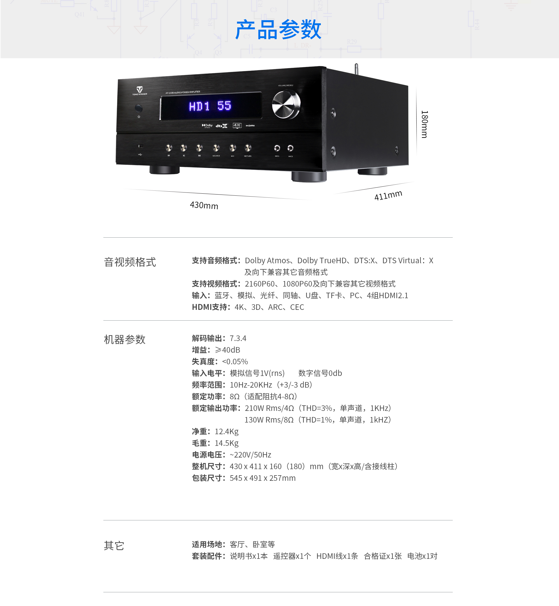 四、性能參數 解碼輸出:7.3.4 輸出功率:180W Rms/4Ω(THD=1%,單聲道,1KHZ,) 120W Rms/8Ω(THD=1%,單聲道,1KHZ,) 額定阻抗:8Ω(適配阻抗4-8Ω) 失真度:≤0.05% 增益:≥40dB 信噪比:≥90dB (A計權,模擬直通) 輸入電頻:模擬信號1V(rms) 頻率范圍:10Hz-20kHz (+3/-3dB,模擬直通) 凈重:12.4Kg 毛重:14.5Kg 電源電壓:~220V/50Hz 整機尺寸:430x411x160(180)mm(寬×深×高/含接線柱) 包裝尺寸:545x491x257mm 適用測試話筒:T-2 套裝配件:說明書x1本 遙控器x1個 HDMI線x1條 合格證x1張 電池x1對