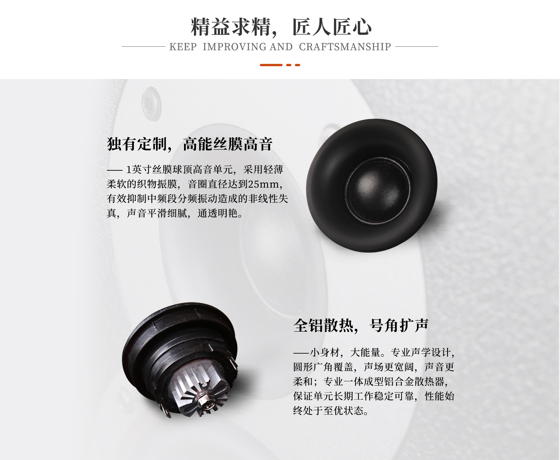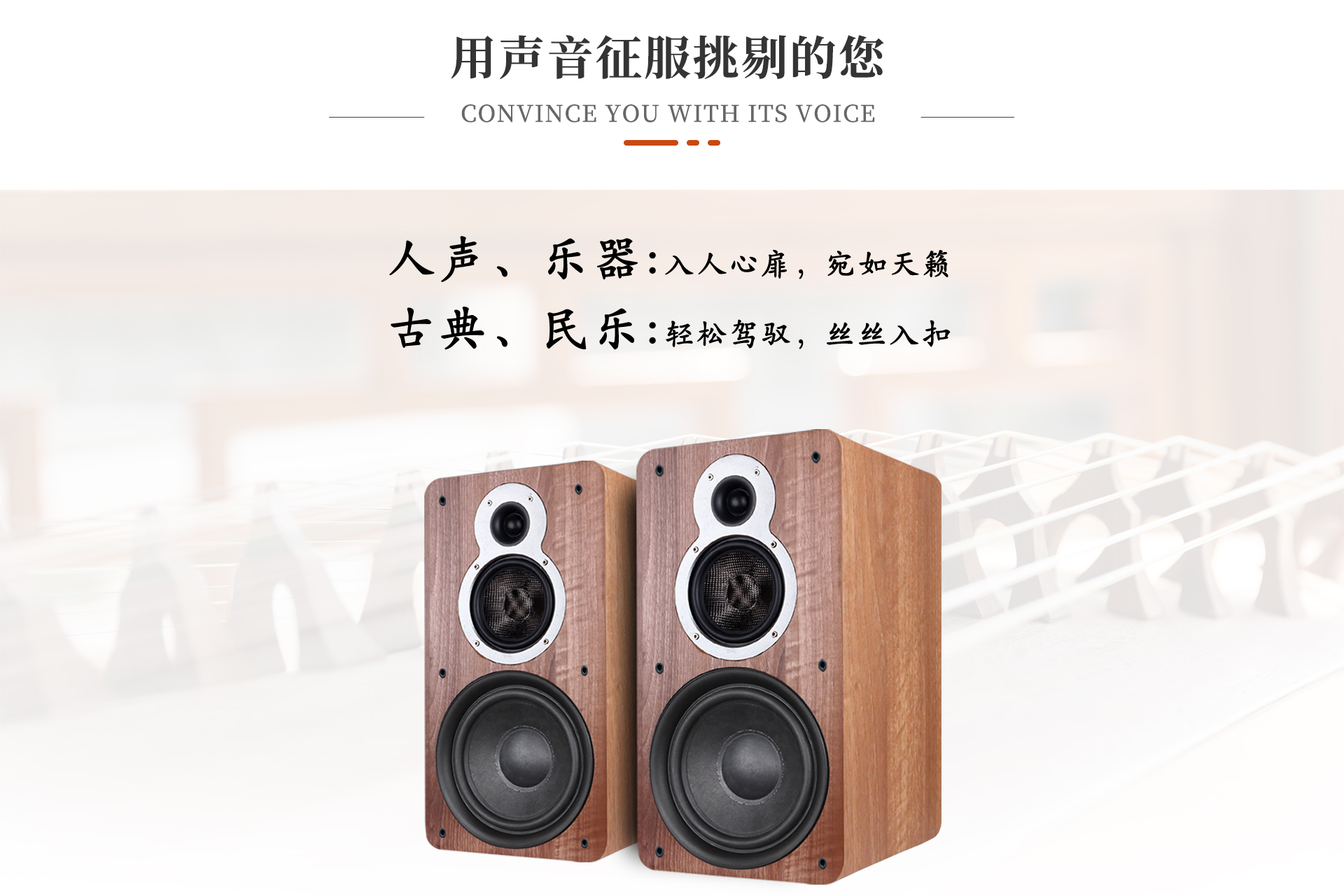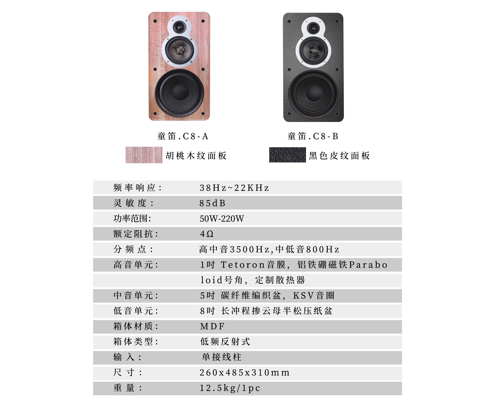 二、單元選擇 1英寸絲膜球頂高音號角單元匹配了一套釹鐵硼磁路系統(tǒng)和一體鑄造發(fā)散式鋁合金尾翼散熱器等措施來驅(qū)動強(qiáng)化功率輸出。5英寸雙層交織碳纖維中音單元,材料輕盈卻堅(jiān)固。8吋的低音單元在三分頻書架箱中極為少見,具有高品質(zhì)、長沖程、強(qiáng)永磁的特點(diǎn)。采用高強(qiáng)度、高阻尼紙盆,配合低損耗橡膠懸邊設(shè)計(jì),下潛輕松自如,彈性十足。
