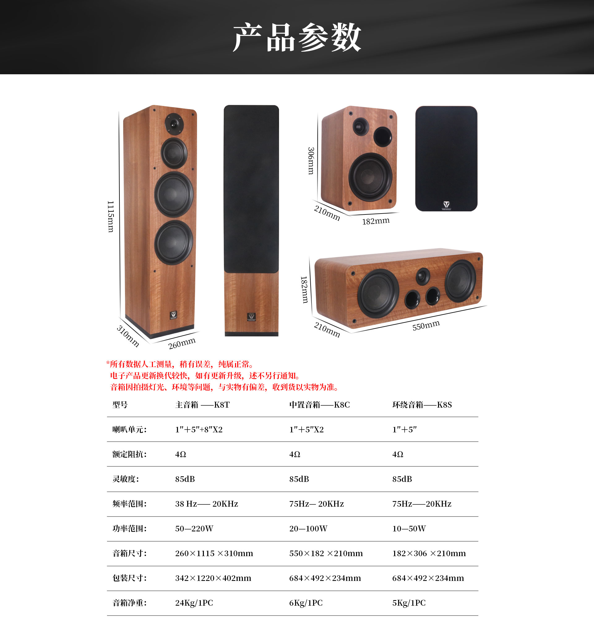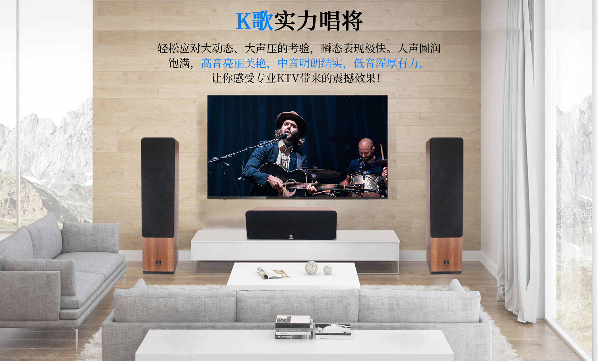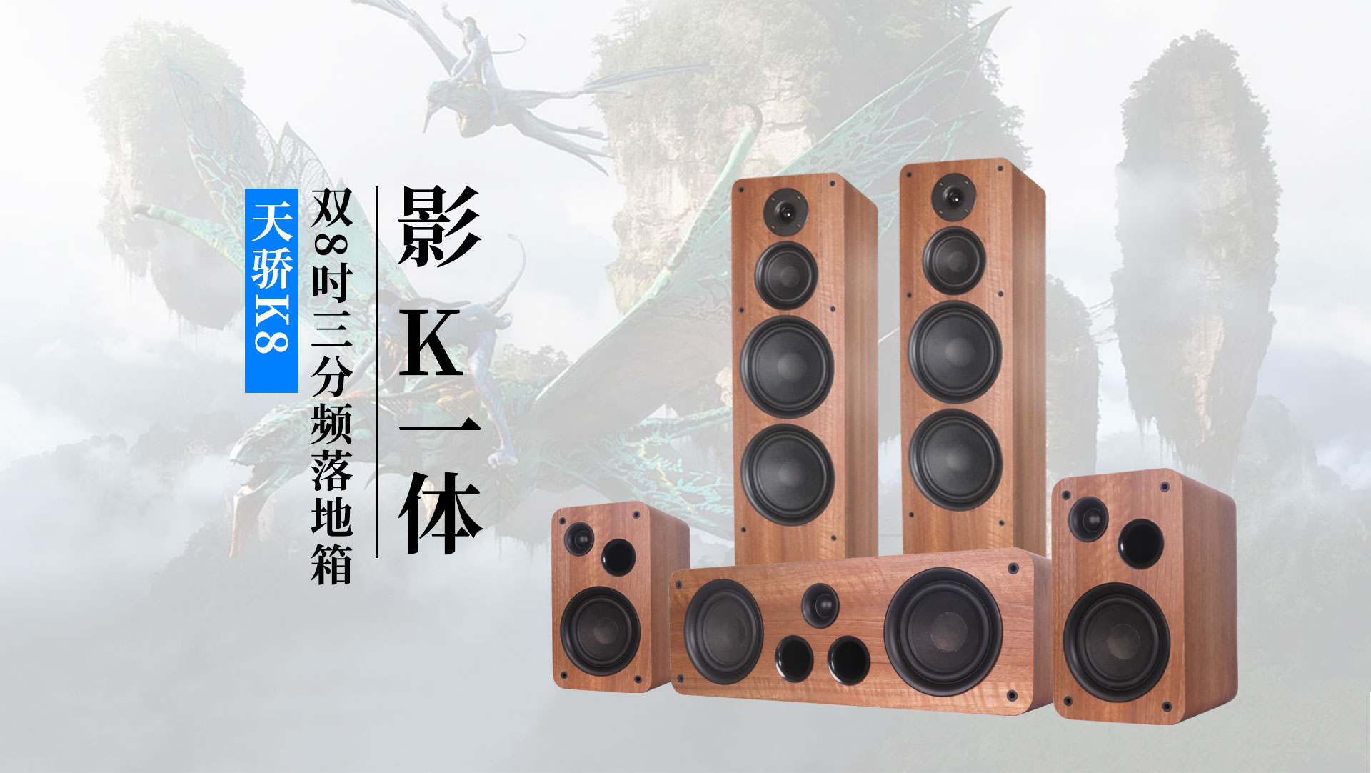 一、總體介紹 主箱采用三分頻落地箱的設計,搭配原生態植物纖維VFD高密度板材,箱體外表采用胡桃木設計,盡顯輕奢風格,輕松駕馭任何家居風格,渾然天成。 1.1吋PEI膜球頂高音單元,內置專業一體的鋁合金散熱器,保持單元工作穩定;而圓形的廣角使用了專業的聲學設計,達到拓展聲場、柔化高頻毛刺感的目的。5吋的中音單元,人聲清澈干凈,自然厚實。雙8吋的低音單元,低頻下限高,能輕松下潛38Hz,澎湃如潮; 中置音箱精選一吋絲膜球頂高音單元與兩只5吋中低音單元,人聲對白自然清晰,能量充沛,觀影過程中的聲場表現層次分明,聲畫合一。 而環繞音箱同樣發揮出色,構造三維一體的立體環繞聲場必不可少。它能精準地還原每一個細節,打造出層次分明、定位準確、臨場感十足的聲場表現,輕松沉醉在電影故事當中。 天驕K8以時尚簡約的外表與嶄新功能表現,絕對是現代家庭娛樂的不二之選。無論是在大動態電影的槍林彈雨、山崩海嘯,還是K歌時的大聲壓、靚人聲,都能輕松駕馭。