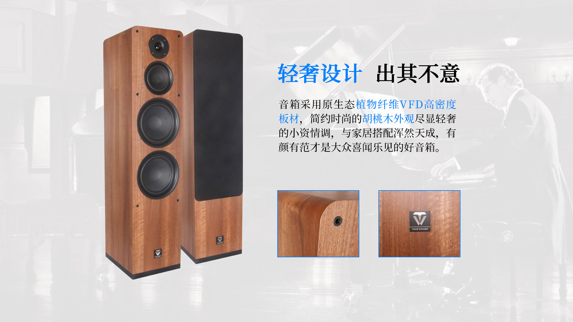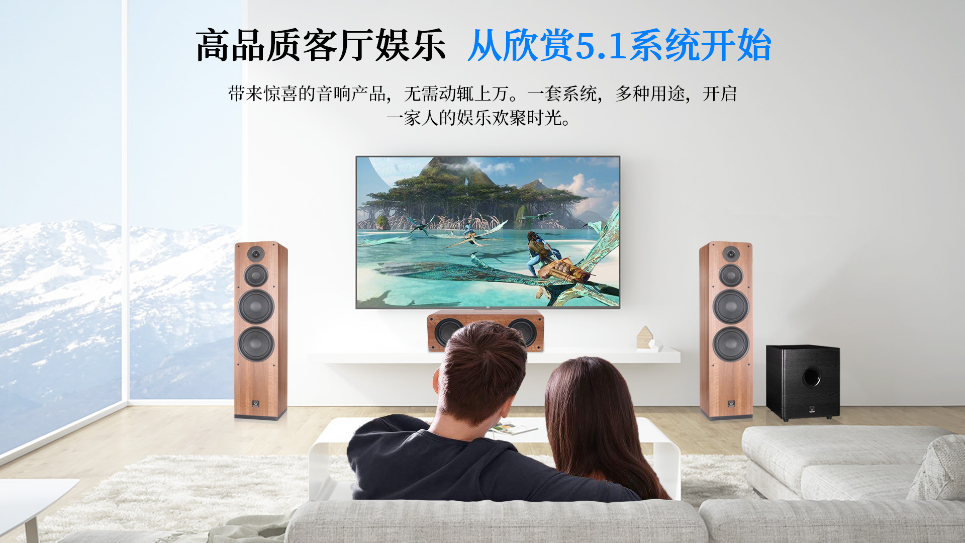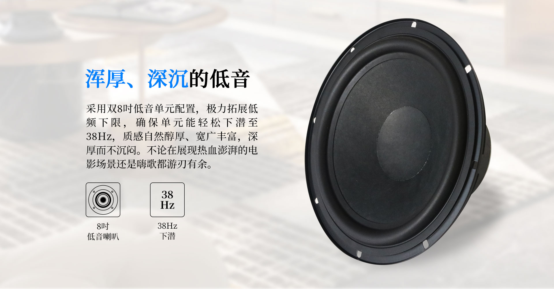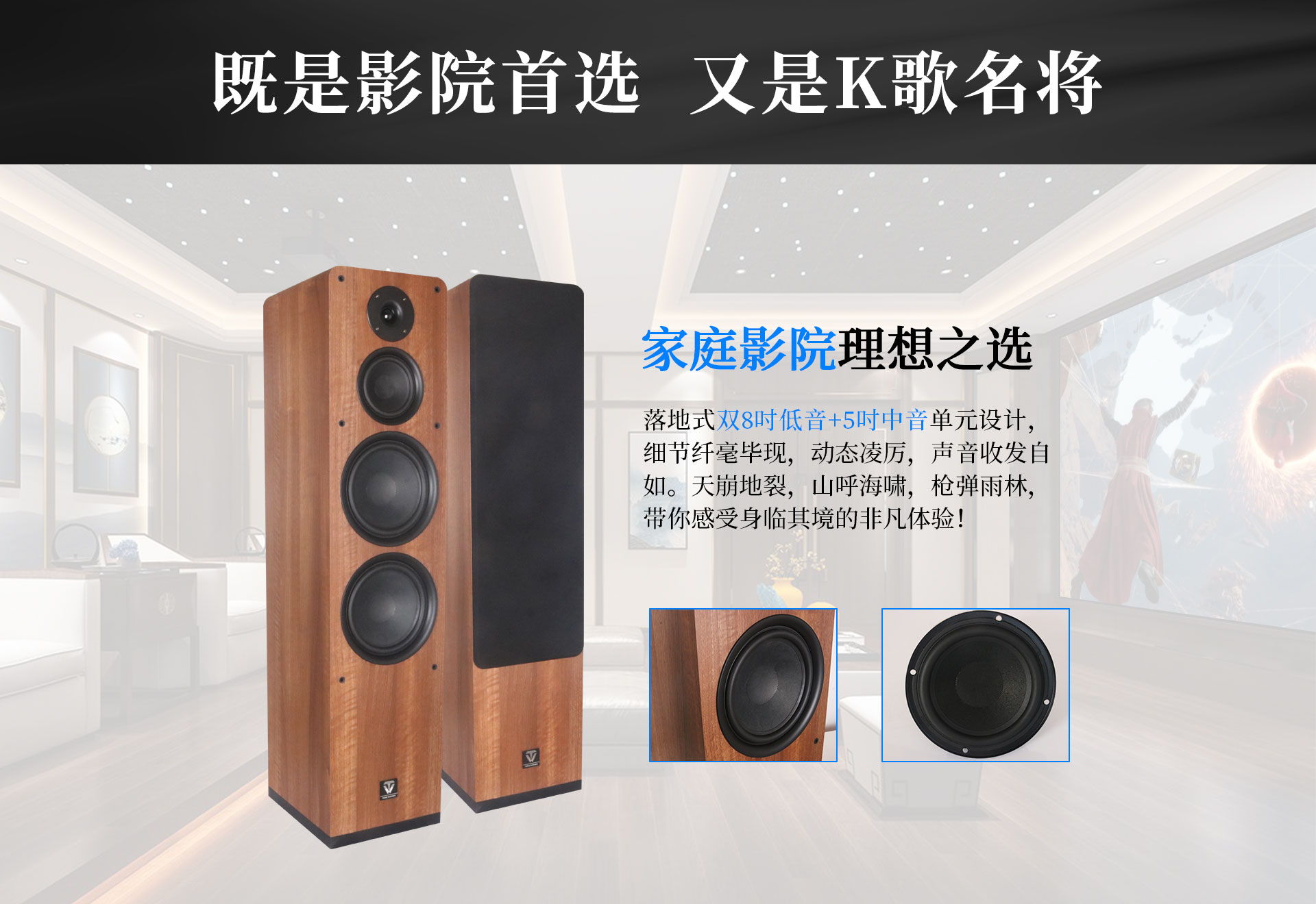一、總體介紹 主箱采用三分頻落地箱的設計,搭配原生態植物纖維VFD高密度板材,箱體外表采用胡桃木設計,盡顯輕奢風格,輕松駕馭任何家居風格,渾然天成。 1.1吋PEI膜球頂高音單元,內置專業一體的鋁合金散熱器,保持單元工作穩定;而圓形的廣角使用了專業的聲學設計,達到拓展聲場、柔化高頻毛刺感的目的。5吋的中音單元,人聲清澈干凈,自然厚實。雙8吋的低音單元,低頻下限高,能輕松下潛38Hz,澎湃如潮; 中置音箱精選一吋絲膜球頂高音單元與兩只5吋中低音單元,人聲對白自然清晰,能量充沛,觀影過程中的聲場表現層次分明,聲畫合一。 而環繞音箱同樣發揮出色,構造三維一體的立體環繞聲場必不可少。它能精準地還原每一個細節,打造出層次分明、定位準確、臨場感十足的聲場表現,輕松沉醉在電影故事當中。 天驕K8以時尚簡約的外表與嶄新功能表現,絕對是現代家庭娛樂的不二之選。無論是在大動態電影的槍林彈雨、山崩海嘯,還是K歌時的大聲壓、靚人聲,都能輕松駕馭。