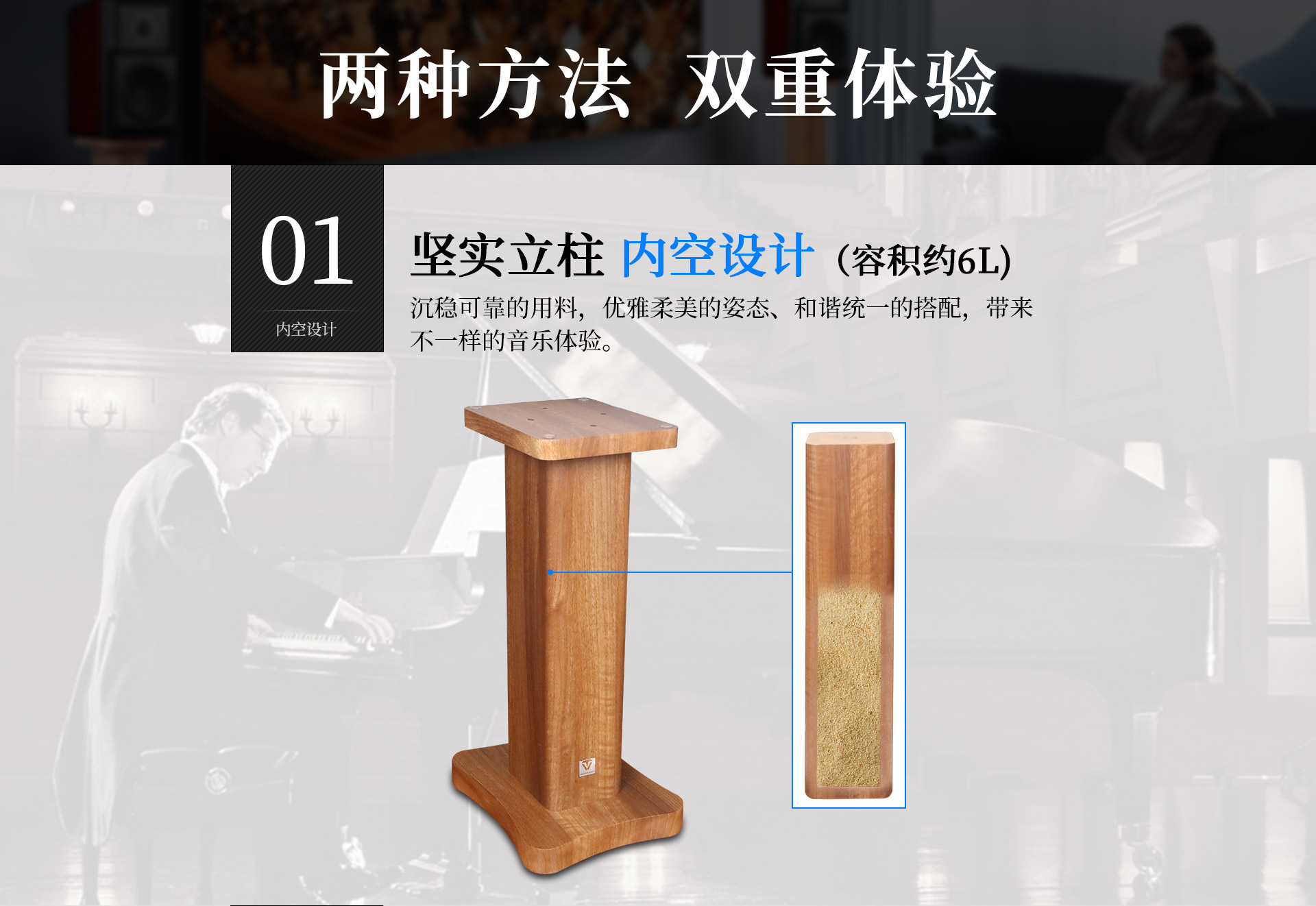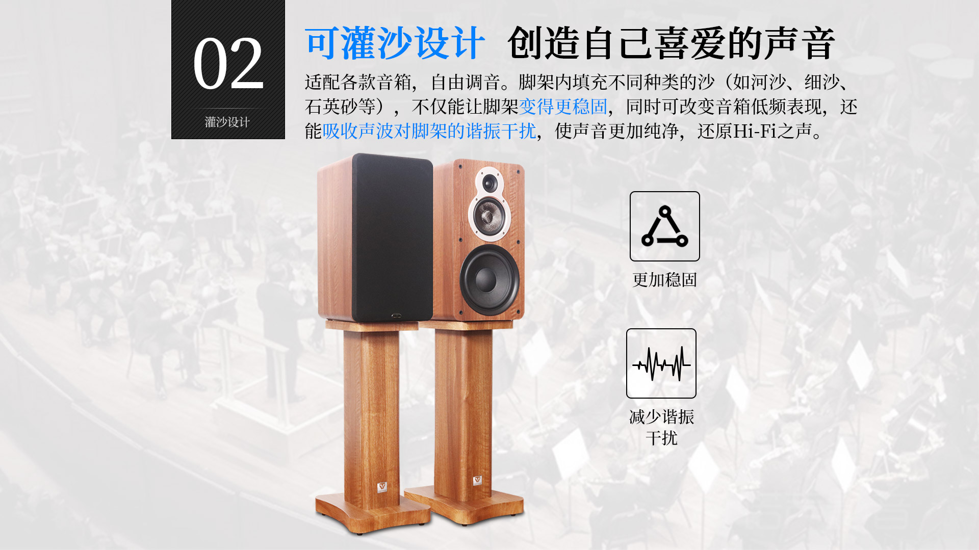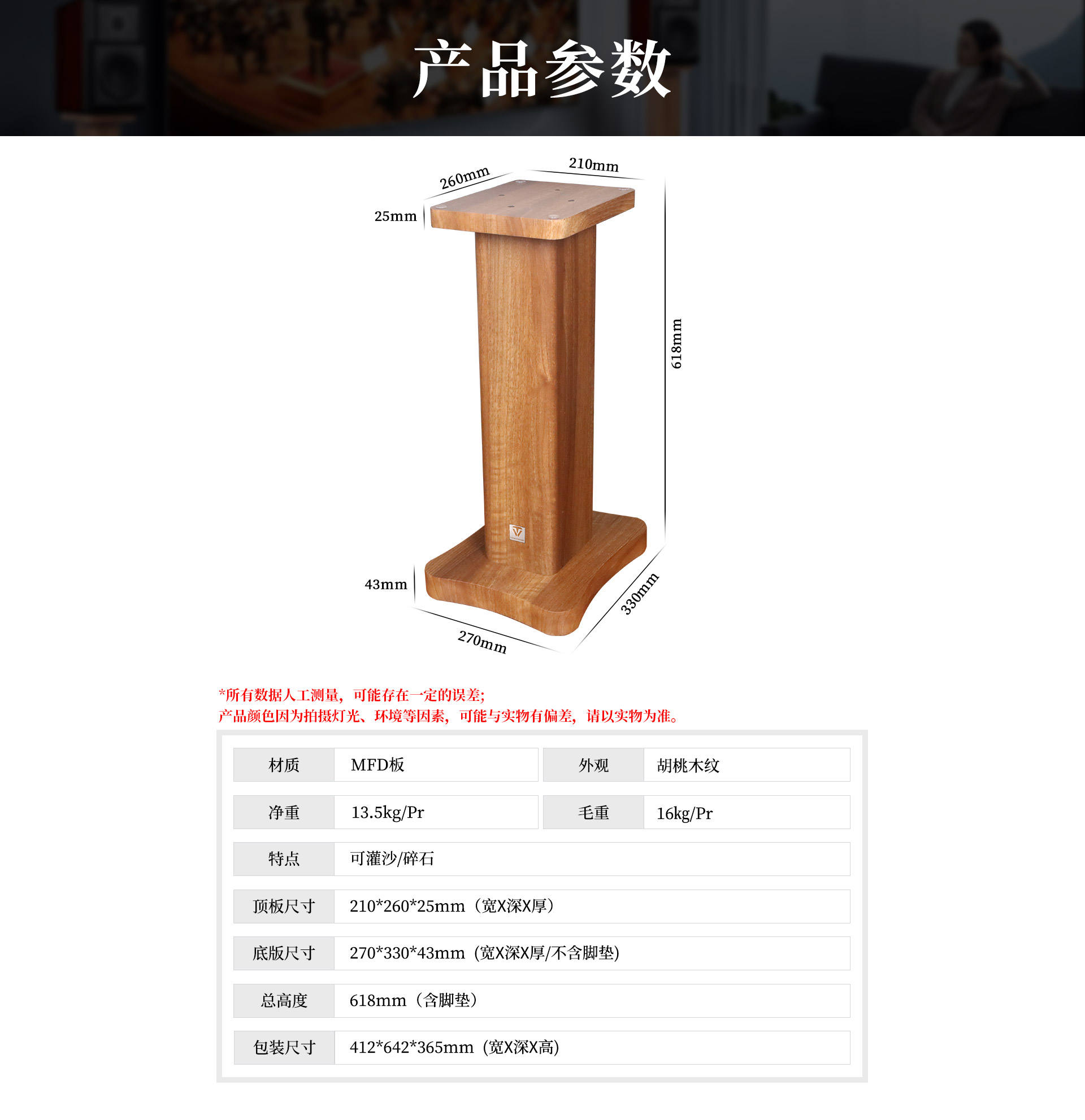 一、總體特點 1. 胡桃木紋外觀,設計簡約,優雅時尚,與家居百搭,彰顯高端品味。 2. 采用MDF加厚板材,其頂板厚達25mm,底板更是厚達43mm,堅固耐用,穩重大氣。 3. 空心立柱可通過灌入干燥的沙來增加重量。不僅能讓腳架變得更加穩固,也可以有效地干涉音箱與腳架的總體諧振狀況。同時,可以根據灌沙的總量創作出自己喜歡的聲音,亦使聲音更加純凈,還原最真實的Hi-Fi之聲。 4. 618mm黃金比例腳架總高度,視覺上極具美感,更是聽覺上的盛宴。 5. 精確計算的高度能與大多數書架音箱配合,使其高音單元與聽眾坐下后的耳朵高度基本保持同一水平。通過合理的高度及擺放方式,能讓聽眾獲得美好的聽音感受,呈現更多音樂細節。 6. 四顆高彈柔性防滑墊位于頂板上方,既能有效減少低頻共振,也能防止因低頻震動導致的音箱移位甚至跌落損壞。 7. 四只加厚減震機腳,能有效降低音箱諧振,起到柔化音質,提升音頻質感的作用;同時也有效避免地面潮濕對腳架造成損壞。 8. 安裝簡單快速,只需三步就能享受高保真Hi-Fi音樂。 9. 適用于多種場景,如:客廳、書房、臥室,選擇擺位靈活多樣。