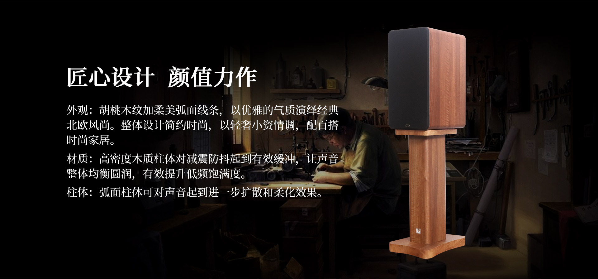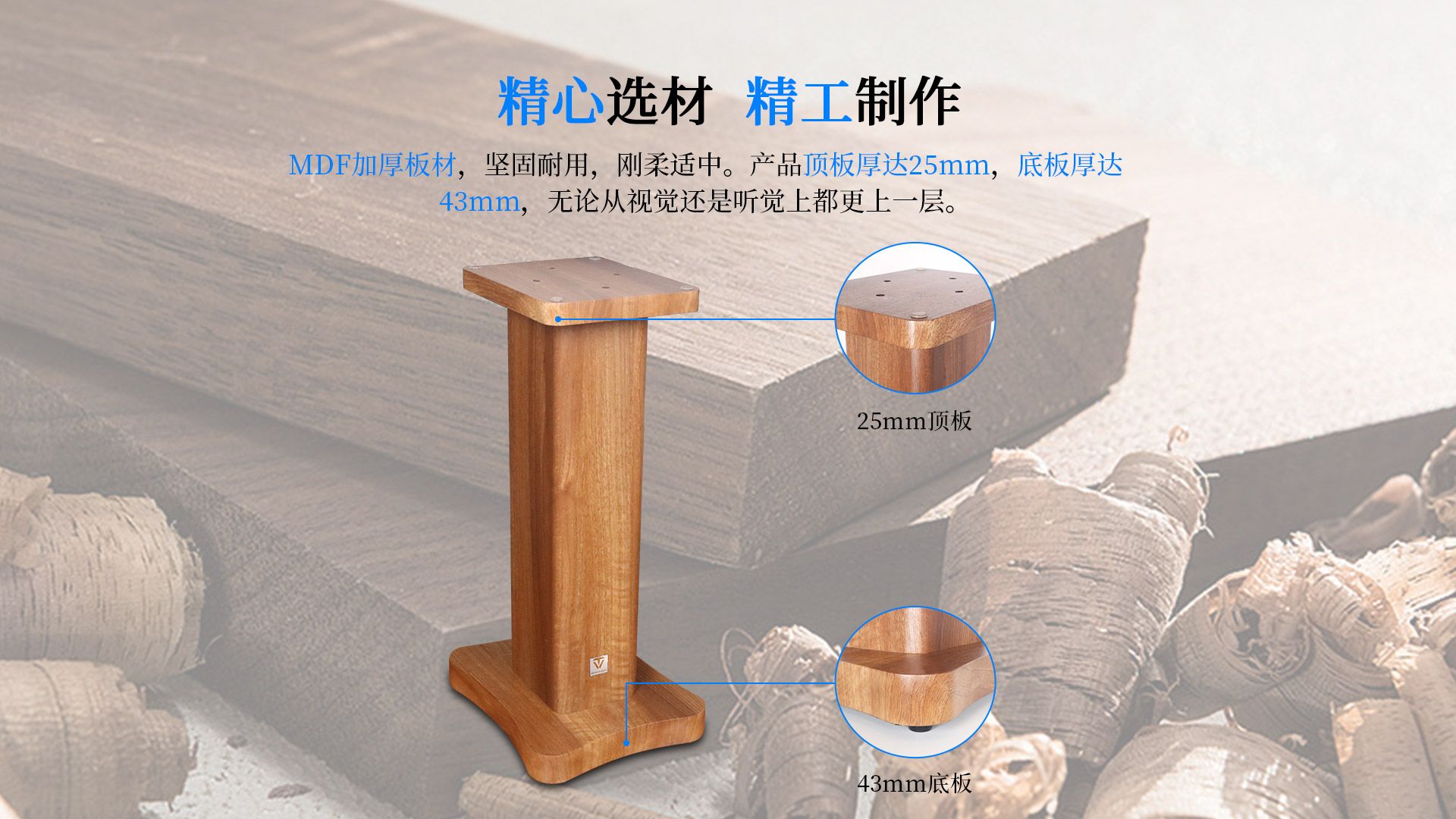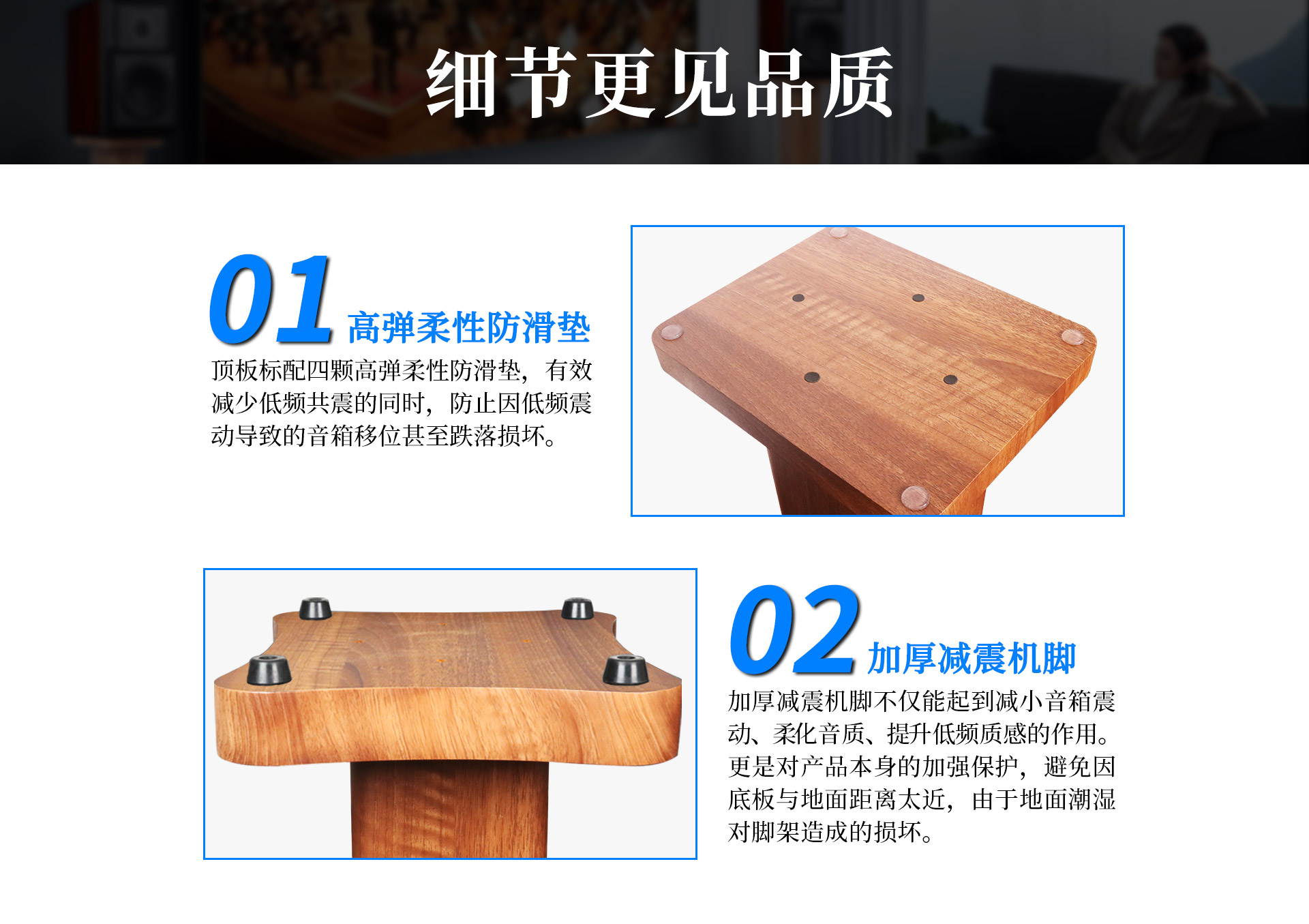 一、總體特點 1. 胡桃木紋外觀,設計簡約,優雅時尚,與家居百搭,彰顯高端品味。 2. 采用MDF加厚板材,其頂板厚達25mm,底板更是厚達43mm,堅固耐用,穩重大氣。 3. 空心立柱可通過灌入干燥的沙來增加重量。不僅能讓腳架變得更加穩固,也可以有效地干涉音箱與腳架的總體諧振狀況。同時,可以根據灌沙的總量創作出自己喜歡的聲音,亦使聲音更加純凈,還原最真實的Hi-Fi之聲。 4. 618mm黃金比例腳架總高度,視覺上極具美感,更是聽覺上的盛宴。 5. 精確計算的高度能與大多數書架音箱配合,使其高音單元與聽眾坐下后的耳朵高度基本保持同一水平。通過合理的高度及擺放方式,能讓聽眾獲得美好的聽音感受,呈現更多音樂細節。 6. 四顆高彈柔性防滑墊位于頂板上方,既能有效減少低頻共振,也能防止因低頻震動導致的音箱移位甚至跌落損壞。 7. 四只加厚減震機腳,能有效降低音箱諧振,起到柔化音質,提升音頻質感的作用;同時也有效避免地面潮濕對腳架造成損壞。 8. 安裝簡單快速,只需三步就能享受高保真Hi-Fi音樂。 9. 適用于多種場景,如:客廳、書房、臥室,選擇擺位靈活多樣。