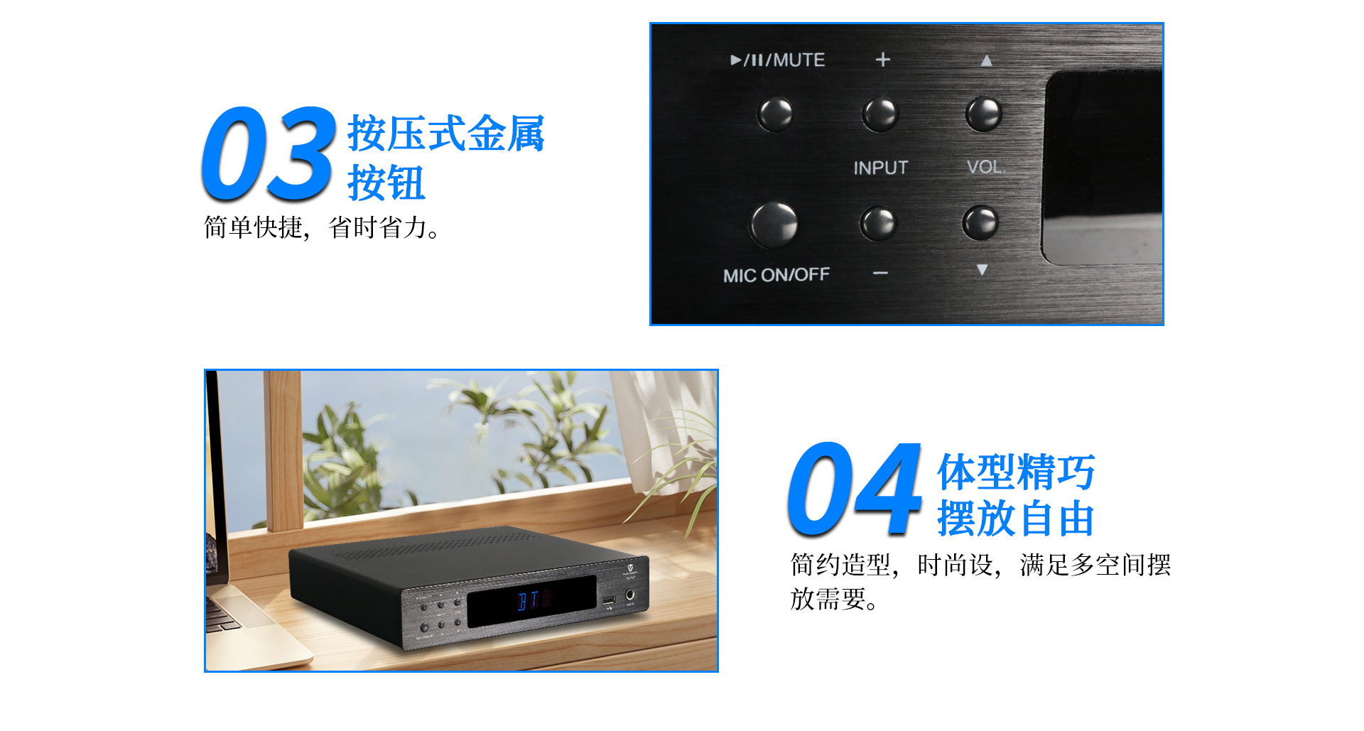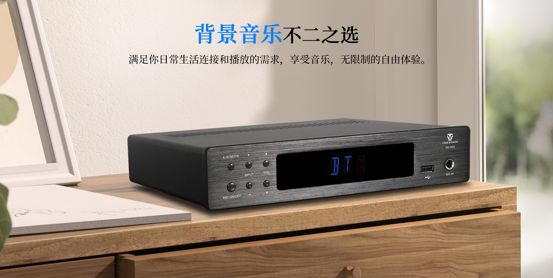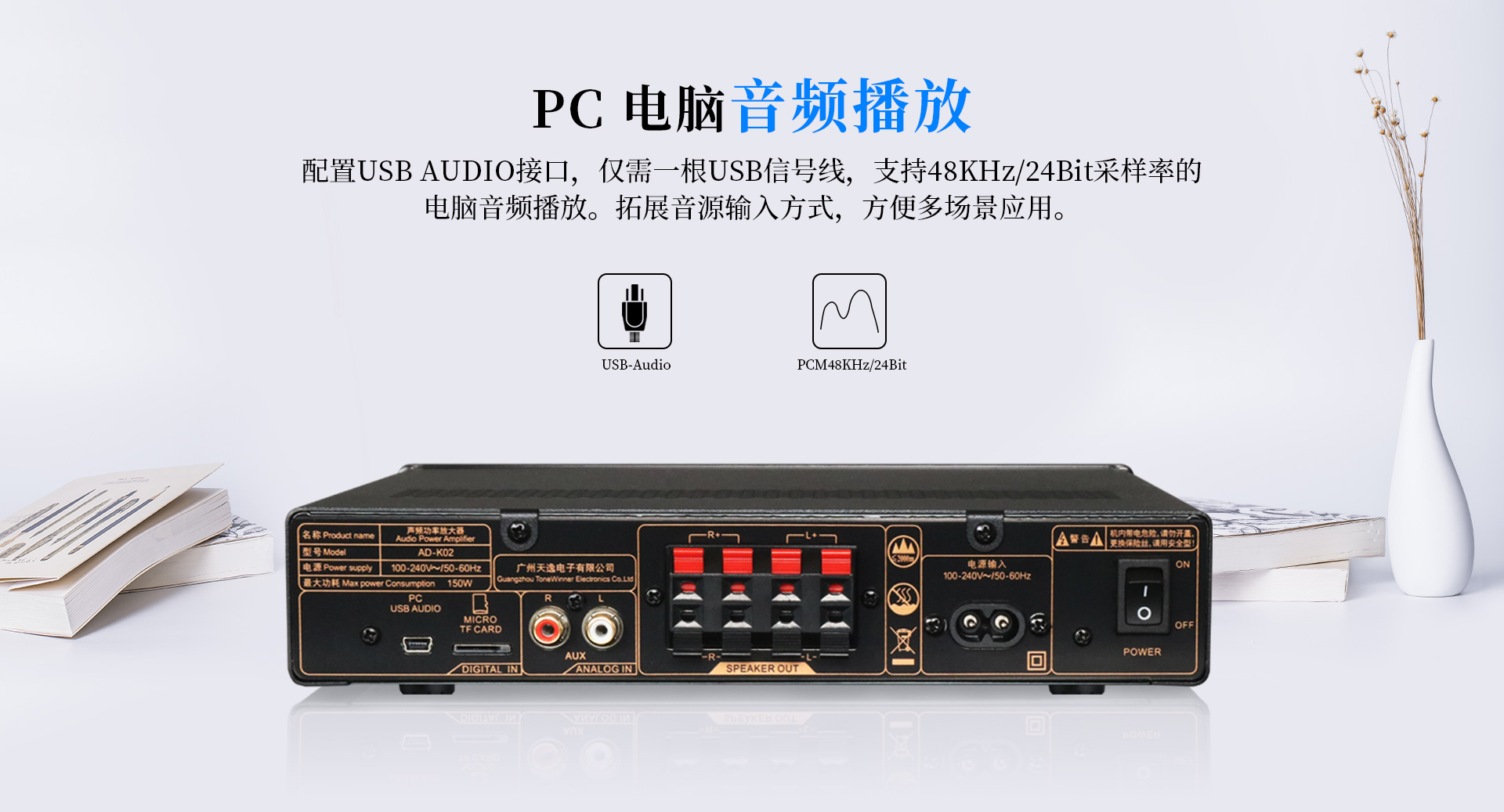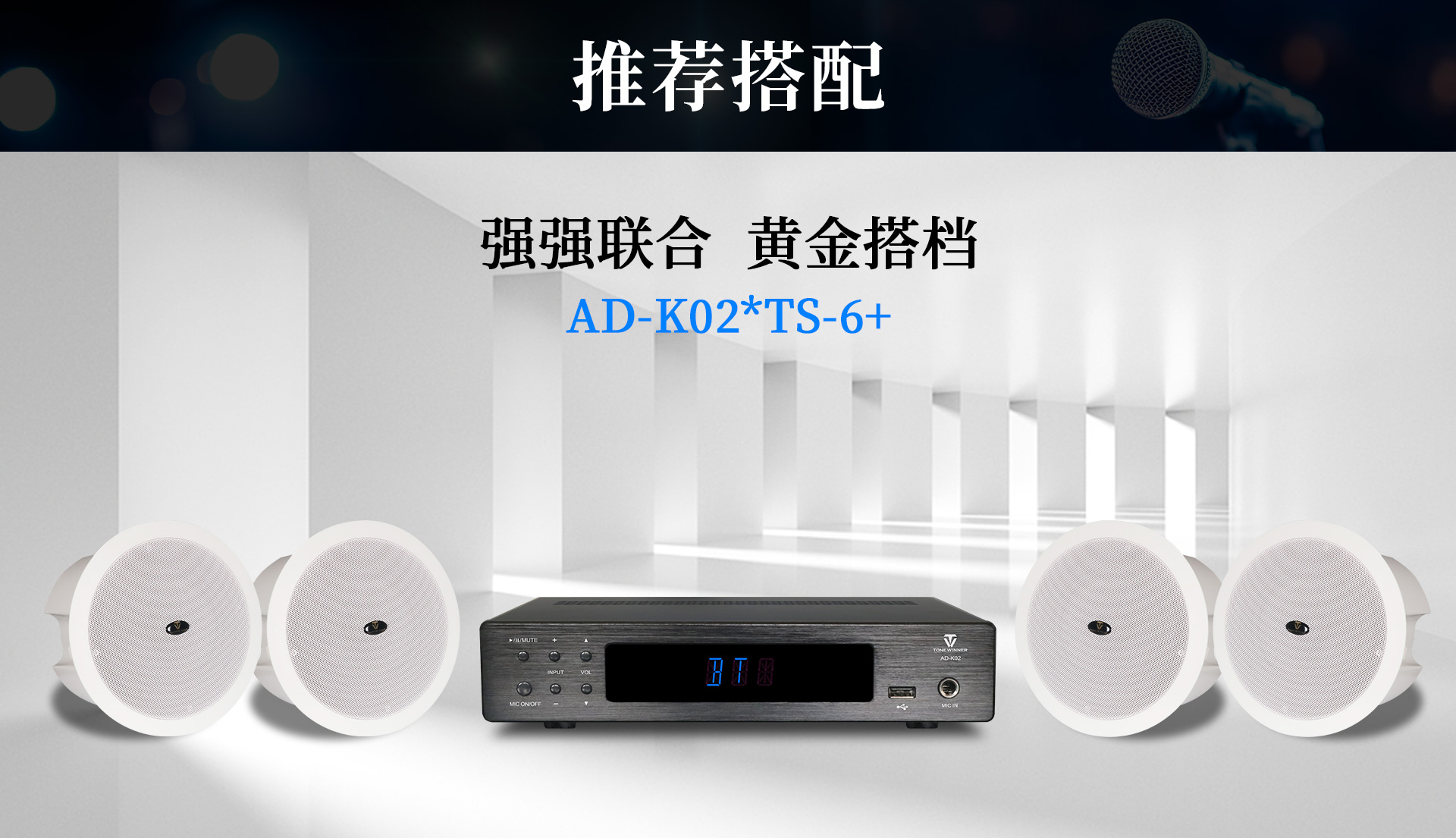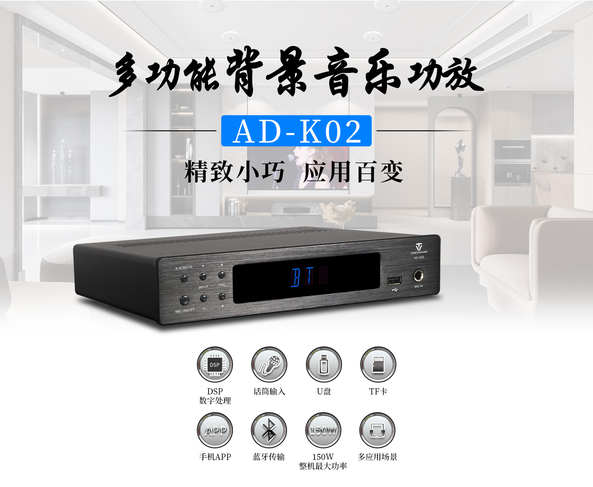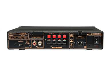 一、功能特點 1.支持128G U盤/TF卡本地播放,可播放APE、FLAC、WAV等高品質無損音樂,多場合享受音樂的高保真之美; 2.支持藍牙無線傳輸,高速、穩定、低失真、低功耗,15米長距離無線傳輸; 3.支持天逸專屬APP連接,使用便捷,APP可查看接入設備歌曲信息,支持切歌、一鍵收藏; 4.配置電腦USB AUDIO音頻輸入,支持48KHz/24Bit的采樣率; 5.獨立的話筒接口,有線與無線話筒皆能接入; 6.五重星級安全保護,保證不同環境下穩定工作; 7.支持4路功率輸出,最大輸出功率達到150W; 8.背板喇叭輸出接口可支持接駁4只揚聲器; 9.采用高效D類電源及天逸專利電源管理技術,適應全球通用的100-240V寬電壓設計; 10.內置DSP能修正不理想的頻率響應,有效改善音色,使得三頻均衡。 11.廣泛適用于多種商業、家居場合;例如客廳、賣場、會議室等。