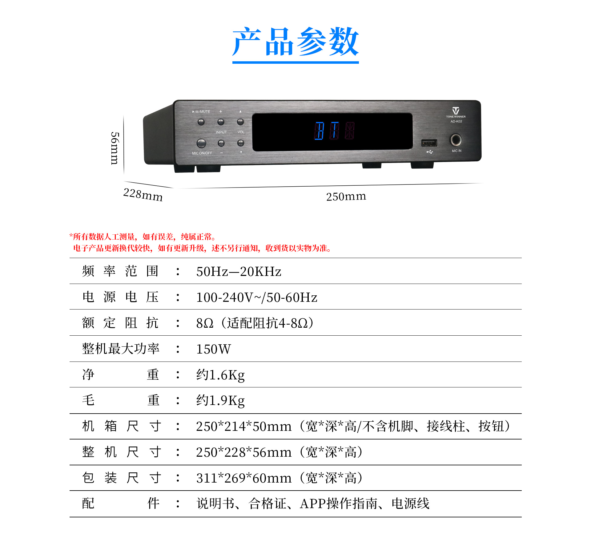 二、性能參數 頻率范圍:50Hz-20KHz 電源電壓:100-240V~/50-60Hz 額定阻抗:8Ω (適配阻抗4-8Ω) 最大功率:150W 凈重:約1.6Kg 毛重:約1.9Kg 機箱尺寸:250*214*50mm(寬*深*高/不含機腳、接線柱、按鈕) 整機尺寸:250*228*56mm(寬*深*高) 包裝尺寸:311*269*60mm(寬*深*高)