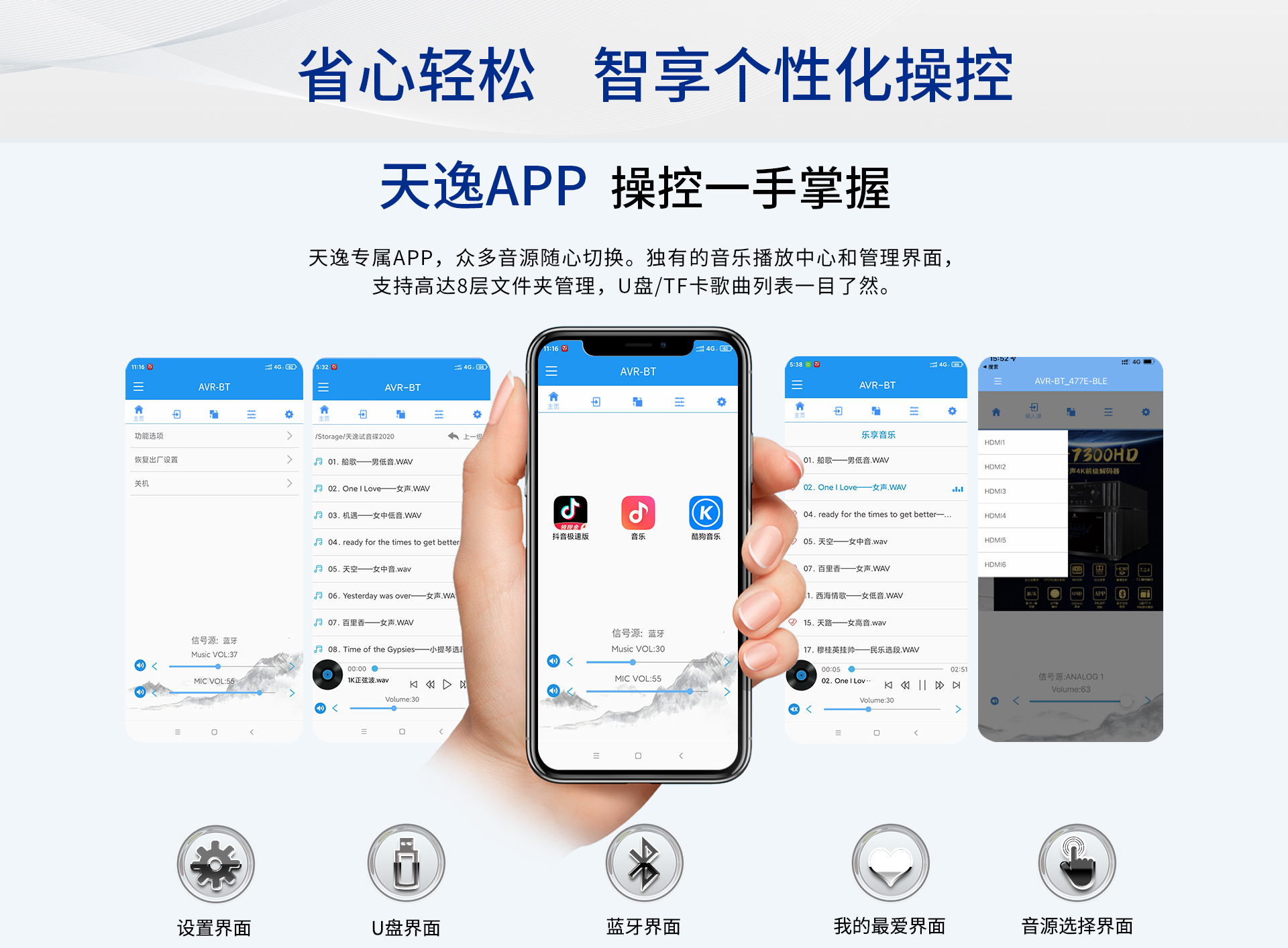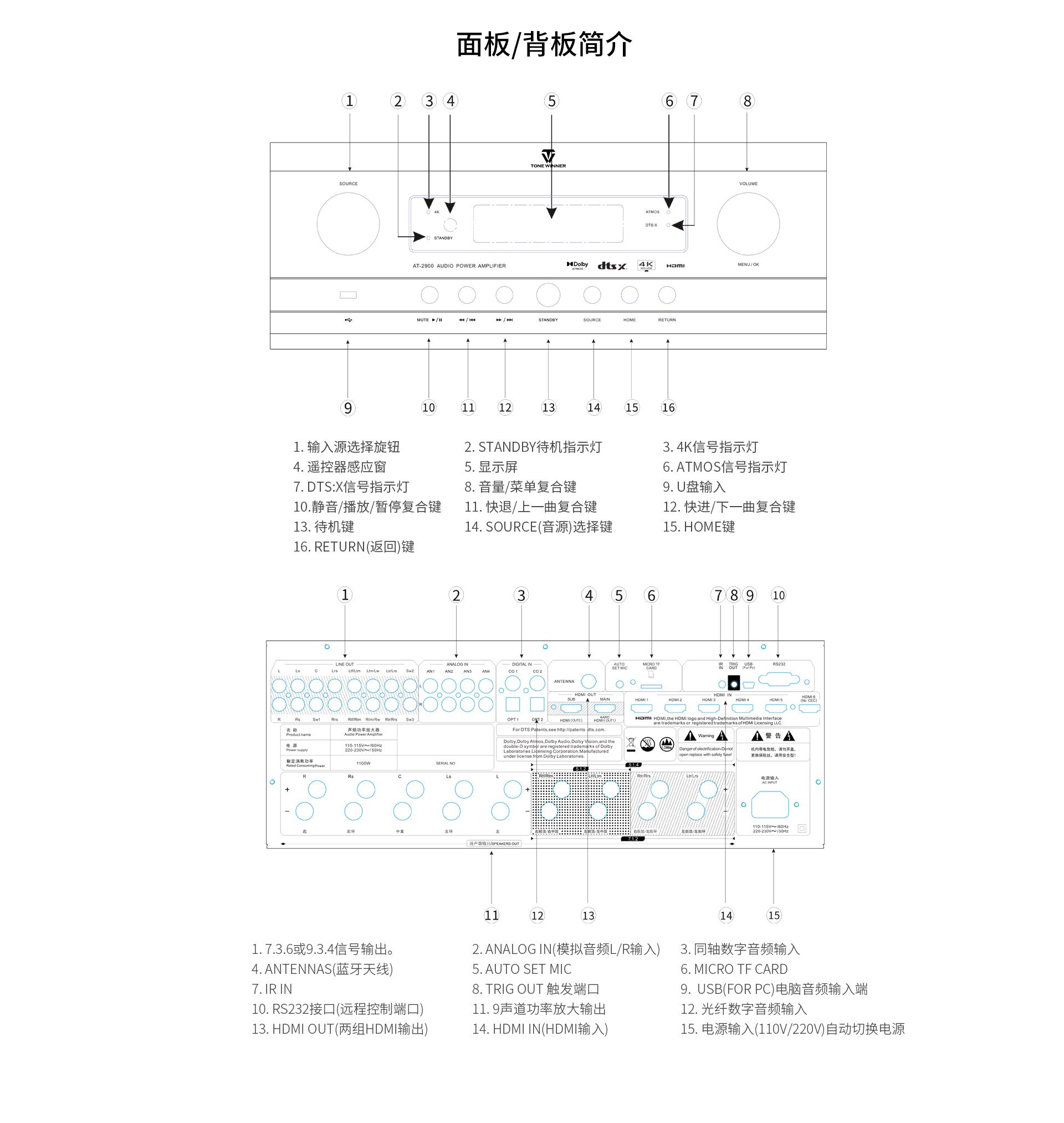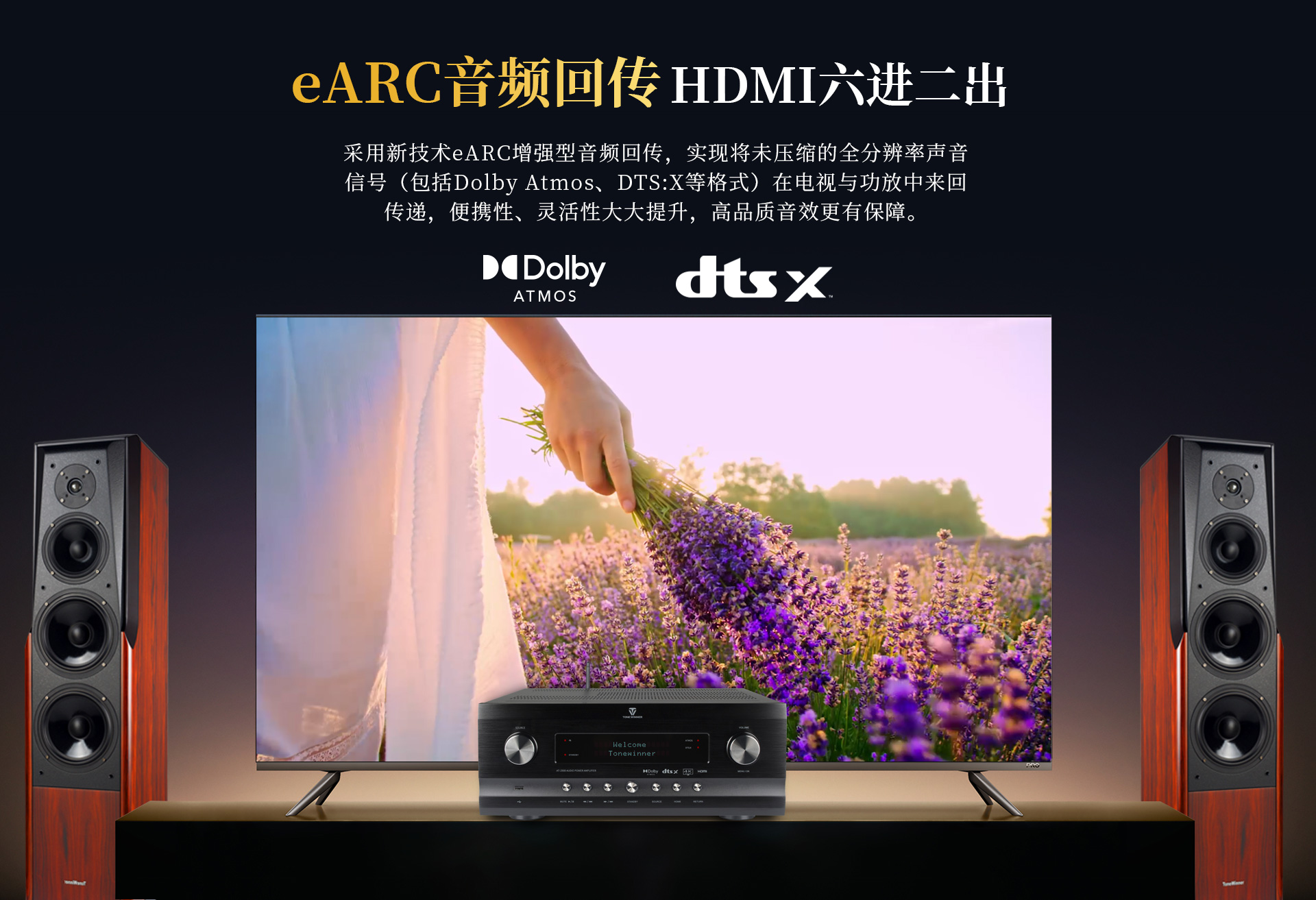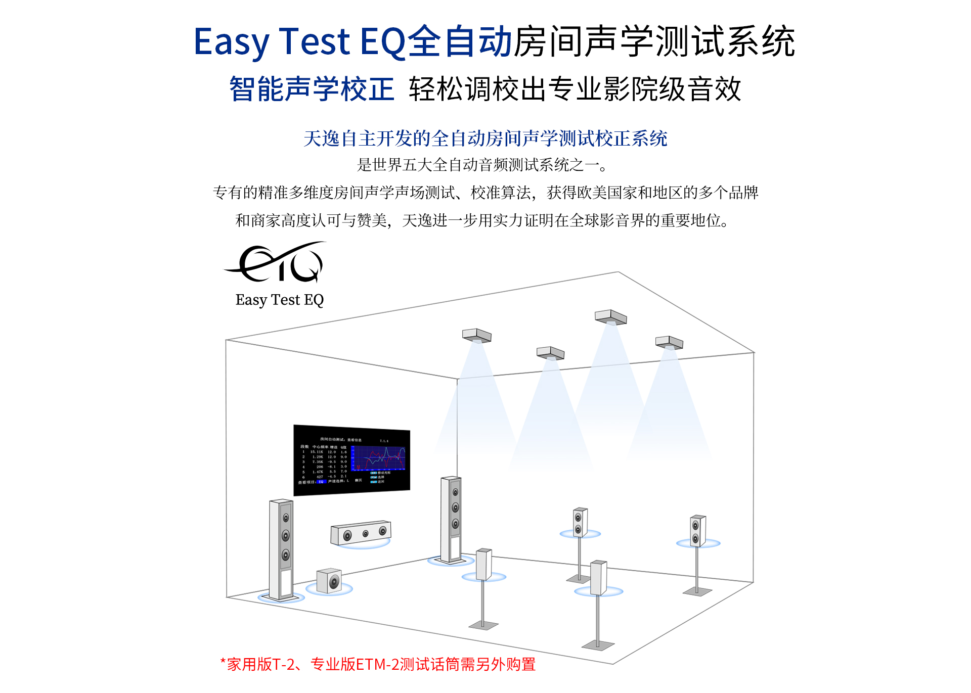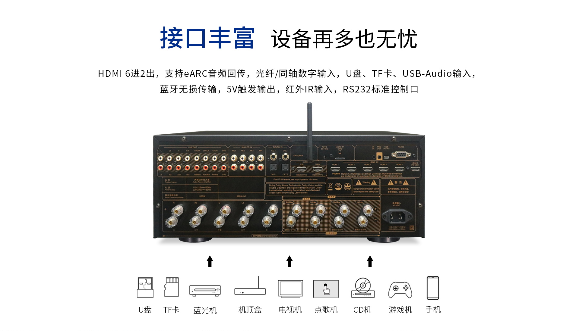 15.支持HDMI 6進2出,2組同軸2組光纖數字音頻輸入,4組模擬音頻輸入; 17.支持RS232智能控制連接; 18、內置全球五大測試系統之——ETQ房間聲學自動測試校正軟件