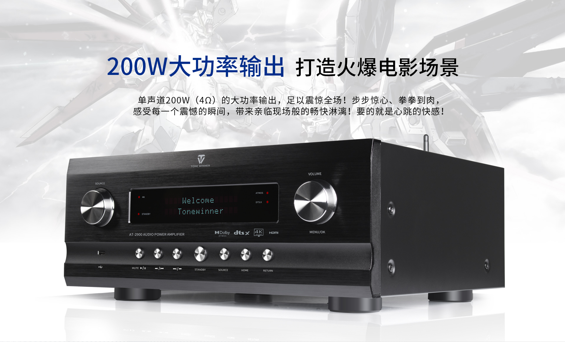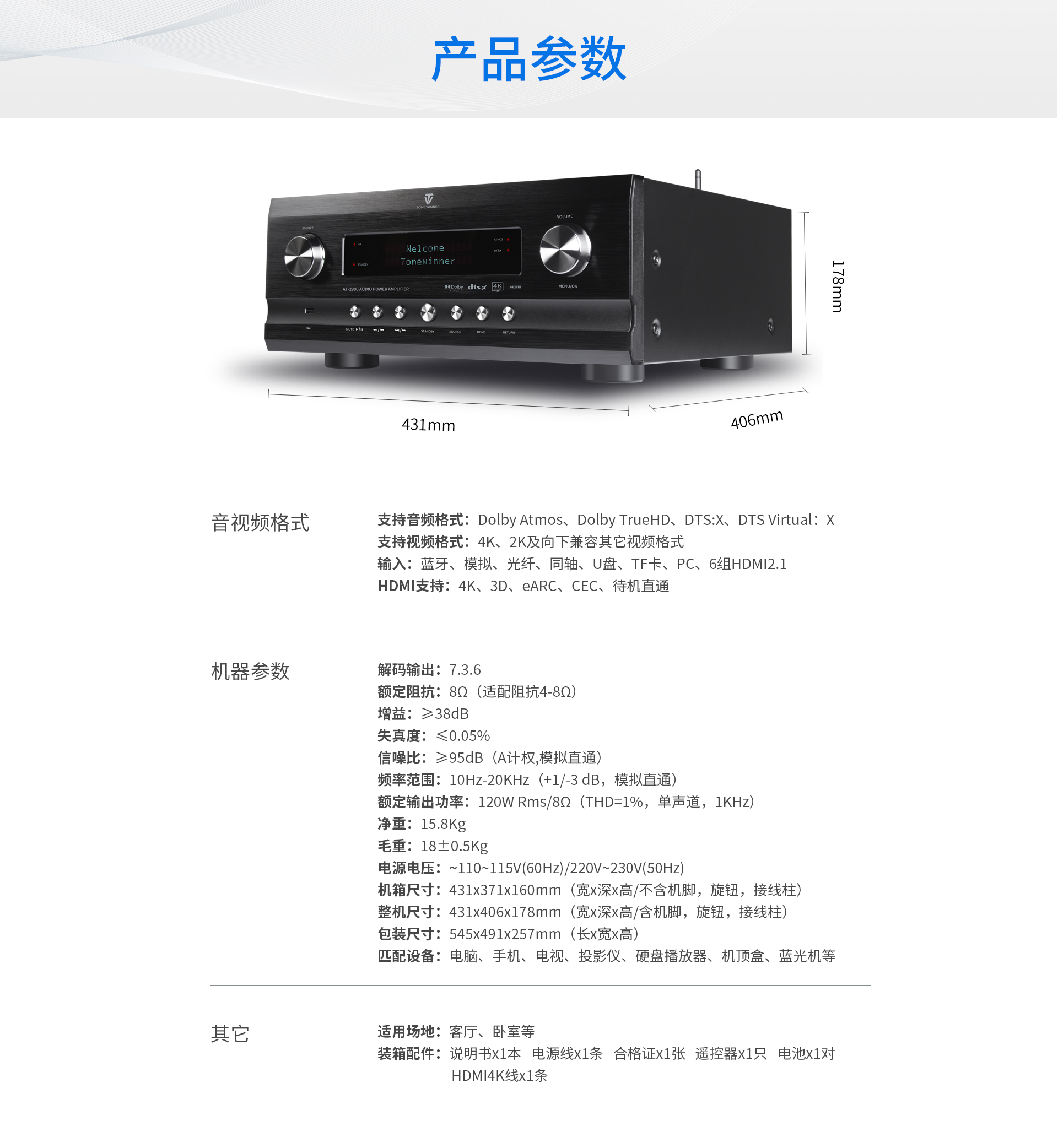 二、性能參數 解碼輸出:7.3.6 額定阻抗:8Ω(適配阻抗4-8Ω) 增益:≥38dB 失真度:≤0.05% 信噪比:≥95dB(A計權,模擬直通) 頻率范圍:10Hz-20KHz (+1/-3 dB,模擬直通) 額定輸出功率:200W Rms/4Ω (THD=1%,單聲道,1KHz);120W Rms /8Ω (THD=1%,單聲道,1KHz) 凈重:15.8Kg 毛重:18±0.5Kg 電源電壓:~110~115V(60Hz)/220V~230V(50Hz) 機箱尺寸:431×371×160mm (寬×深×高/不含機腳,旋鈕,接線柱) 整機尺寸:431×406×178mm (寬×深×高/含機腳,旋鈕,接線柱) 包裝尺寸:545×491×257mm (長×寬×高)