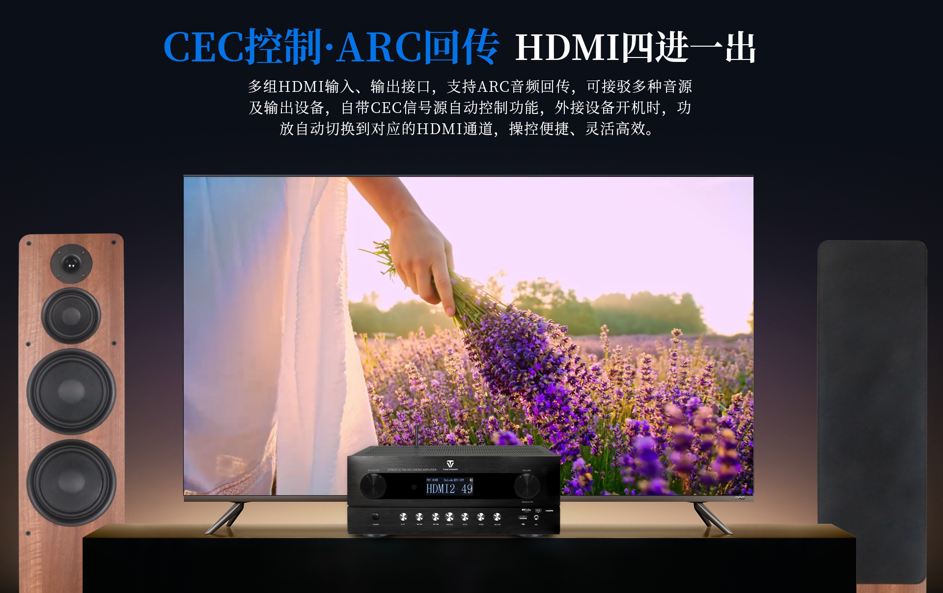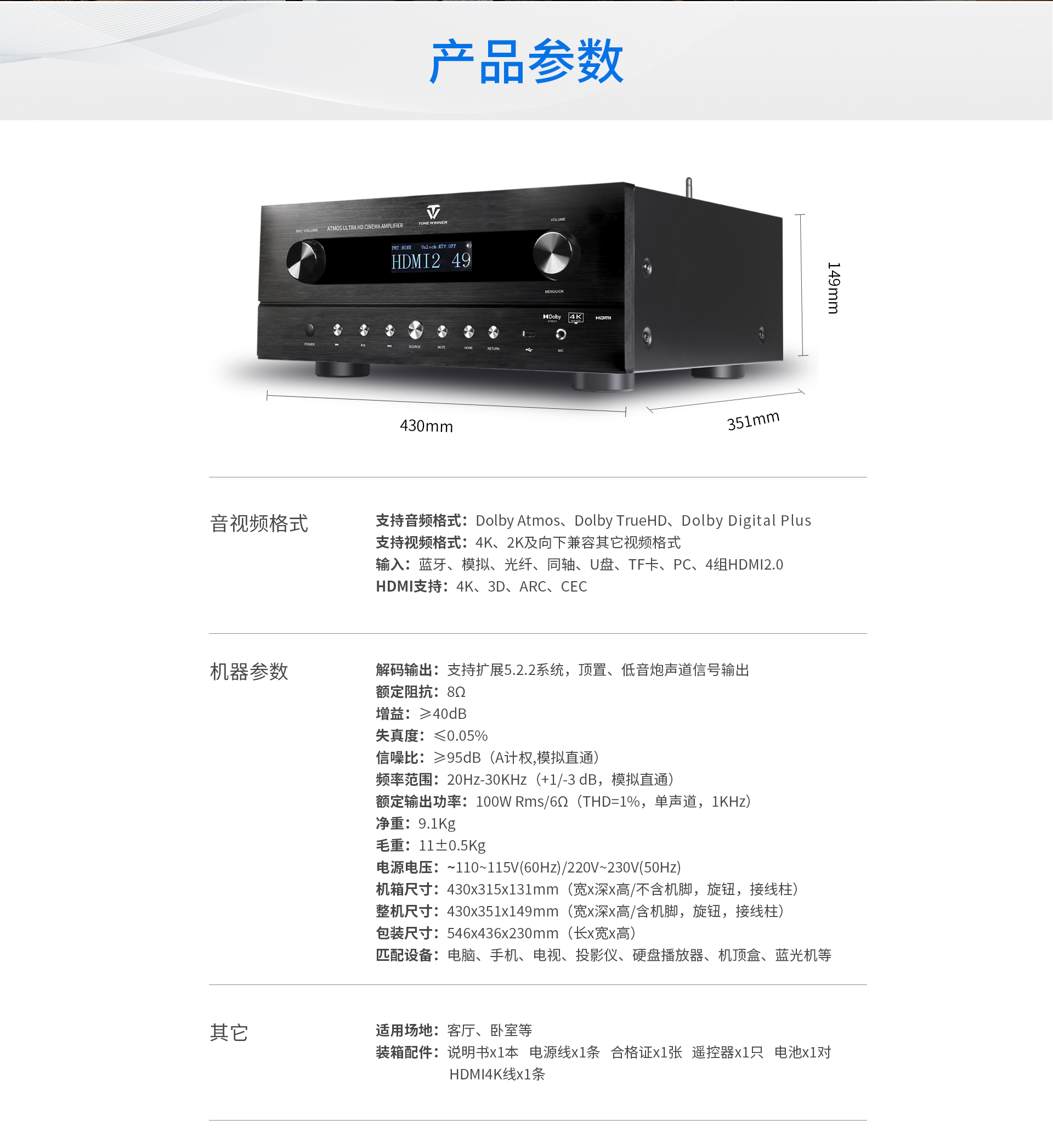 三、性能參數 解碼輸出:5.2.2 額定阻抗:8Ω 增益:≥40dB 失真度:≤0.05% 信噪比:≥95dB (A計權,模擬直通) 頻率范圍:20Hz-30KHz (+1/-3 dB,模擬直通) 額定輸出功率:100W Rms/6Ω (THD=1%,單聲道,1KHz) 凈重:9.1Kg 毛重:11±0.5Kg 電源電壓:~110~115V(60Hz)/220V~230V(50Hz) 機箱尺寸:430×315×131mm (寬×深×高/不含機腳,旋鈕,接線柱) 整機尺寸:430×351×149mm(寬×深×高/含機腳,旋鈕,接線柱) 包裝尺寸:546×436×230mm (長×寬×高) 匹配設備:電腦、手機、電視、投影儀、硬盤播放器、機頂盒、藍光機等 裝箱配件:說明書x1本、電源線x1條、合格證x1張、 遙控器x1只、電池x1對、HDMI 4K線x1條