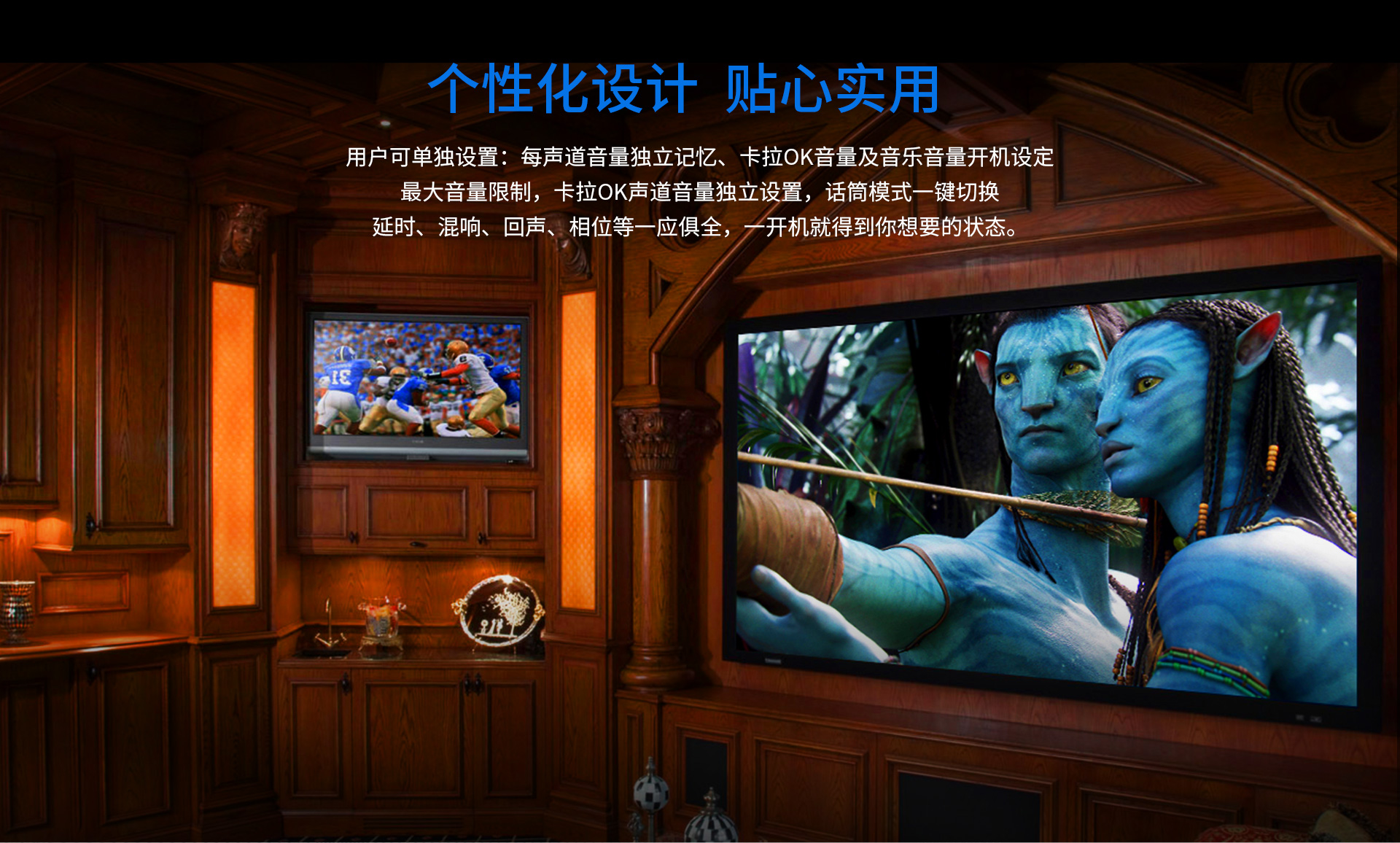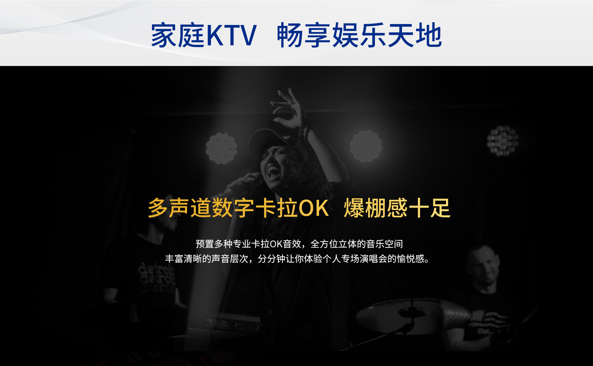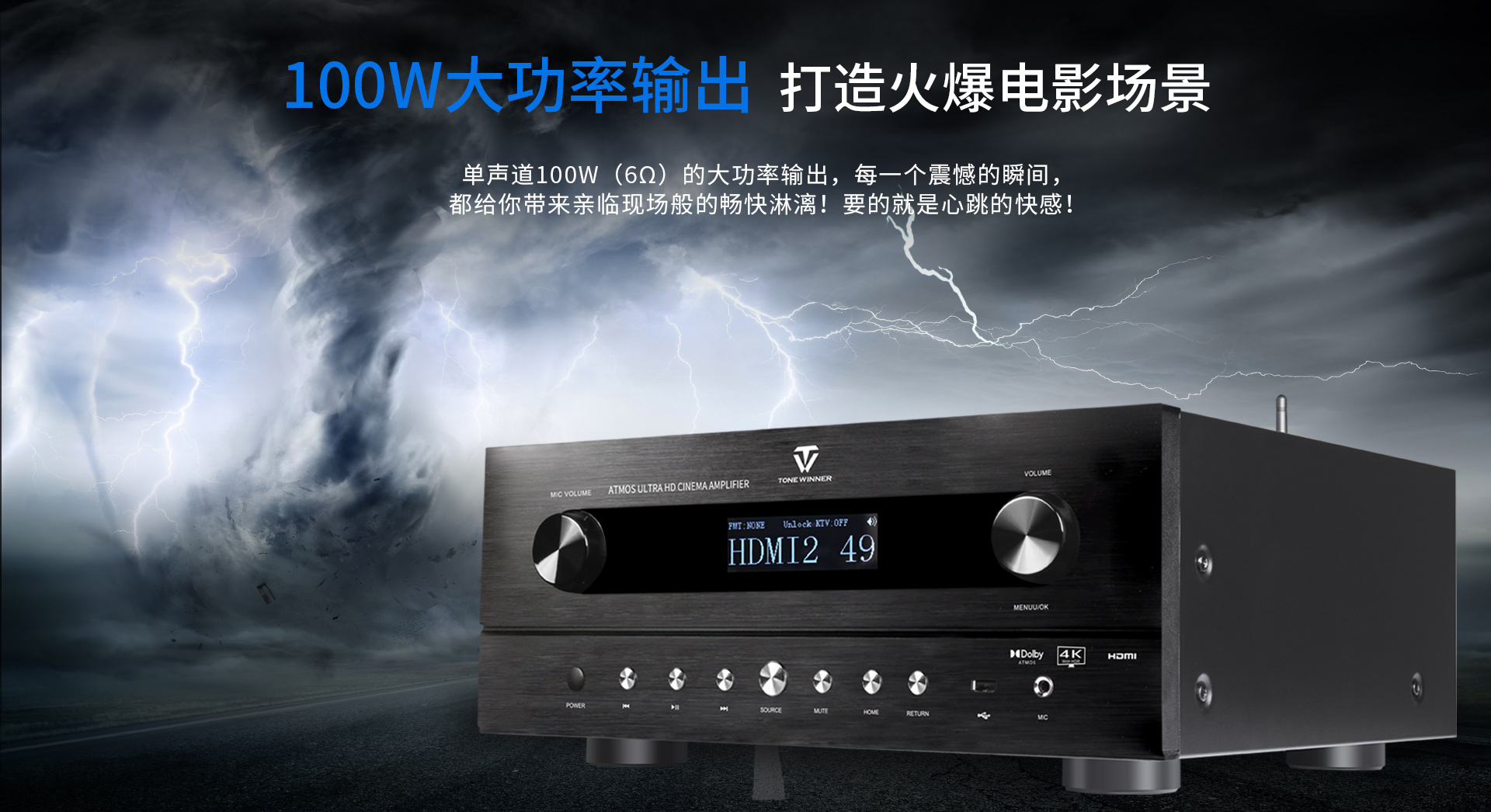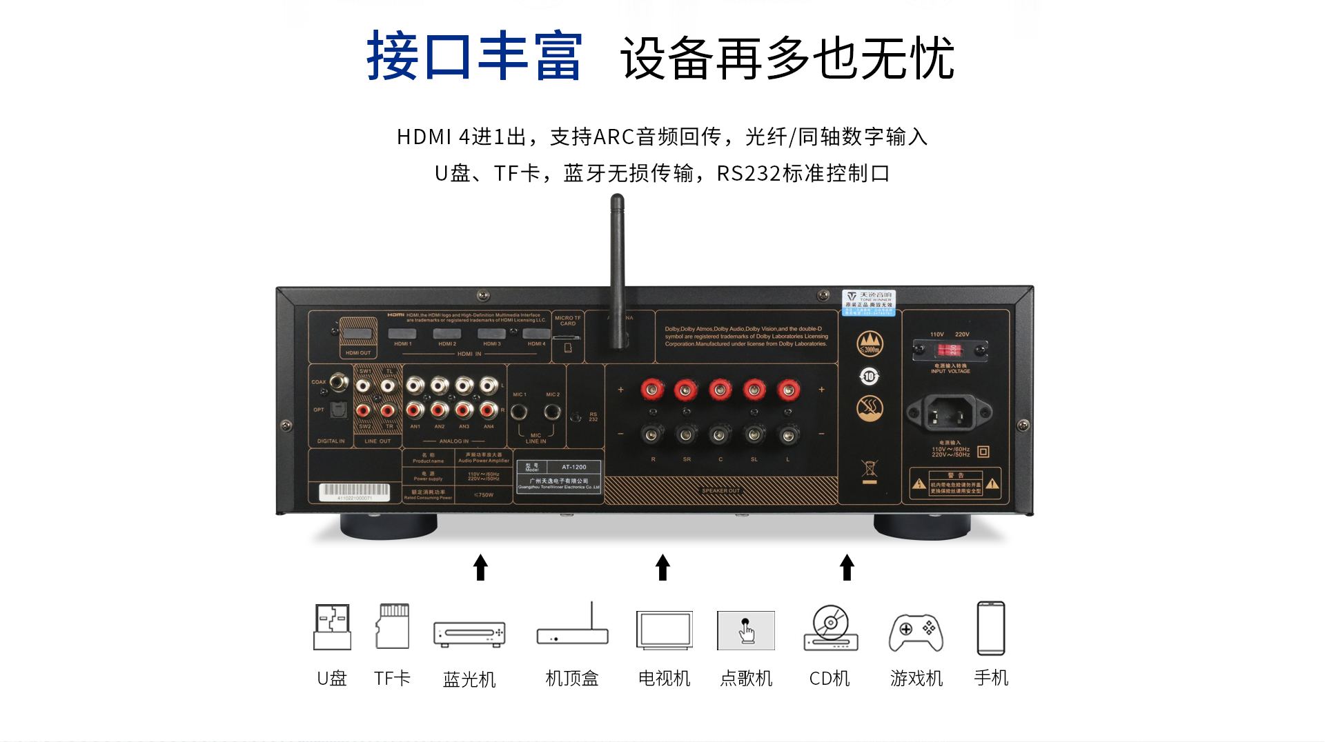 二、功能特點 1.支持Dolby Atmos全景聲音頻解碼及向下兼容所有Dolby音頻格式; 2.支持HDMI2.0,支持HDCP2.2; 3.支持4K/60Hz,RGB4:4:4,18GHz全帶寬高清視頻,支持Dolby Vision及HDR 10視頻信號; 4.五聲道功率輸出,同時支持擴展天空2聲道組成5.2.2系統; 5.支持多聲道數字卡拉OK; 6.內置藍牙音頻接收器; 7.內置高品質音樂播放器,支持TF卡及U盤音頻文件播放,支持FLAC、APE、WAV、MP3等多種無損及有損壓縮音頻格式,支持多層文件夾管理; 8.多聲道數字卡拉OK,強大的DSP數字混響效果及九級防嘯叫移頻處理技術,多種人聲風格選擇; 9.支持手機APP操作; 10.支持從2.1聲道到5.2.2聲道等多種揚聲器配置; 11.單聲道100W(6Ω,RMS)的大功率輸出; 12.支持RS232集中控制器; 13.提供7段參量均衡器EQ調節; 14.支持HDMI4進1出,4組模擬音頻輸入; 15.支持HDMI ARC音頻回傳,支持CEC控制; 16.支持按輸入源獨立設置及保存參數的功能。每聲道獨立EQ選擇,獨立卡拉OK控制,獨立音量調節記憶。
