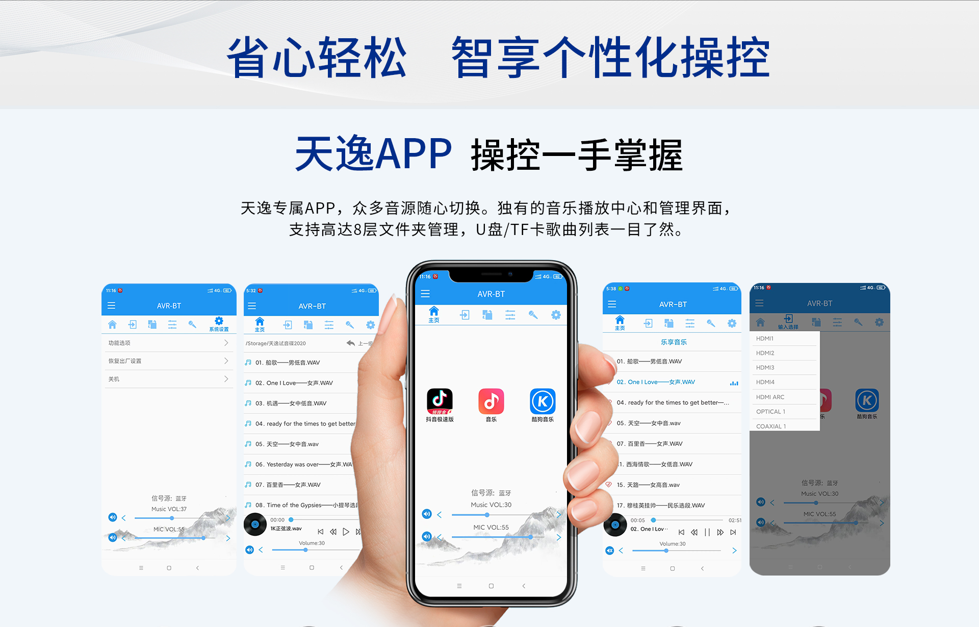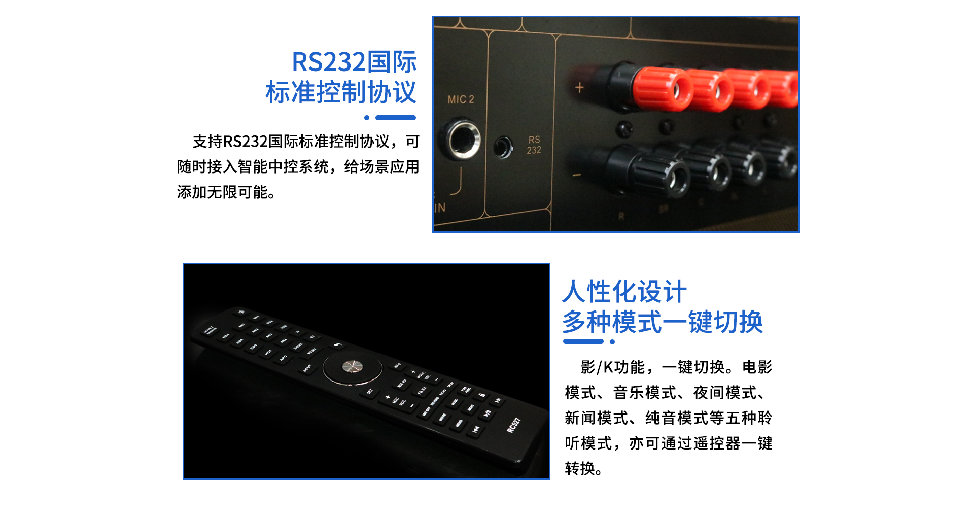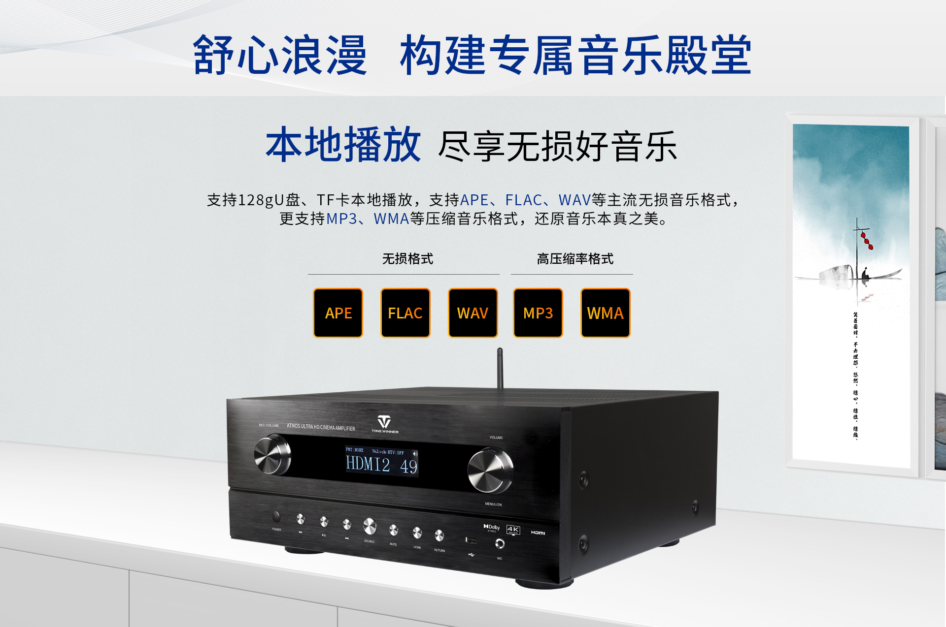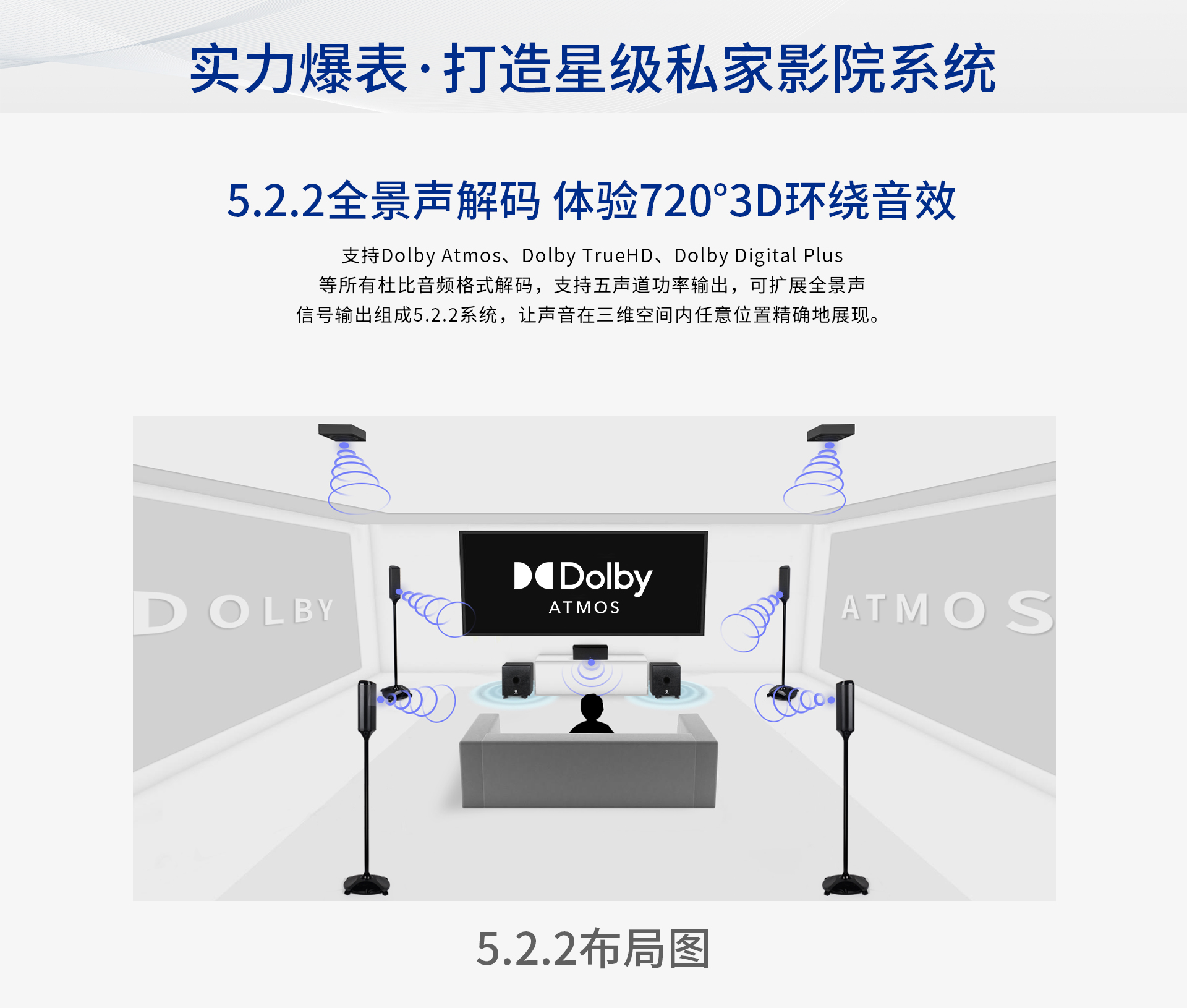 二、功能特點 1.支持Dolby Atmos全景聲音頻解碼及向下兼容所有Dolby音頻格式; 2.支持HDMI2.0,支持HDCP2.2; 3.支持4K/60Hz,RGB4:4:4,18GHz全帶寬高清視頻,支持Dolby Vision及HDR 10視頻信號; 4.五聲道功率輸出,同時支持擴展天空2聲道組成5.2.2系統; 5.支持多聲道數字卡拉OK; 6.內置藍牙音頻接收器; 7.內置高品質音樂播放器,支持TF卡及U盤音頻文件播放,支持FLAC、APE、WAV、MP3等多種無損及有損壓縮音頻格式,支持多層文件夾管理; 8.多聲道數字卡拉OK,強大的DSP數字混響效果及九級防嘯叫移頻處理技術,多種人聲風格選擇; 9.支持手機APP操作; 10.支持從2.1聲道到5.2.2聲道等多種揚聲器配置; 11.單聲道100W(6Ω,RMS)的大功率輸出; 12.支持RS232集中控制器; 13.提供7段參量均衡器EQ調節; 14.支持HDMI4進1出,4組模擬音頻輸入; 15.支持HDMI ARC音頻回傳,支持CEC控制; 16.支持按輸入源獨立設置及保存參數的功能。每聲道獨立EQ選擇,獨立卡拉OK控制,獨立音量調節記憶。