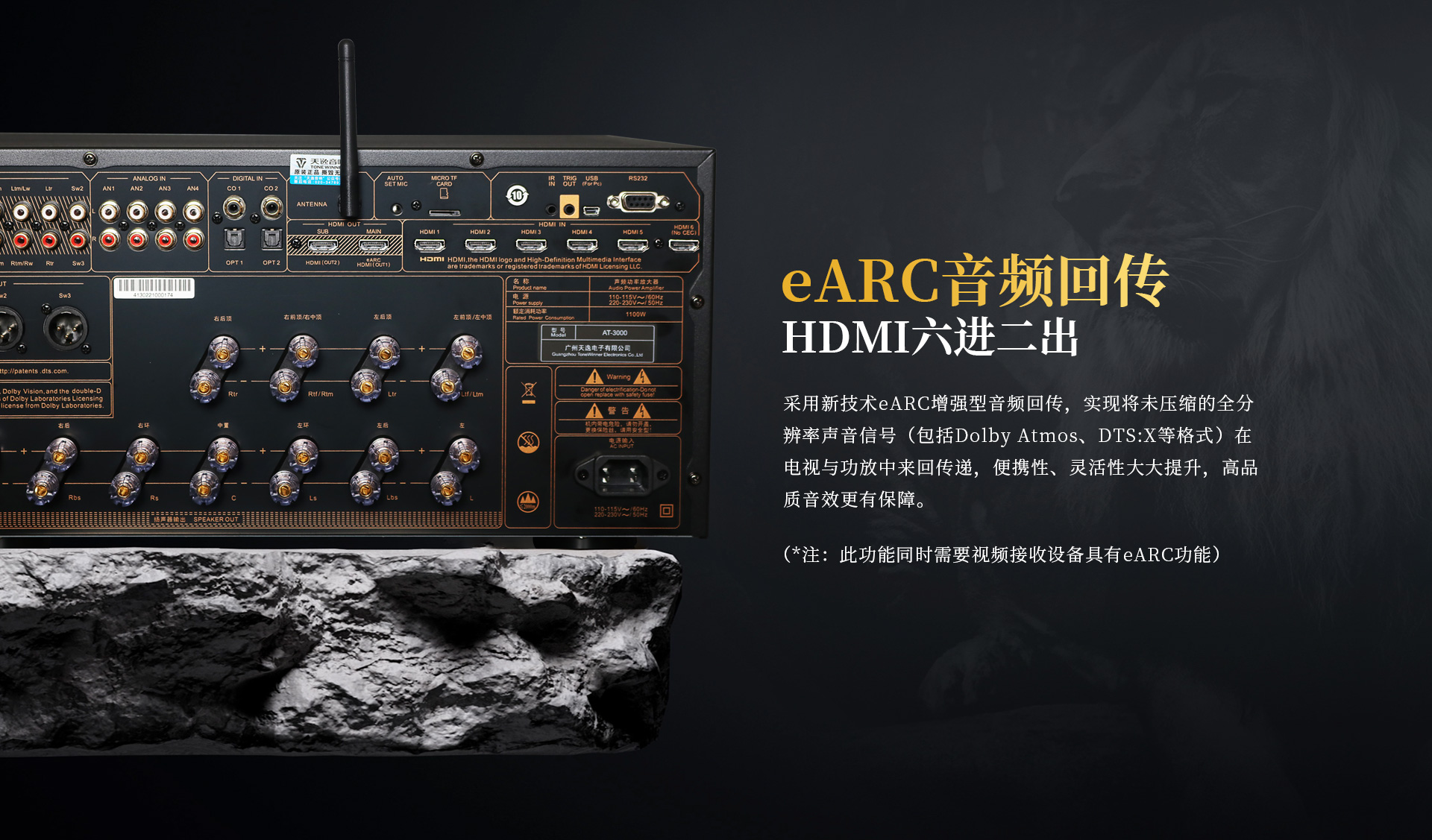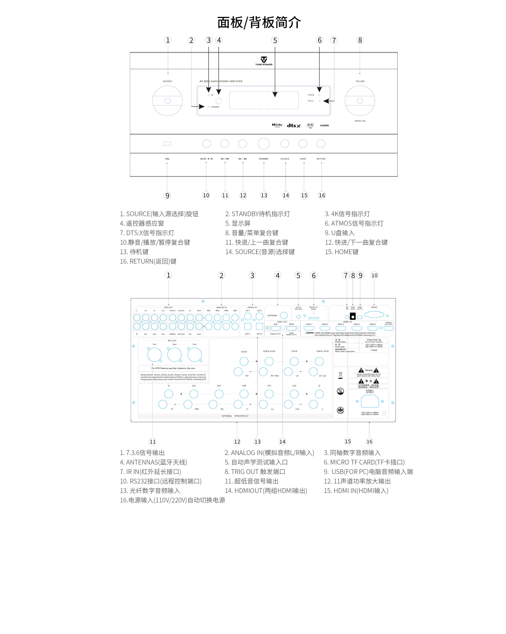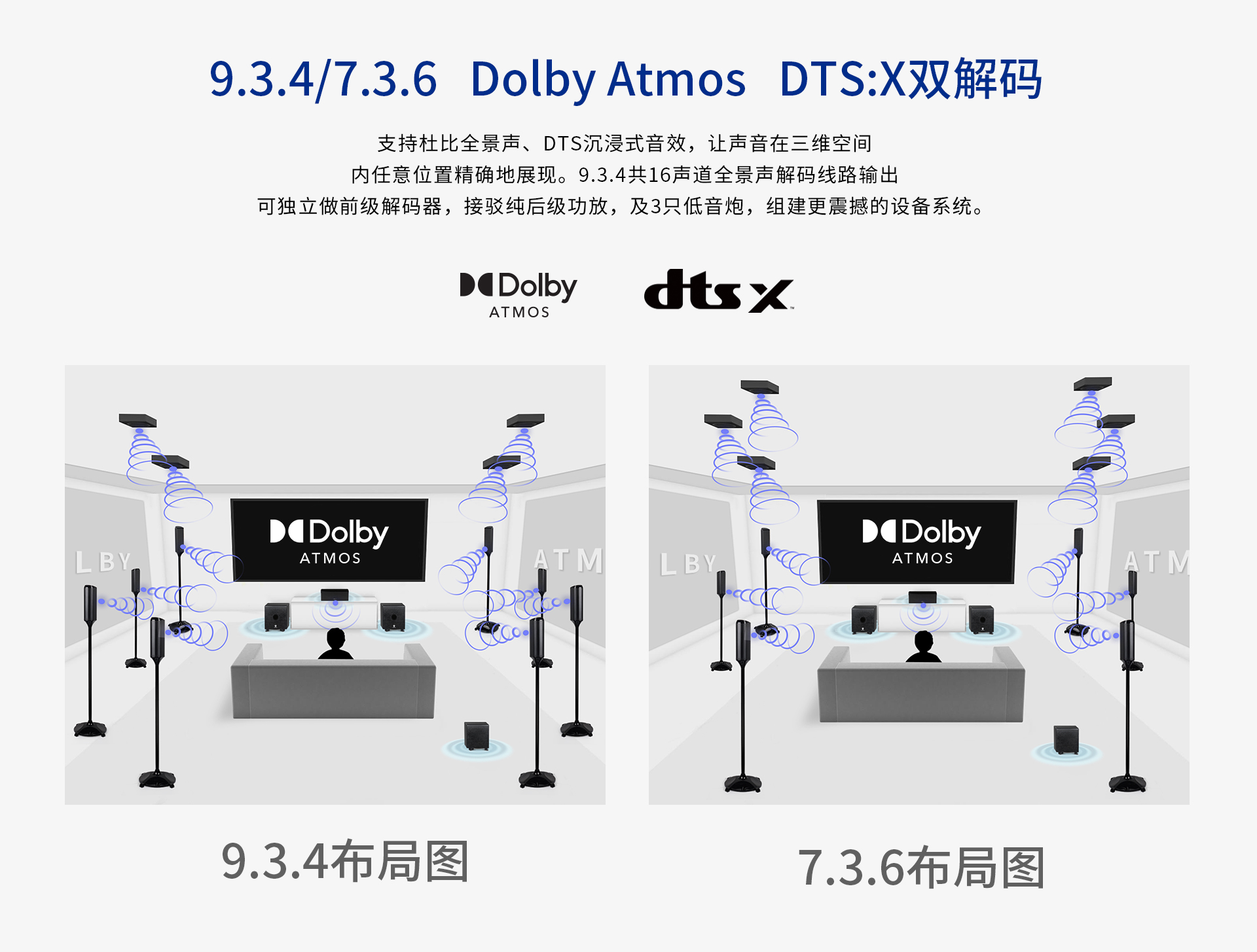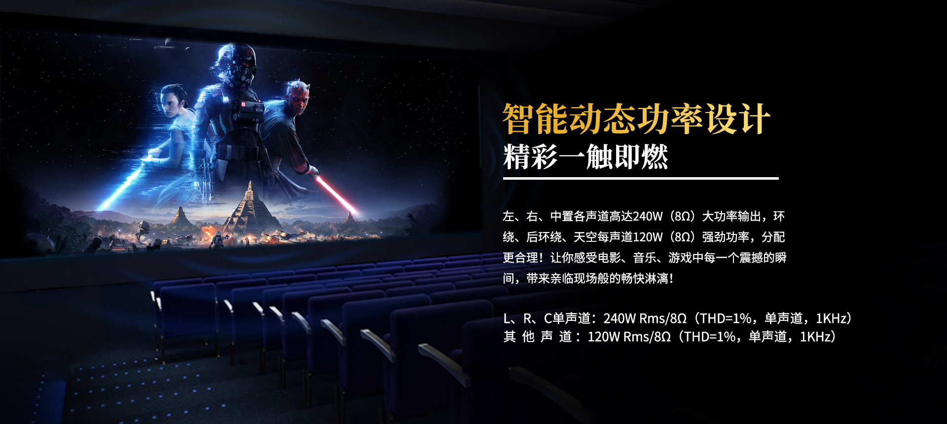 一、功能概述1. 支持Dolby Atmos、Dolby True -HD及向下兼容所有杜比音頻編碼文件; 2. 支持DTS:X、DTS-Master及向下兼容所有DTS音頻編碼文件; 3. 支持HDMI2.1,支持HDCP2.2; 4. 支持4K/60Hz,RGB 4:4:4,18GHz全帶寬高清視頻信號; 5. 支持Dolby Vision及HDR 10高清視頻信號; 6. 支持7.3.6或9.3.4信號輸出,可獨(dú)立做前級解碼接駁后級功放,及3只低音炮; 7. 總功率輸出高達(dá)1680W,適合20-60平米空間; 8. 采用智能動態(tài)功率設(shè)計,左、右、中置各聲道高達(dá)240W(8Ω)功率輸出,其它聲道120W(8Ω)強(qiáng)勁功率,共11路大功率Hi-Fi功放可直接驅(qū)動7.1.4聲道配置的揚(yáng)聲器; 9. 房間EQ揚(yáng)聲器距離、延時、聲壓的自動測試及補(bǔ)償,一鍵式操作,全自動校正,同時支持用戶手動調(diào)節(jié); 10. 內(nèi)置全球五大測試系統(tǒng)之——ETQ房間聲學(xué)自動測試校正軟件; 11. 內(nèi)置藍(lán)牙數(shù)字音頻接收器; 12. 內(nèi)置高品質(zhì)音樂播放器,支持TF卡及U盤音頻文件播放,支持FLAC、APE、WAV、MP3等多種無損及有損壓縮音頻格式,支持多層文件夾管理; 13. 支持手機(jī)APP操作; 14. 支持全中文疊加式OSD屏幕顯示菜單; 15. 支持本地音樂信息手機(jī)及電視可同步讀取顯示; 16. 支持從2.0聲道到9.1.4聲道等10多種揚(yáng)聲器配置 17. 支持HDMI 6進(jìn)2出,2組同軸2組光纖數(shù)字音頻輸入,4組模擬音頻輸入; 18. 支持RS232集中控制器; 19. 支持HDMI eARC增強(qiáng)型音頻回傳,支持CEC控制; 20. 支持高達(dá)1000ms時長的唇音同步調(diào)節(jié); 21. 每聲道多達(dá)5~11段參數(shù)EQ; 22. 支持音視頻編組輸出; 23. 選用美國ADI最新一代雙核DSP處理器; 24. 支持按輸入源獨(dú)立設(shè)置及保存參數(shù)的功能。輸入源獨(dú)立EQ選擇,獨(dú)立音量調(diào)節(jié)記憶;