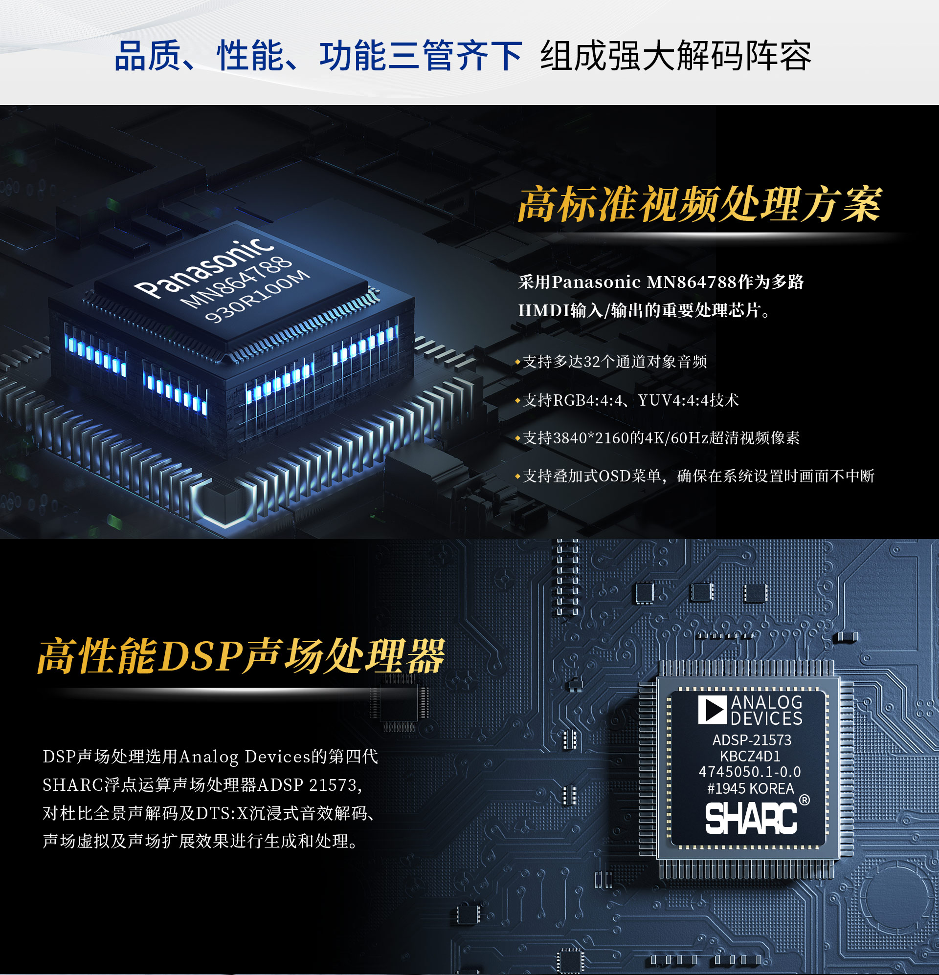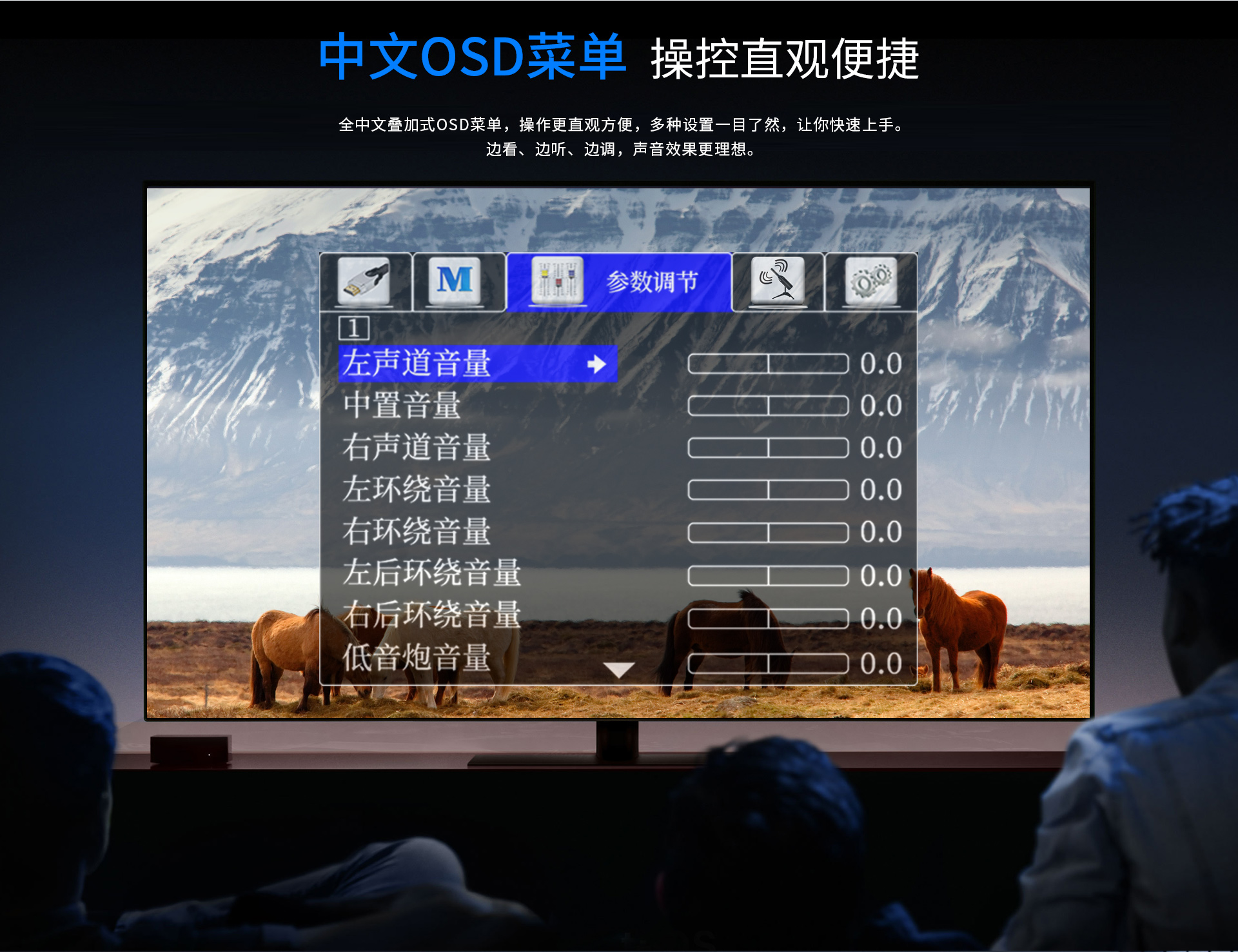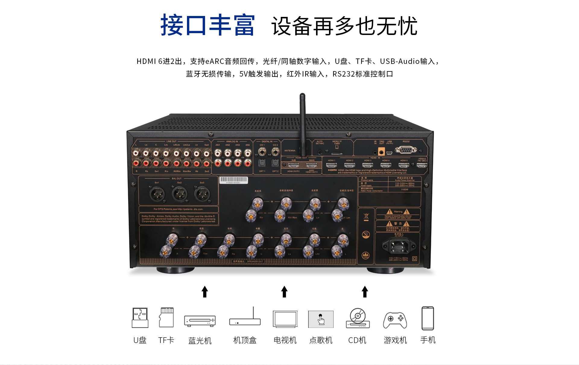 一、功能概述1. 支持Dolby Atmos、Dolby True -HD及向下兼容所有杜比音頻編碼文件; 2. 支持DTS:X、DTS-Master及向下兼容所有DTS音頻編碼文件; 3. 支持HDMI2.1,支持HDCP2.2; 4. 支持4K/60Hz,RGB 4:4:4,18GHz全帶寬高清視頻信號; 5. 支持Dolby Vision及HDR 10高清視頻信號; 6. 支持7.3.6或9.3.4信號輸出,可獨(dú)立做前級解碼接駁后級功放,及3只低音炮; 7. 總功率輸出高達(dá)1680W,適合20-60平米空間; 8. 采用智能動態(tài)功率設(shè)計,左、右、中置各聲道高達(dá)240W(8Ω)功率輸出,其它聲道120W(8Ω)強(qiáng)勁功率,共11路大功率Hi-Fi功放可直接驅(qū)動7.1.4聲道配置的揚(yáng)聲器; 9. 房間EQ揚(yáng)聲器距離、延時、聲壓的自動測試及補(bǔ)償,一鍵式操作,全自動校正,同時支持用戶手動調(diào)節(jié); 10. 內(nèi)置全球五大測試系統(tǒng)之——ETQ房間聲學(xué)自動測試校正軟件; 11. 內(nèi)置藍(lán)牙數(shù)字音頻接收器; 12. 內(nèi)置高品質(zhì)音樂播放器,支持TF卡及U盤音頻文件播放,支持FLAC、APE、WAV、MP3等多種無損及有損壓縮音頻格式,支持多層文件夾管理; 13. 支持手機(jī)APP操作; 14. 支持全中文疊加式OSD屏幕顯示菜單; 15. 支持本地音樂信息手機(jī)及電視可同步讀取顯示; 16. 支持從2.0聲道到9.1.4聲道等10多種揚(yáng)聲器配置 17. 支持HDMI 6進(jìn)2出,2組同軸2組光纖數(shù)字音頻輸入,4組模擬音頻輸入; 18. 支持RS232集中控制器; 19. 支持HDMI eARC增強(qiáng)型音頻回傳,支持CEC控制; 20. 支持高達(dá)1000ms時長的唇音同步調(diào)節(jié); 21. 每聲道多達(dá)5~11段參數(shù)EQ; 22. 支持音視頻編組輸出; 23. 選用美國ADI最新一代雙核DSP處理器; 24. 支持按輸入源獨(dú)立設(shè)置及保存參數(shù)的功能。輸入源獨(dú)立EQ選擇,獨(dú)立音量調(diào)節(jié)記憶;