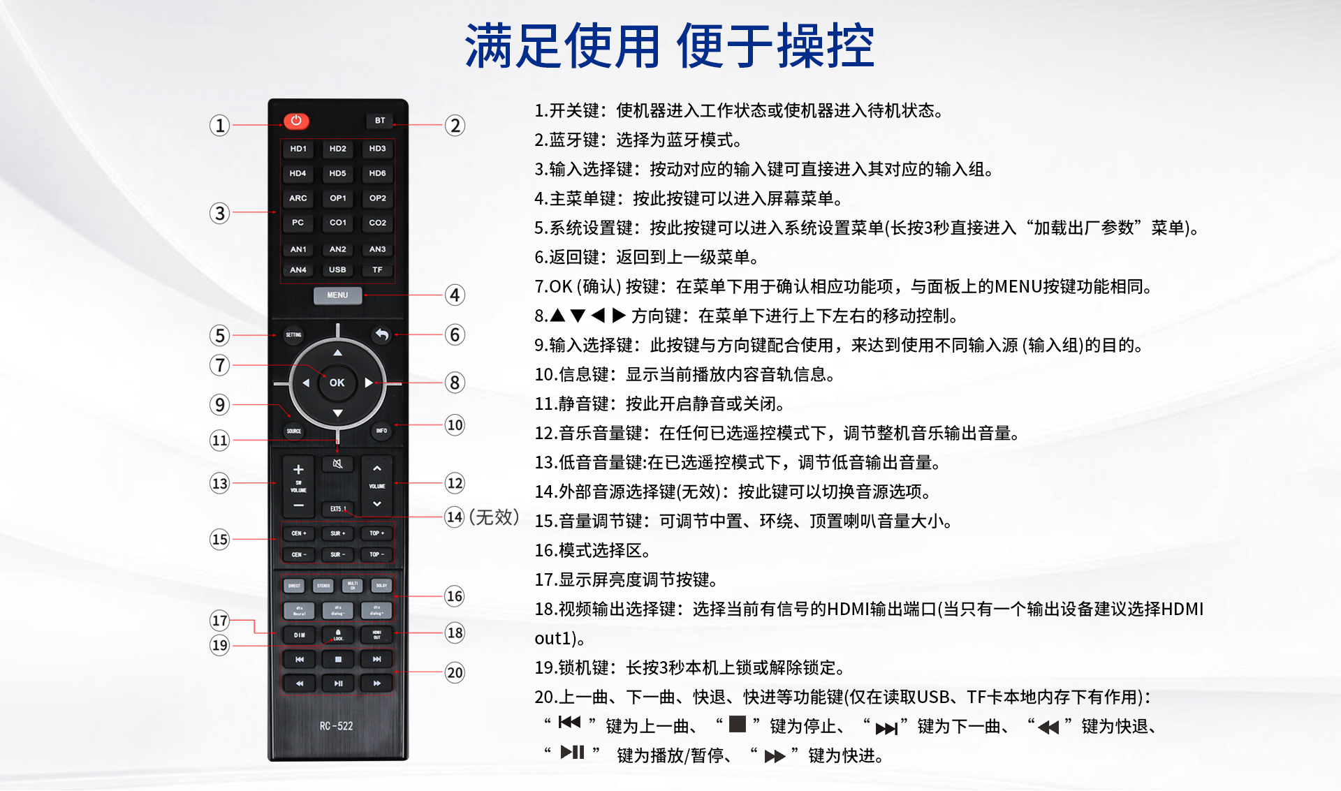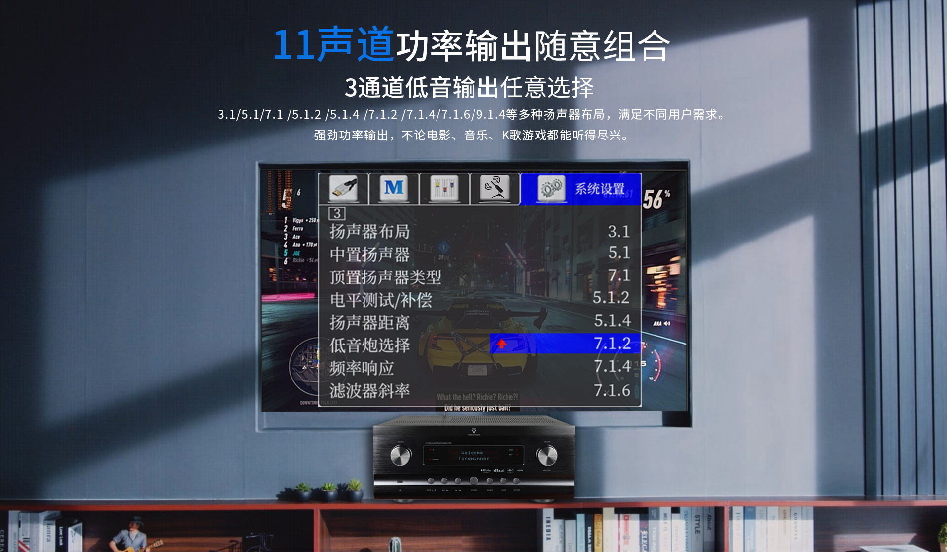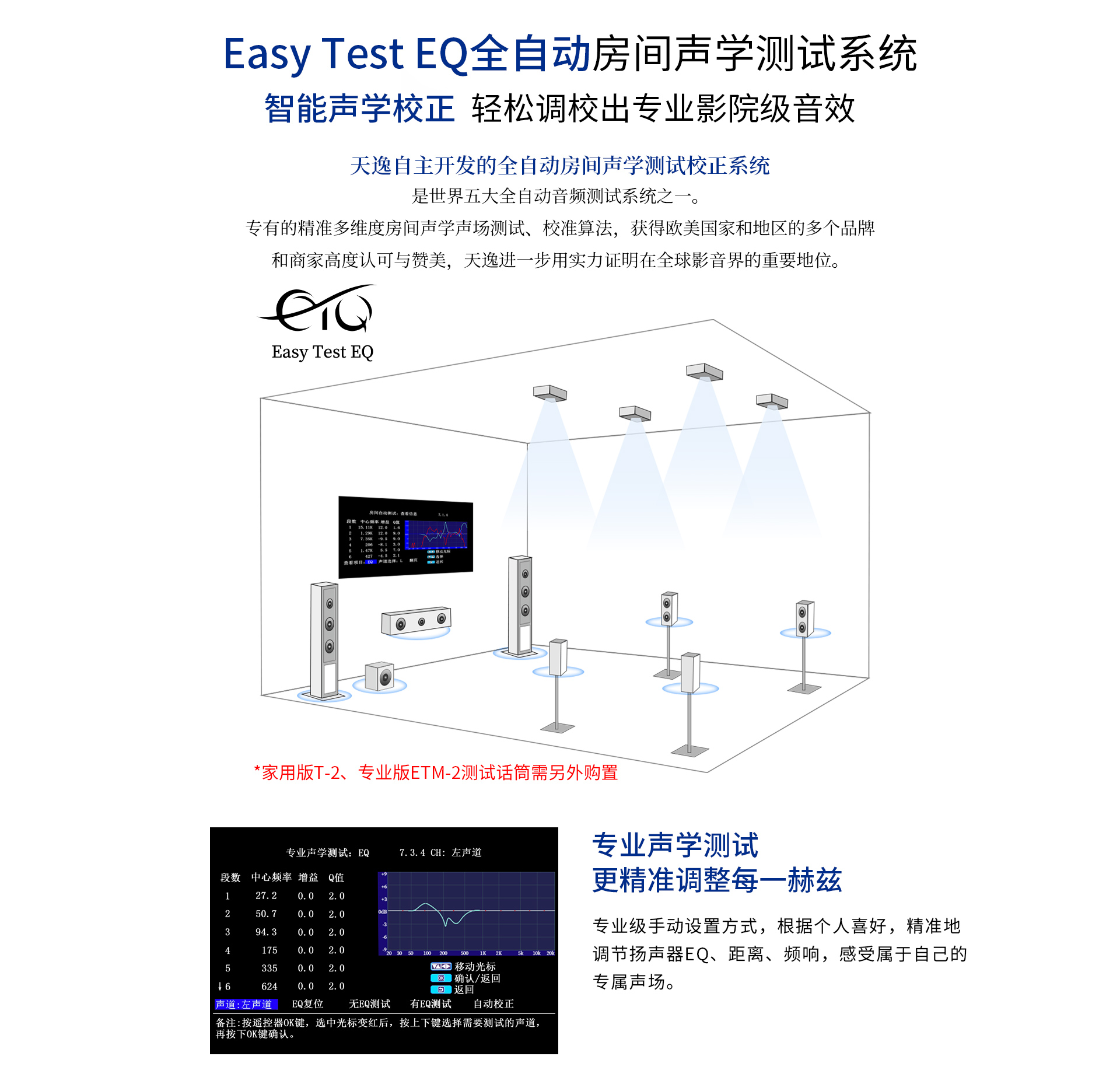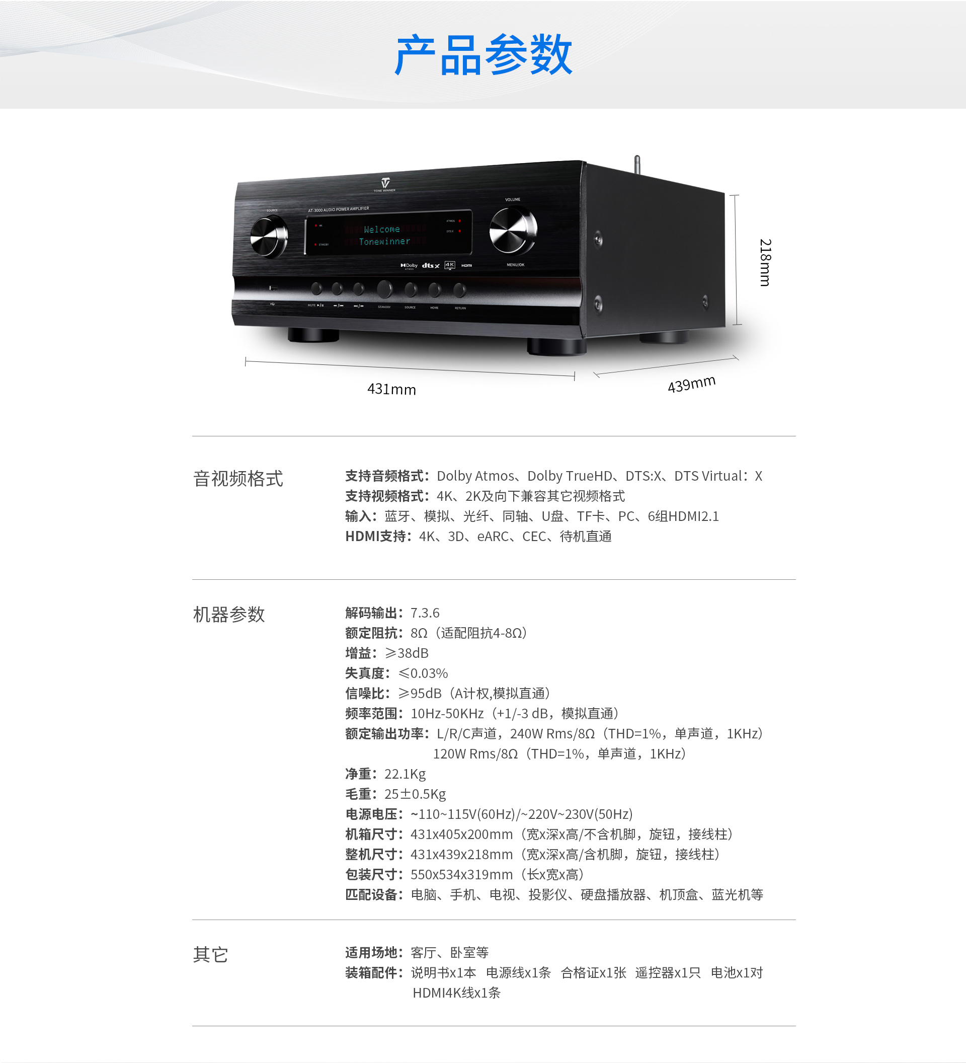 一、功能概述1. 支持Dolby Atmos、Dolby True -HD及向下兼容所有杜比音頻編碼文件; 2. 支持DTS:X、DTS-Master及向下兼容所有DTS音頻編碼文件; 3. 支持HDMI2.1,支持HDCP2.2; 4. 支持4K/60Hz,RGB 4:4:4,18GHz全帶寬高清視頻信號; 5. 支持Dolby Vision及HDR 10高清視頻信號; 6. 支持7.3.6或9.3.4信號輸出,可獨(dú)立做前級解碼接駁后級功放,及3只低音炮; 7. 總功率輸出高達(dá)1680W,適合20-60平米空間; 8. 采用智能動態(tài)功率設(shè)計,左、右、中置各聲道高達(dá)240W(8Ω)功率輸出,其它聲道120W(8Ω)強(qiáng)勁功率,共11路大功率Hi-Fi功放可直接驅(qū)動7.1.4聲道配置的揚(yáng)聲器; 9. 房間EQ揚(yáng)聲器距離、延時、聲壓的自動測試及補(bǔ)償,一鍵式操作,全自動校正,同時支持用戶手動調(diào)節(jié); 10. 內(nèi)置全球五大測試系統(tǒng)之——ETQ房間聲學(xué)自動測試校正軟件; 11. 內(nèi)置藍(lán)牙數(shù)字音頻接收器; 12. 內(nèi)置高品質(zhì)音樂播放器,支持TF卡及U盤音頻文件播放,支持FLAC、APE、WAV、MP3等多種無損及有損壓縮音頻格式,支持多層文件夾管理; 13. 支持手機(jī)APP操作; 14. 支持全中文疊加式OSD屏幕顯示菜單; 15. 支持本地音樂信息手機(jī)及電視可同步讀取顯示; 16. 支持從2.0聲道到9.1.4聲道等10多種揚(yáng)聲器配置 17. 支持HDMI 6進(jìn)2出,2組同軸2組光纖數(shù)字音頻輸入,4組模擬音頻輸入; 18. 支持RS232集中控制器; 19. 支持HDMI eARC增強(qiáng)型音頻回傳,支持CEC控制; 20. 支持高達(dá)1000ms時長的唇音同步調(diào)節(jié); 21. 每聲道多達(dá)5~11段參數(shù)EQ; 22. 支持音視頻編組輸出; 23. 選用美國ADI最新一代雙核DSP處理器; 24. 支持按輸入源獨(dú)立設(shè)置及保存參數(shù)的功能。輸入源獨(dú)立EQ選擇,獨(dú)立音量調(diào)節(jié)記憶;