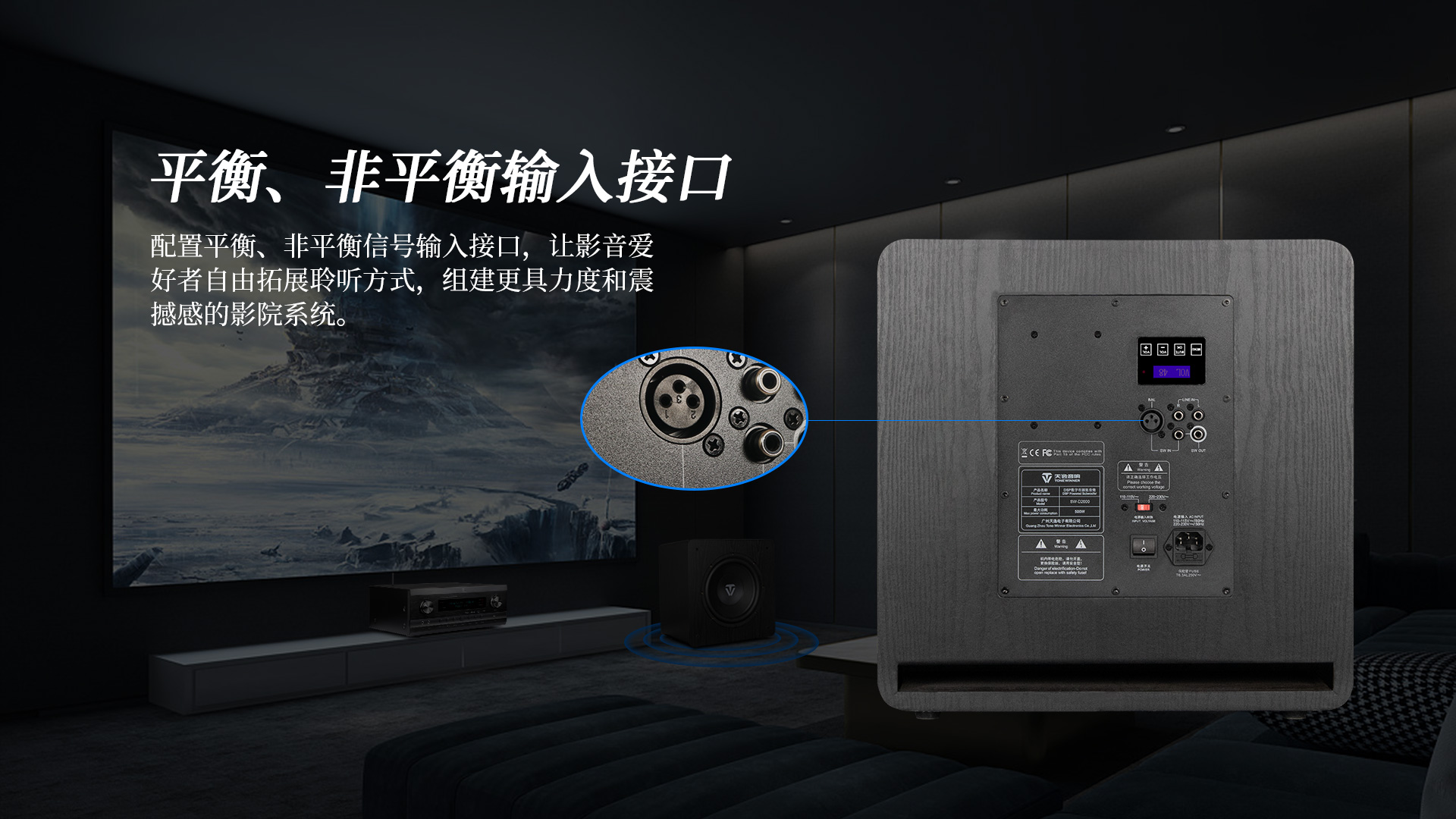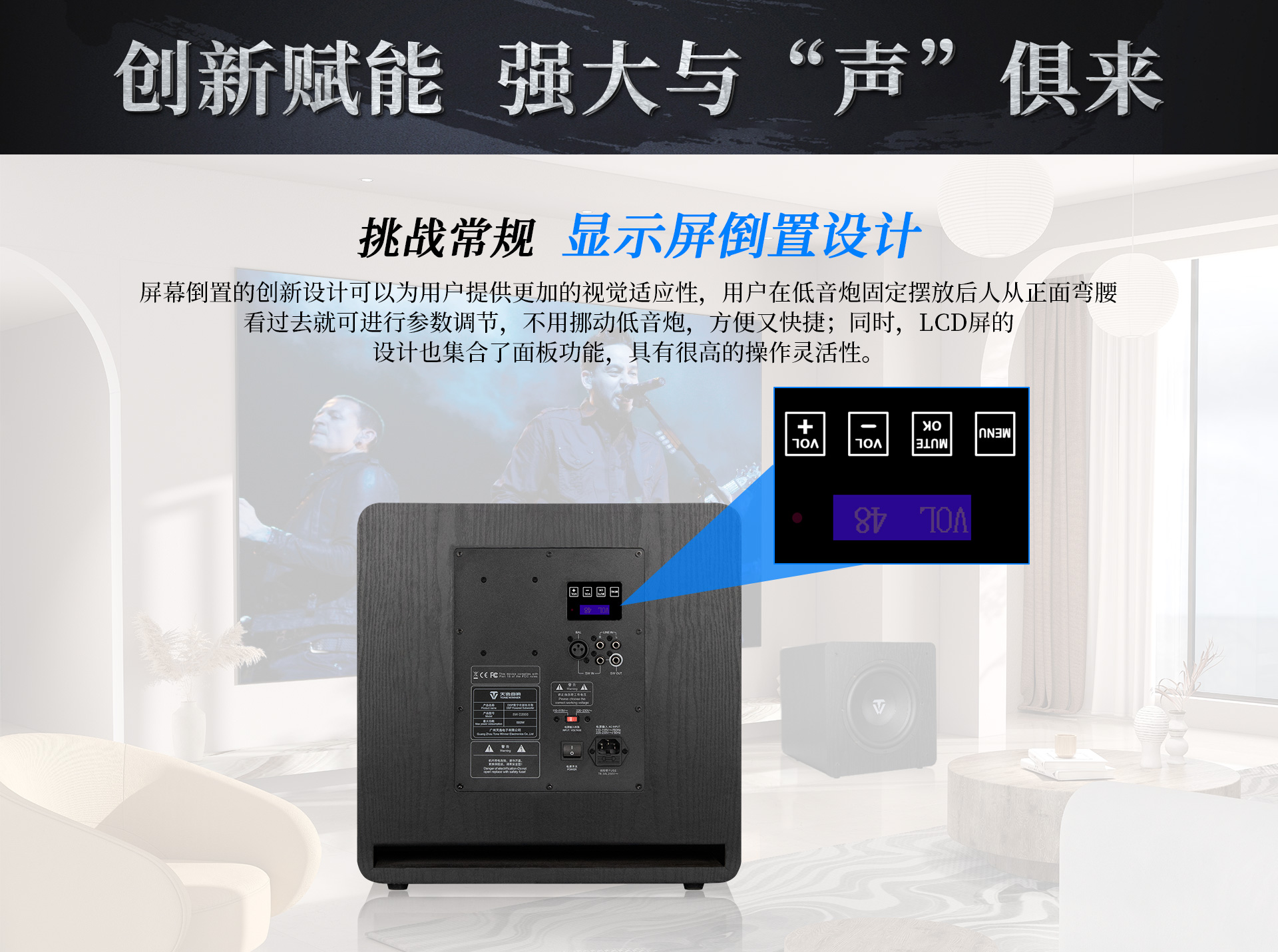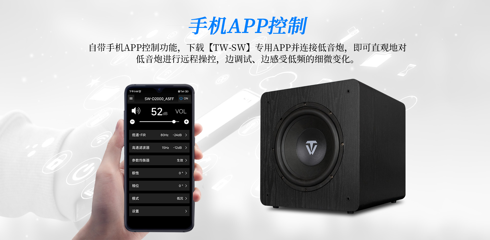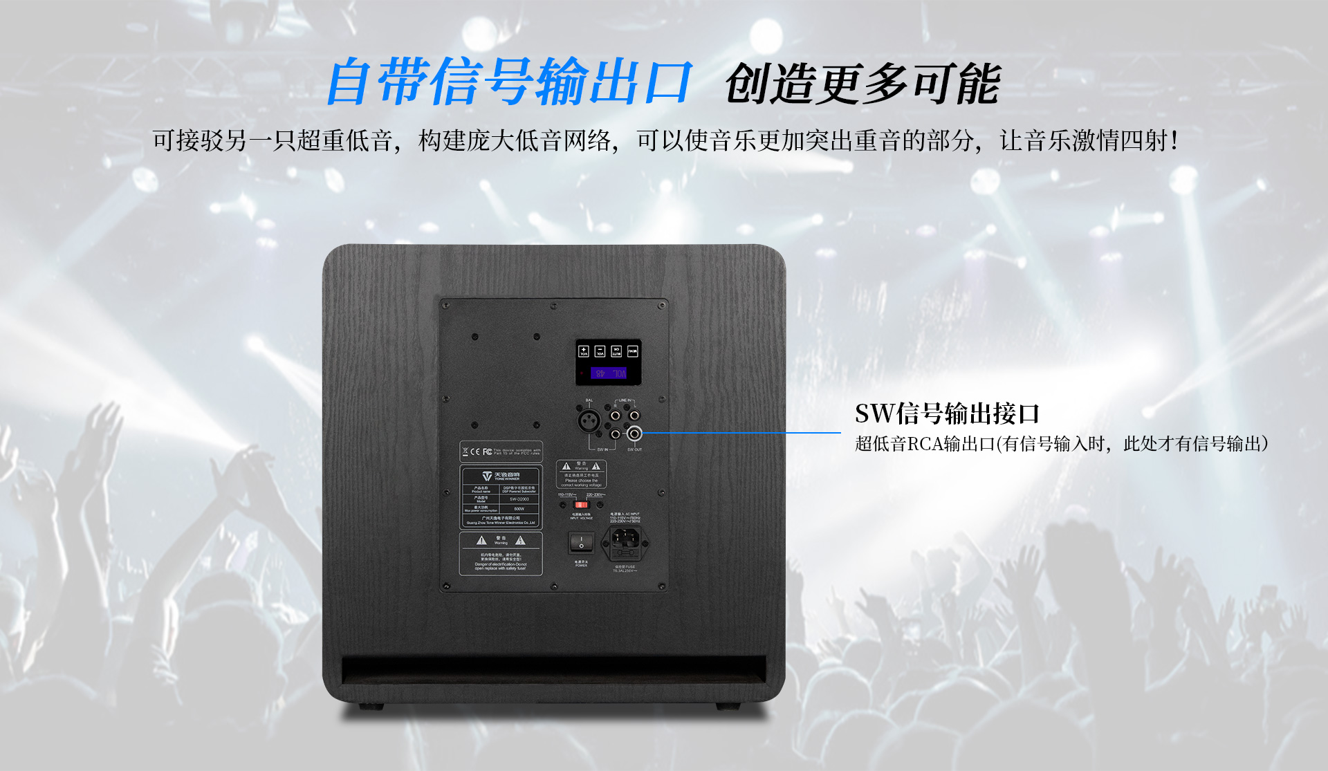 一、功能特點 1. 采用高效低噪D類放大電路,內置DSP數字處理器,7段參量均衡 (EQ) 任意調節 2. 采用觸摸按鍵配合液晶顯示屏,調校一目了然; 3. 實現APP遠程控制,操作更便捷 4. 實現APP無線操作程序升級, 5. 內置低通濾波器,頻率范圍可調節 6. 內置相位開關,0°/180°相位切換、 7. 支持平衡、RCA兩種輸入; 8. 支持無信號待機功能; 9. 12英寸、長沖程、強磁、大功率喇叭單元,具有低失真、高動態長沖程等特點; 10. 雙導流、下潛反射式倒相口, 強勁有力,低頻更足。 其他特點: 1.箱體表面采用橡木紋PVC飾面,環保耐磨,抗靜電; 2.優質高彈懸邊,一體成型的高強度鑄鋁盆架,半松壓音盒。