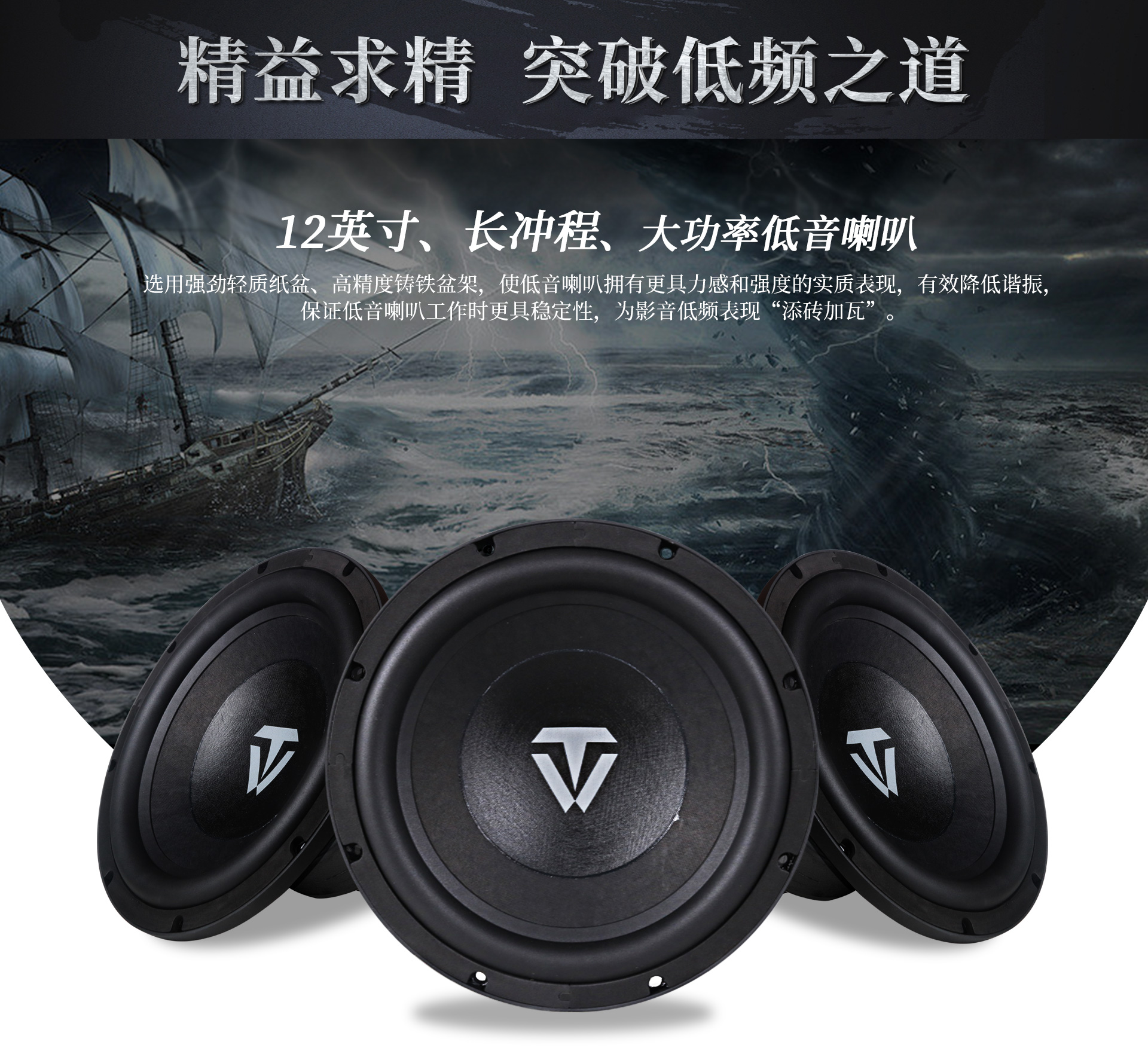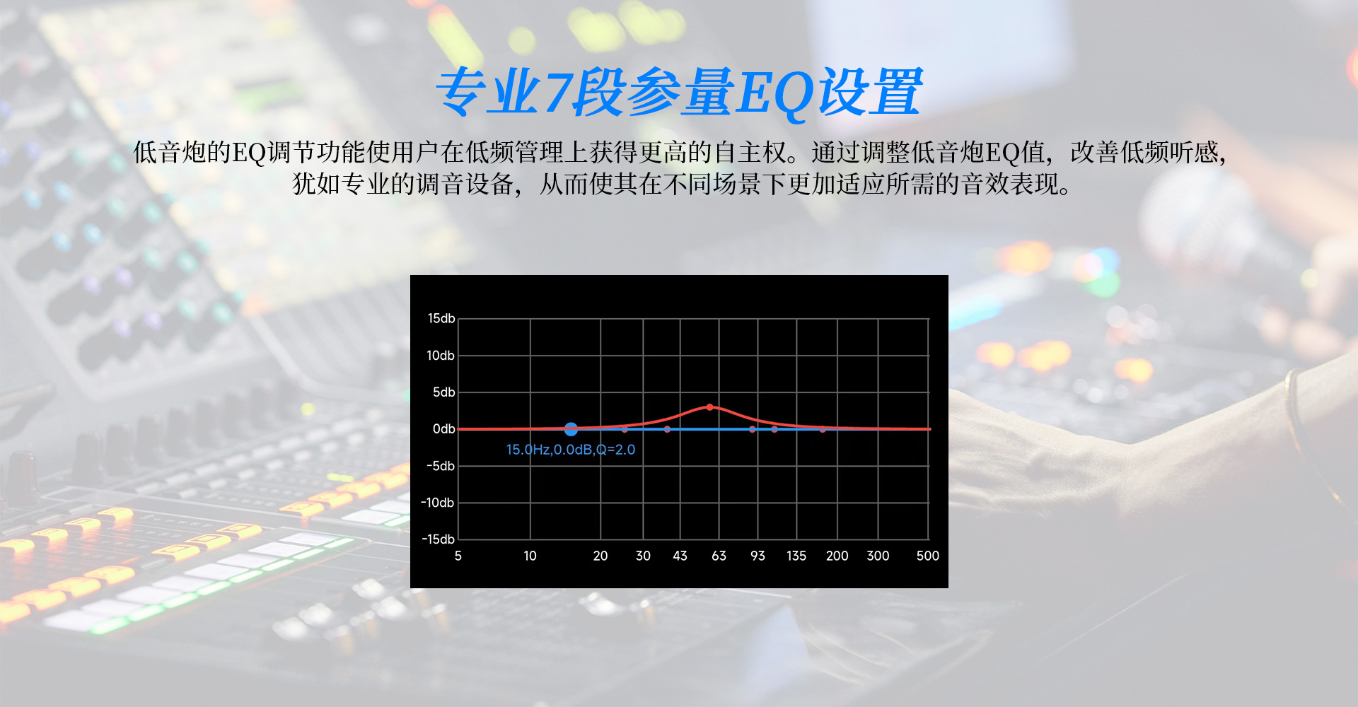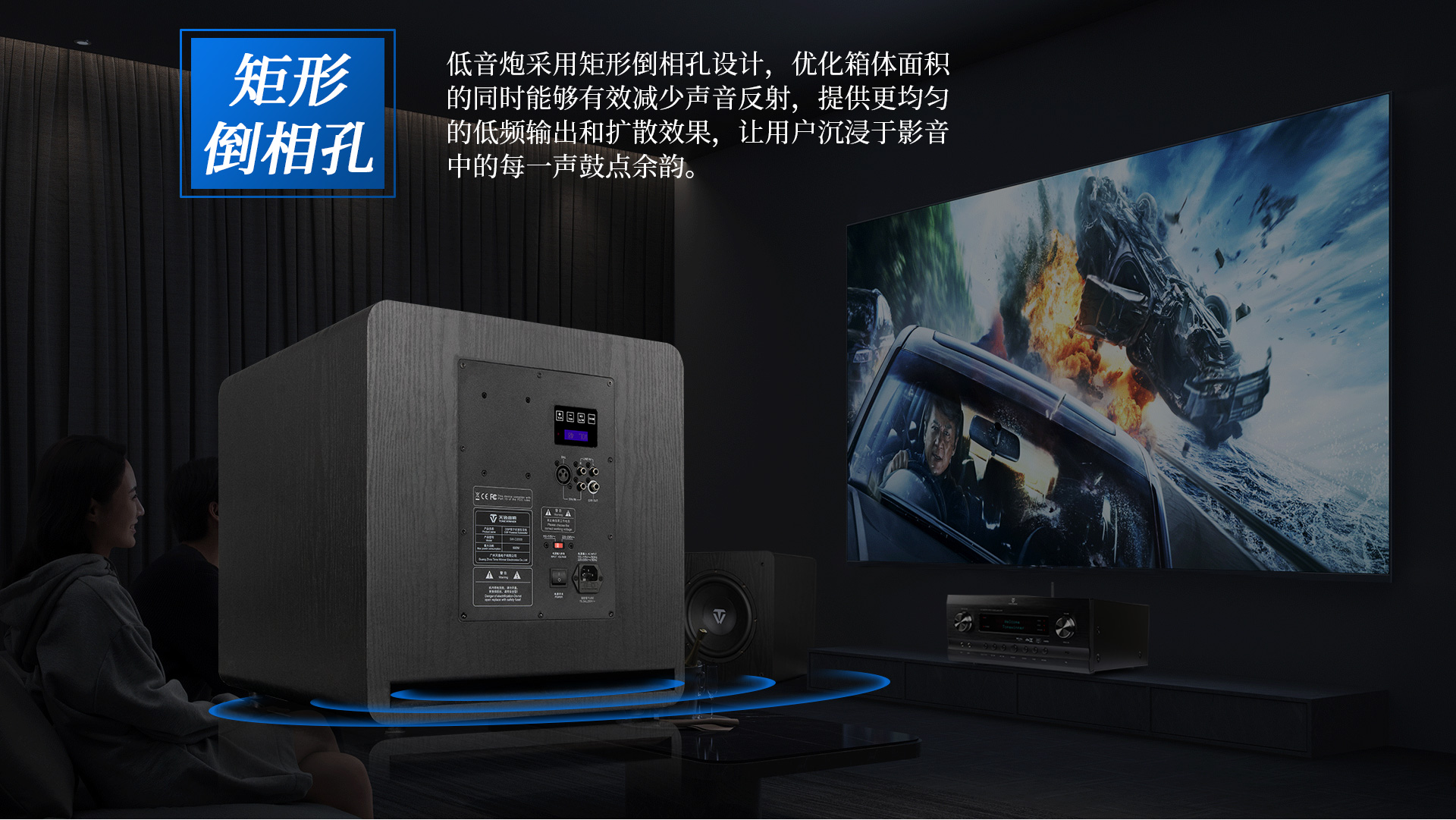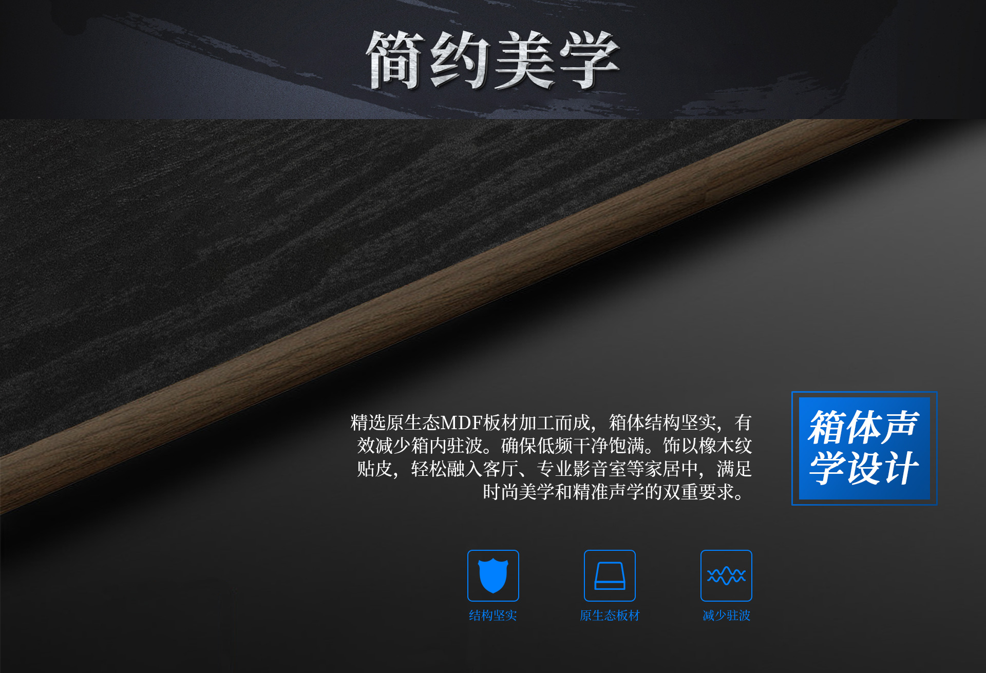 一、功能特點 1. 采用高效低噪D類放大電路,內置DSP數字處理器,7段參量均衡 (EQ) 任意調節 2. 采用觸摸按鍵配合液晶顯示屏,調校一目了然; 3. 實現APP遠程控制,操作更便捷 4. 實現APP無線操作程序升級, 5. 內置低通濾波器,頻率范圍可調節 6. 內置相位開關,0°/180°相位切換、 7. 支持平衡、RCA兩種輸入; 8. 支持無信號待機功能; 9. 12英寸、長沖程、強磁、大功率喇叭單元,具有低失真、高動態長沖程等特點; 10. 雙導流、下潛反射式倒相口, 強勁有力,低頻更足。 其他特點: 1.箱體表面采用橡木紋PVC飾面,環保耐磨,抗靜電; 2.優質高彈懸邊,一體成型的高強度鑄鋁盆架,半松壓音盒。