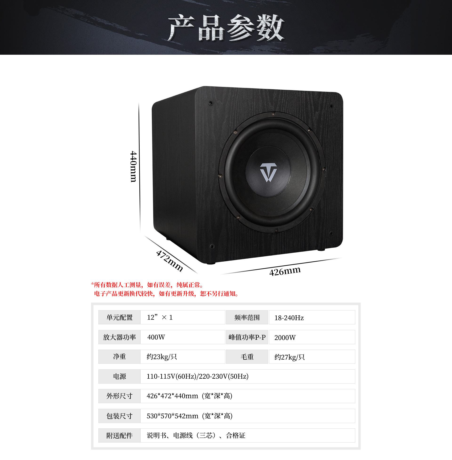 二、產品參數: 單元配置:12寸 頻率響應:18Hz-240Hz 功放功率:400W (3Ω) 電源:~110V(60Hz)/~220V(50Hz) 凈重:約23kg/只 箱體尺寸:426X440X472mm(寬X高 X 深)