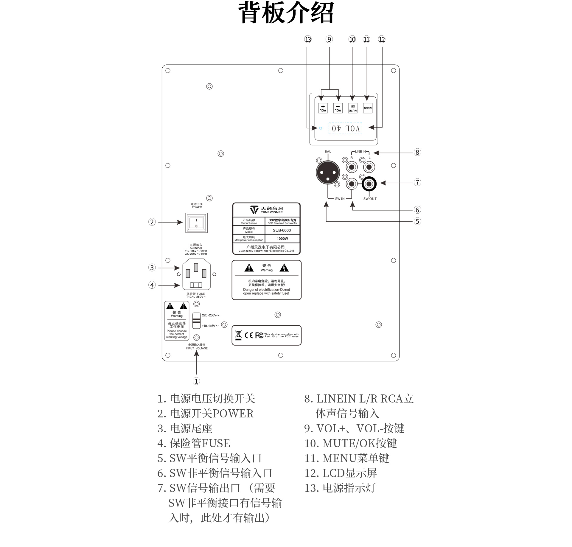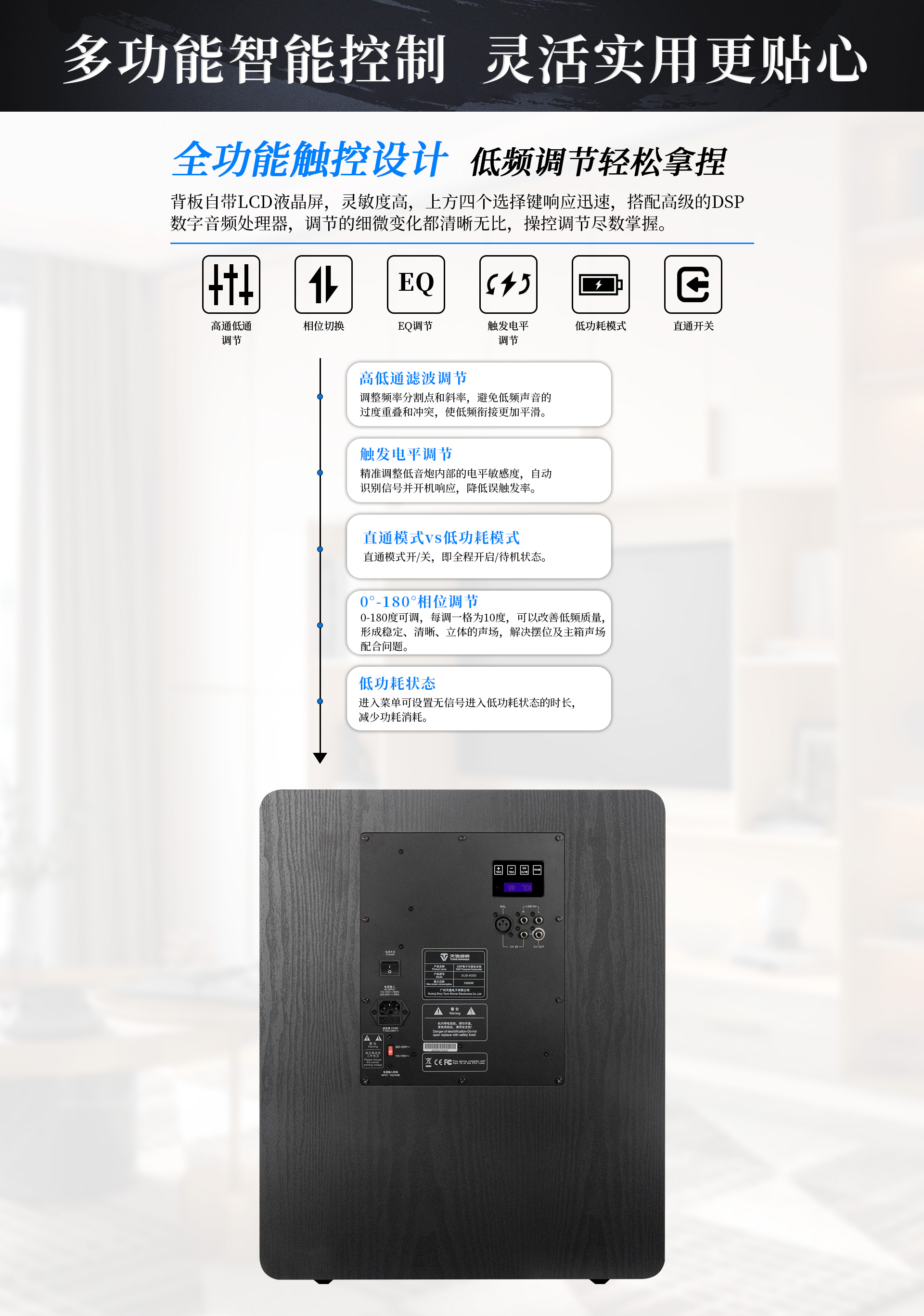 一、 功能特點 1. 采有高效低噪D類放大電路內置DSP數字處理器,7段參量均衡(EQ) 任意調節 2. 15英寸、長沖程、強磁、大功率喇叭單元,具有低失真、高動態長沖程等特點; 3. 采用觸摸按鍵配合液晶顯示屏,調校一目了然; 4. 實現APP遠程控制,操作更便捷; 5. 實現APP無線操作程序升級; 6. 內置低通濾波器,頻率范圍可調節; 7. 內置相位開關,0°/180°相位切換; 8. 支持平衡、非平衡、RCA立體聲信號; 9. 支持無信號待機功能; 10. 峰值功率P-P輸出可達4000W,重量高達49公斤; 11. 雙磁鋼設計,喇叭輻射效率更高更穩定; 12. 前置三倒相孔設計,支持倒相箱、閉箱設計; 13.四種低頻模式,根據聽音偏好進行個性化調節 二、 性能參數 單元配置:15” ×1 頻率范圍:15-220Hz 峰值功率P-P:4000W 放大器功率:800W 最大功耗:1000W 電源:110-115V/220-230V 凈重:約42kg/只 毛重:約48kg/只 外形尺寸:480*628*598mm(寬*深*高) 包裝尺寸:632*773*715mm(寬*深*高) 附送配件:說明書、電源線(三芯)、合格證 |