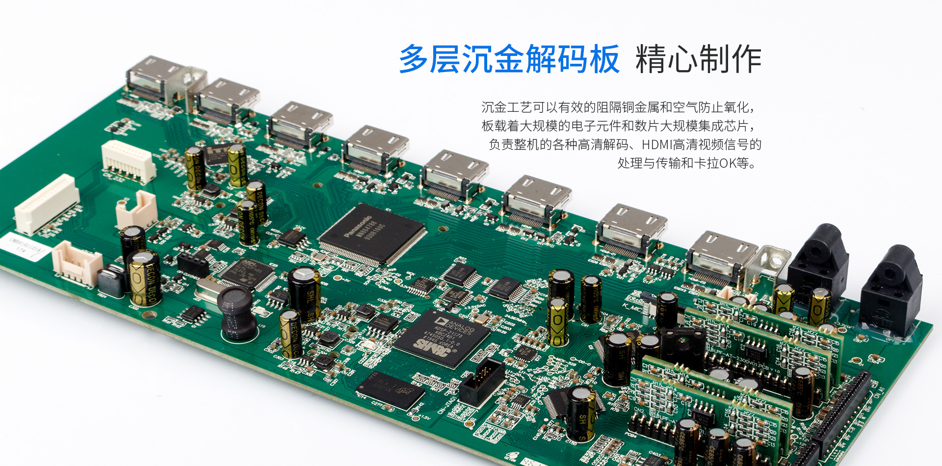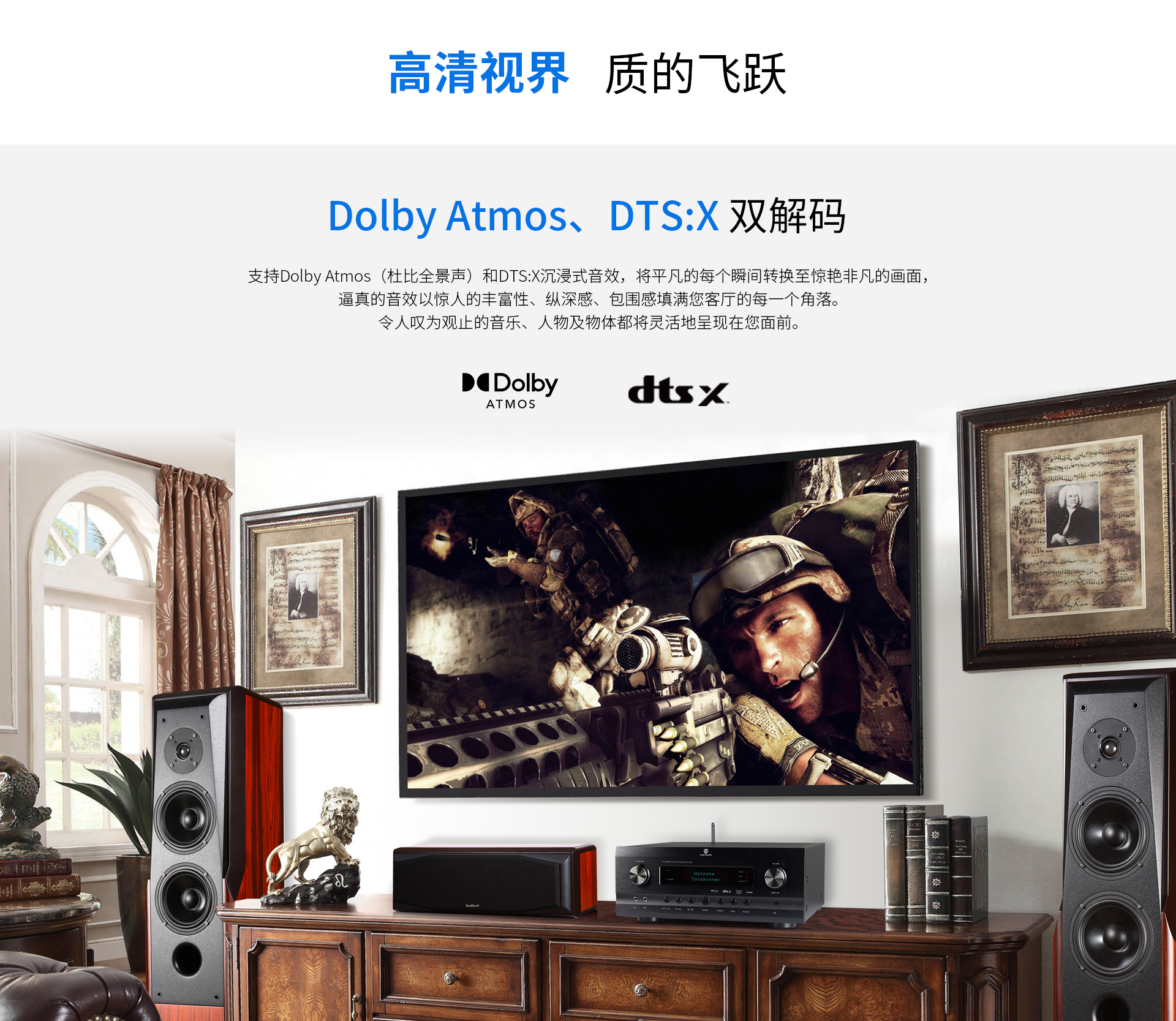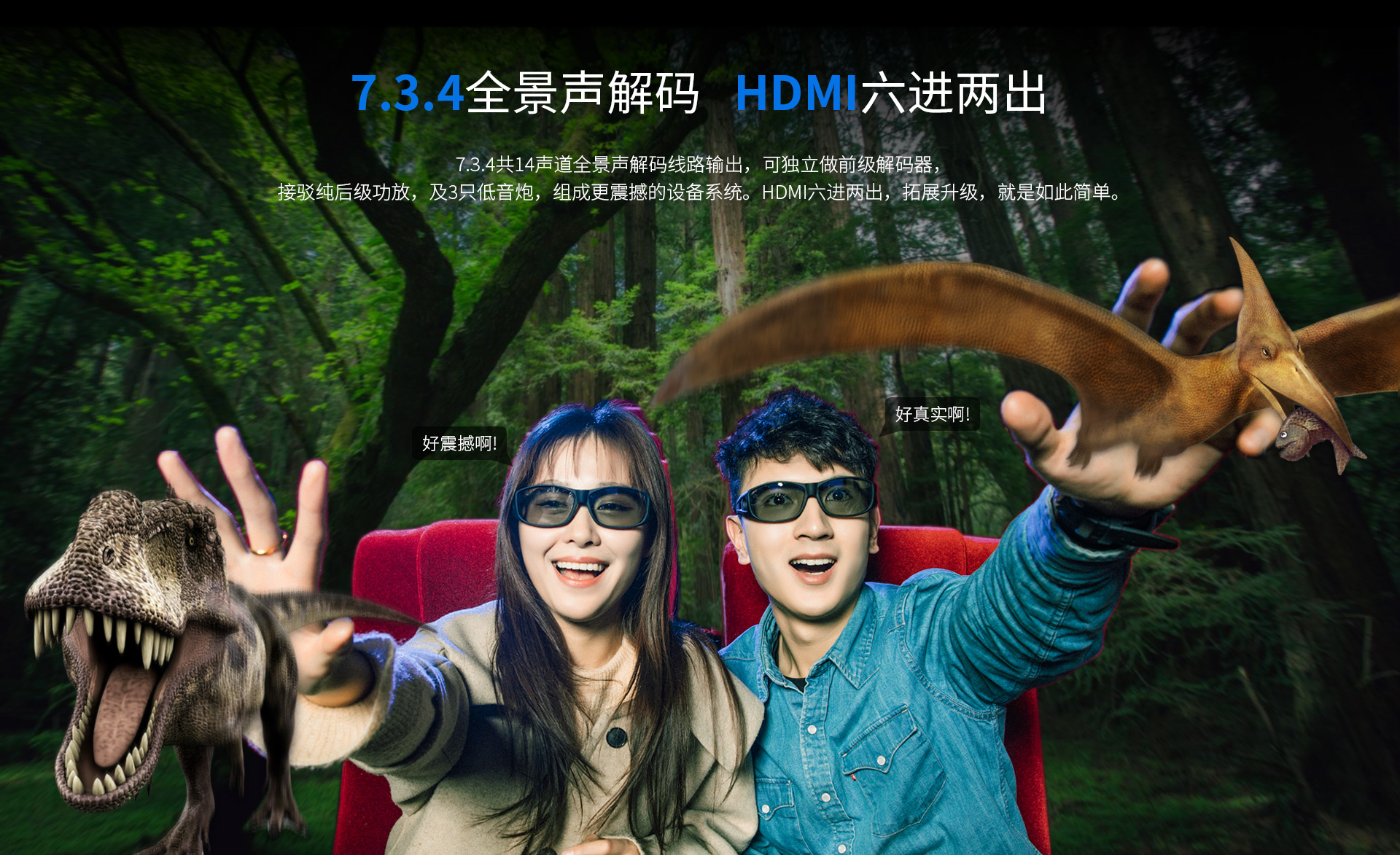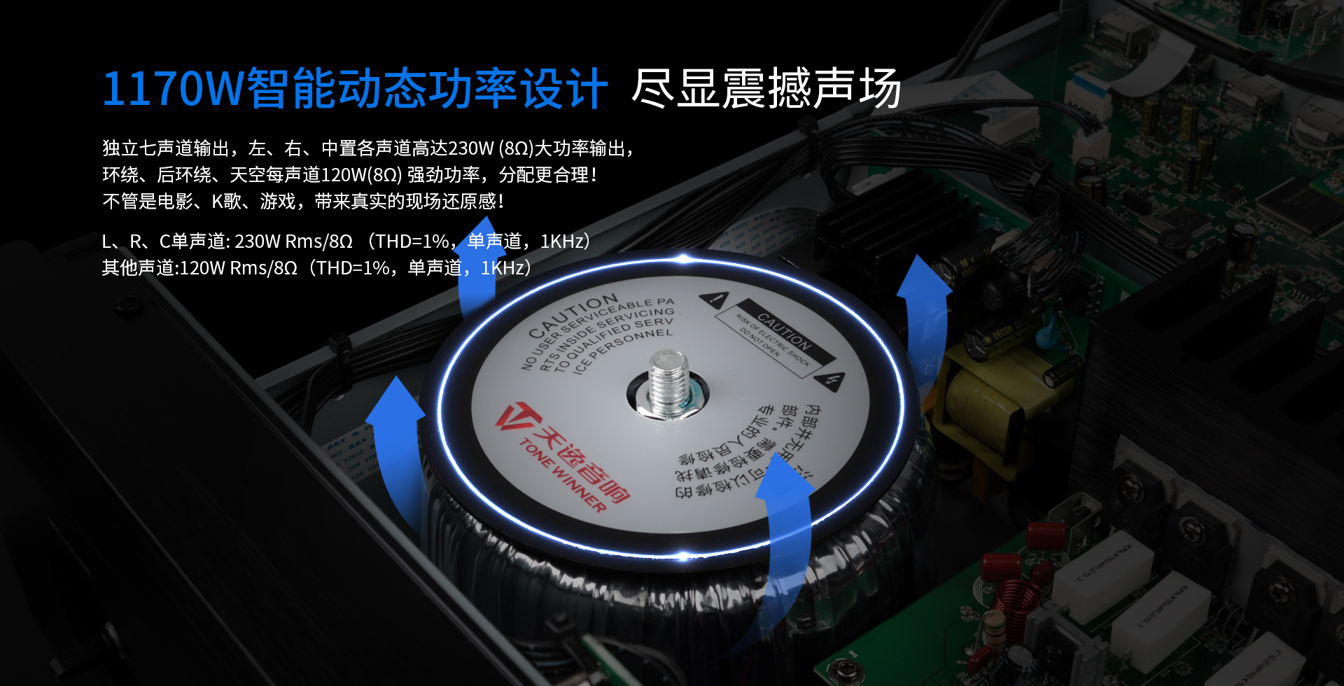 二、用料及電路設計 1.總輸出高達1170W,左、右、中置各聲道輸出230W/8Ω,環繞、天空每聲道為120W,分配更合理。 2.高效的H類電路,擁有更高的轉換效率,逼真還原影院場景。 3.智能動態電源管理,根據場景變化智能調節電源供給,隨時提供充沛功率動能。 4.智能溫控管理系統,有效提升主聲道功率輸出,同時降低整機發熱量。 5.采用日本松下MN864788作為多路HDMI輸入/輸出的重要處理芯片,Analog Devices公司的第四代SHARC浮點運算聲場處理器ADSP-21573完成DSP聲場處理,搭載兩顆經典的多功能綜合音頻處理器CS42528,全面應對Dolby Atmos和DTS:X的解碼,以及負責進行DSP聲場后處理,包括聲場虛擬及聲場擴展,并進行音效的調整和諸多喇叭的頻響曲線調整和音色校正。 6.多層沉金解碼板,其沉金工藝有效防止銅金屬氧化,板承載著大規模的電子元件和集成芯片,負責整機的各種高清解碼、HDMI高清視頻信號的處理與傳輸和卡拉OK等。