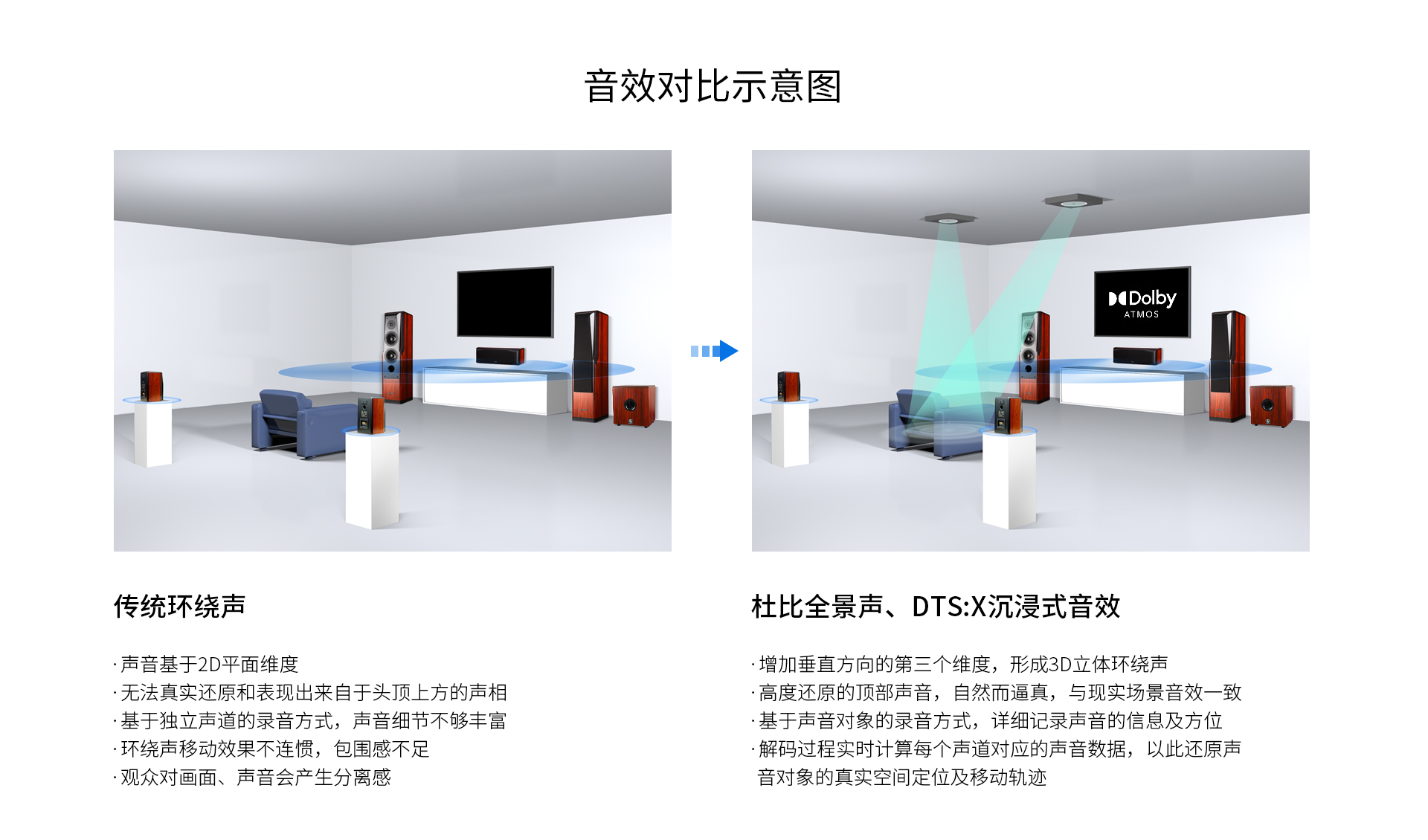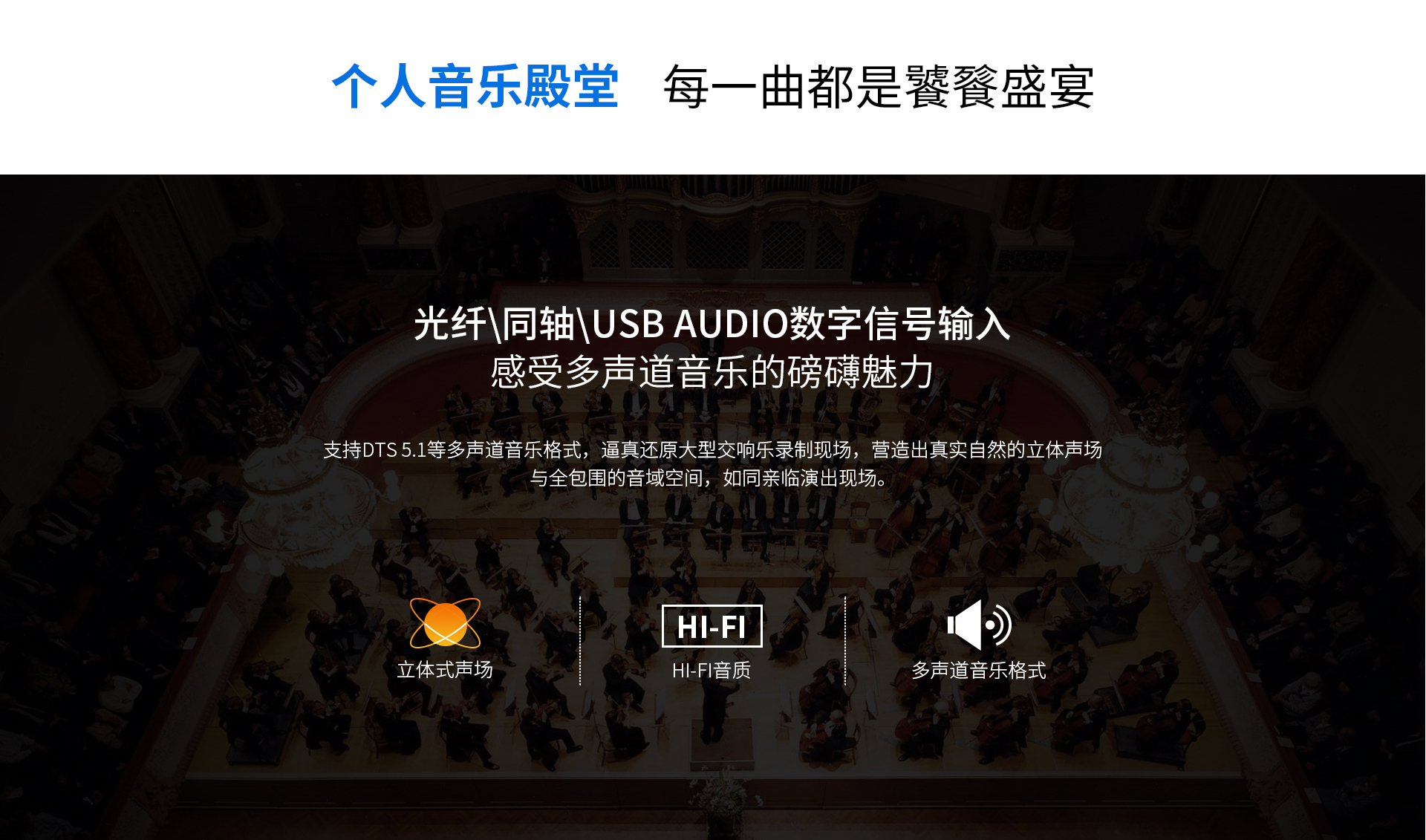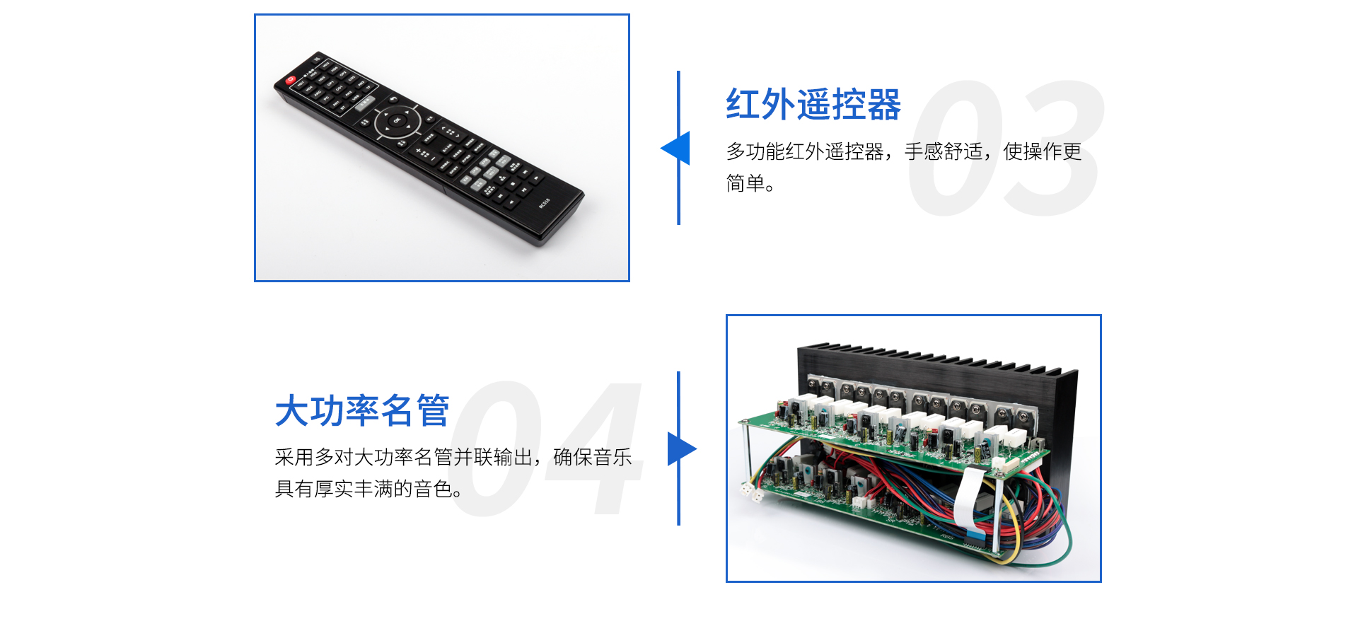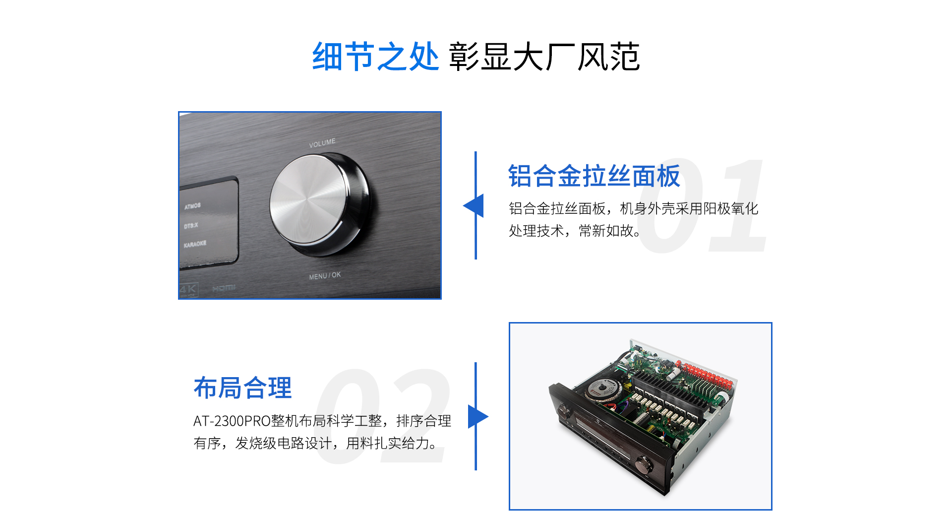 二、用料及電路設計 1.總輸出高達1170W,左、右、中置各聲道輸出230W/8Ω,環繞、天空每聲道為120W,分配更合理。 2.高效的H類電路,擁有更高的轉換效率,逼真還原影院場景。 3.智能動態電源管理,根據場景變化智能調節電源供給,隨時提供充沛功率動能。 4.智能溫控管理系統,有效提升主聲道功率輸出,同時降低整機發熱量。 5.采用日本松下MN864788作為多路HDMI輸入/輸出的重要處理芯片,Analog Devices公司的第四代SHARC浮點運算聲場處理器ADSP-21573完成DSP聲場處理,搭載兩顆經典的多功能綜合音頻處理器CS42528,全面應對Dolby Atmos和DTS:X的解碼,以及負責進行DSP聲場后處理,包括聲場虛擬及聲場擴展,并進行音效的調整和諸多喇叭的頻響曲線調整和音色校正。 6.多層沉金解碼板,其沉金工藝有效防止銅金屬氧化,板承載著大規模的電子元件和集成芯片,負責整機的各種高清解碼、HDMI高清視頻信號的處理與傳輸和卡拉OK等。