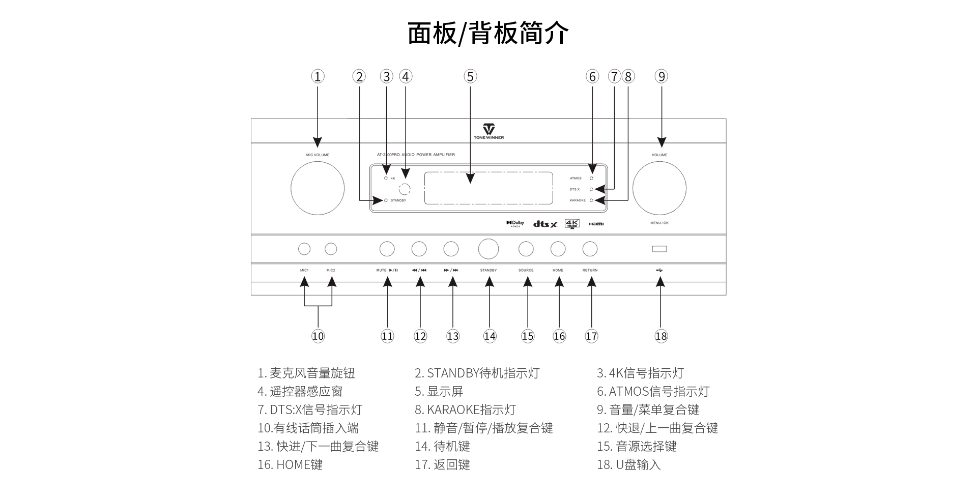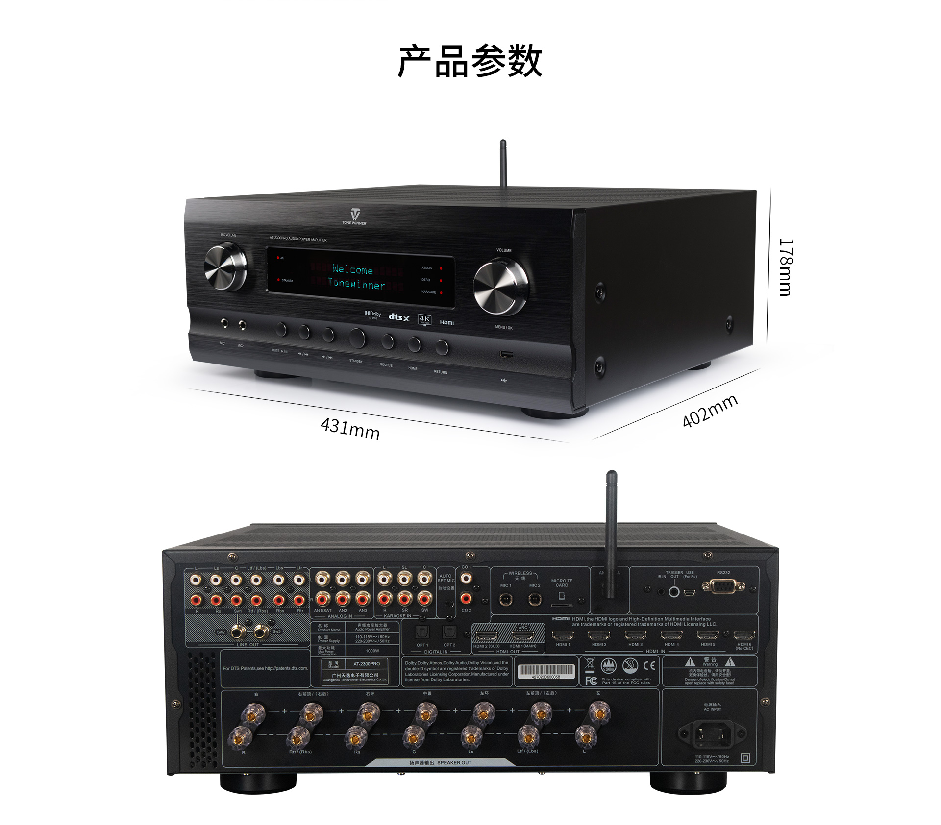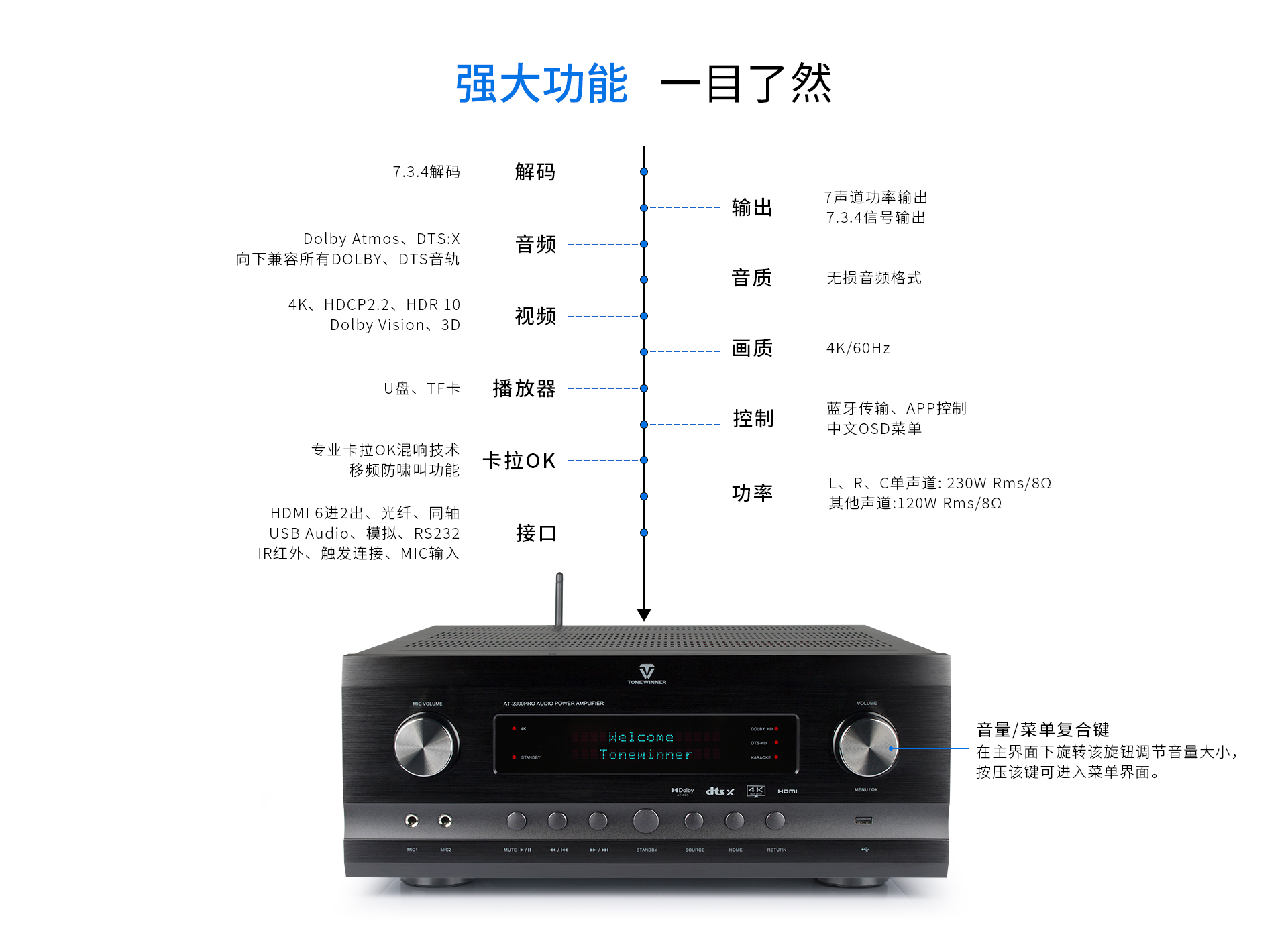 三、功能特點 1.支持Dolby Atmos、DolbyTrue-HD及向下兼容所有杜比音頻編碼文件;支持DTS:X、DTS-Master及向下兼容所有DTS音頻編碼文件。 2.支持3D、Dolby Vision及HDR 10高清視頻信號;支持4K/60Hz,RGB4:4:4、YUV4:4:4,18GHz全帶寬高清視頻信號。 3.支持HDMI2.1,支持HDCP2.2。 4.多達14聲道的全景聲7.3.4音頻解碼線路輸出。 5.內置5.1.2全景聲卡拉OK系統,強大的DSP數字混響效果及九級防嘯叫移頻處理技術,多種人聲風格選擇。 6.房間EQ、揚聲器距離、延時、聲壓的自動測試及補償,一鍵式操作,全自動校正,同時支持用戶手動調節。 7.內置高品質音樂播放器,支持藍牙傳輸,TF卡、U盤本地音頻文件播放,支持FLAC、APE、WAV、MP3等多種無損及有損壓縮音頻格式,支持多層文件夾管理。 8.支持手機APP操作。 9.全中文疊加式OSD屏幕顯示菜單。 10.支持本地音樂信息手機及電視可同步讀取顯示。 11.支持從2.0聲道到7.3.4聲道等10多種揚聲器配置。 12.支持HDMI 6進2出,支持HDMI ARC音頻回傳,支持CEC控制。 13.2組同軸2組光纖數碼音頻輸出,3組模擬音頻輸入。 14.支持5.1聲道外部混音輸入,可外掛混響器。 15.支持音視頻編組輸出,支持音視頻智能跟隨。 16.支持RS232集中控制器。 17.支持高達1000ms時長的唇音同步調節。 18.每聲道多達7~11段參數EQ。 19.支持按輸入源獨立設置及保存參數的功能。每聲道獨立EQ選擇,獨立卡拉OK控制,獨立音量調節記憶。 20.支持話筒音量及音樂音量的開機設置和最大音量限制。 21.內置全球五大測試系統之一——ETQ房間聲學自動測試校正軟件。 22.支持USB-AUDIO數字信號輸入功能。 23.支持IR紅外延長功能(需額外購買紅外延長器)。 24.支持5V連機觸發功能。 25.待機功耗低至0.3W,獲得歐美ROSE環保標準認證,以及CCC\CE\FCC全球安全標準認證。
