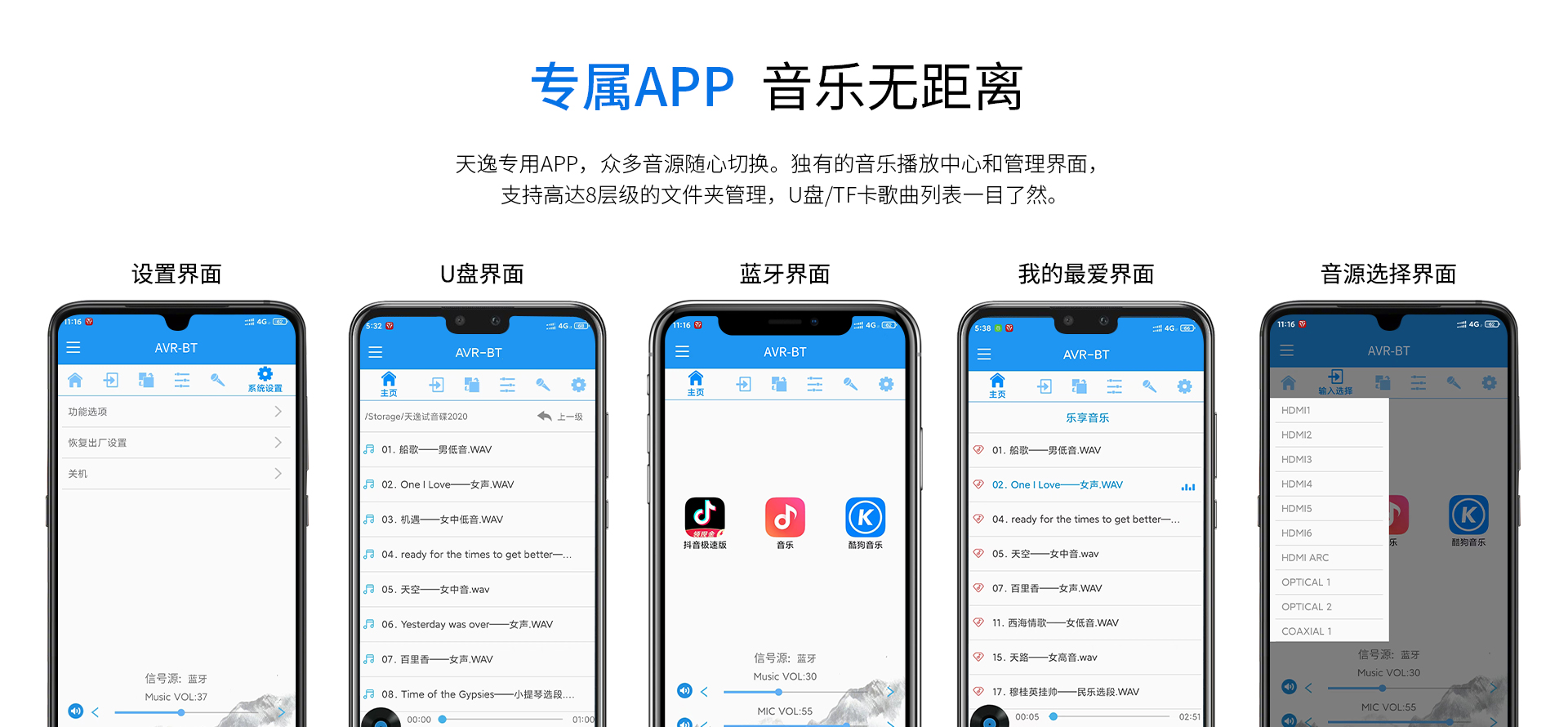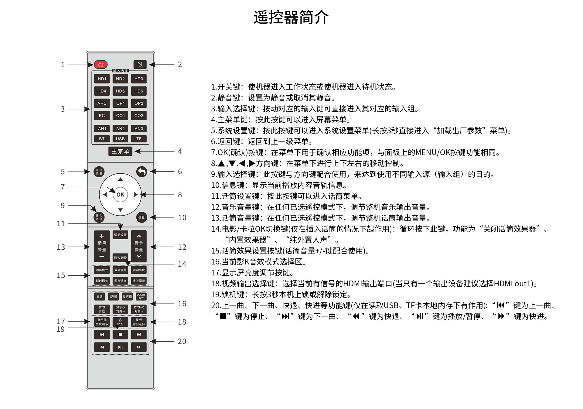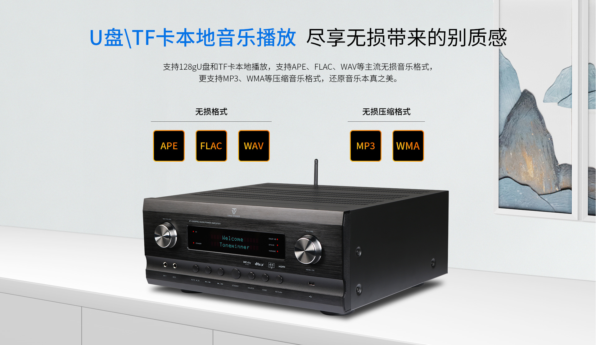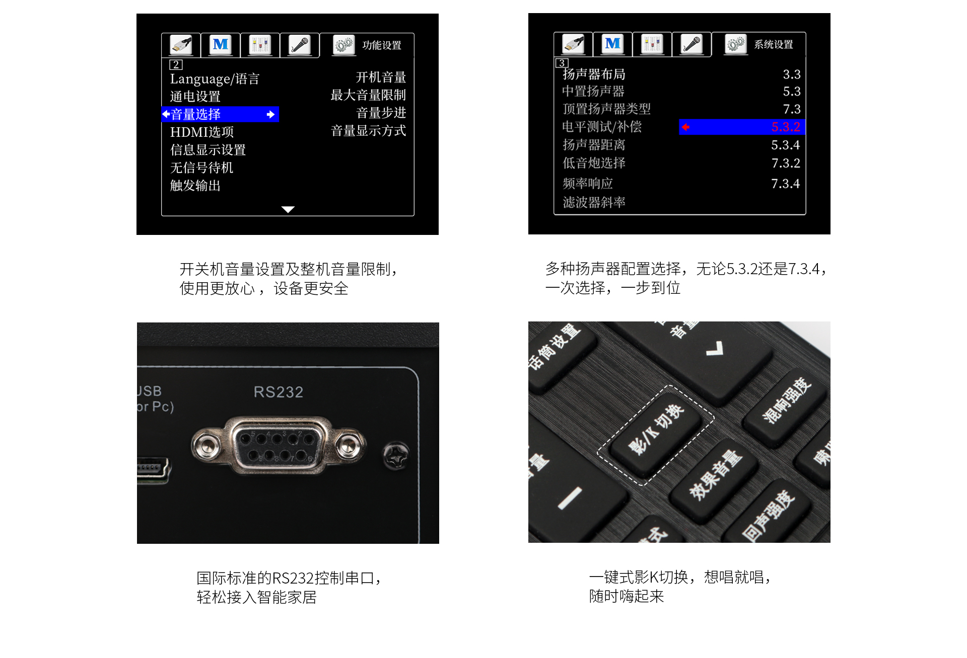 三、功能特點 1.支持Dolby Atmos、DolbyTrue-HD及向下兼容所有杜比音頻編碼文件;支持DTS:X、DTS-Master及向下兼容所有DTS音頻編碼文件。 2.支持3D、Dolby Vision及HDR 10高清視頻信號;支持4K/60Hz,RGB4:4:4、YUV4:4:4,18GHz全帶寬高清視頻信號。 3.支持HDMI2.1,支持HDCP2.2。 4.多達14聲道的全景聲7.3.4音頻解碼線路輸出。 5.內置5.1.2全景聲卡拉OK系統,強大的DSP數字混響效果及九級防嘯叫移頻處理技術,多種人聲風格選擇。 6.房間EQ、揚聲器距離、延時、聲壓的自動測試及補償,一鍵式操作,全自動校正,同時支持用戶手動調節。 7.內置高品質音樂播放器,支持藍牙傳輸,TF卡、U盤本地音頻文件播放,支持FLAC、APE、WAV、MP3等多種無損及有損壓縮音頻格式,支持多層文件夾管理。 8.支持手機APP操作。 9.全中文疊加式OSD屏幕顯示菜單。 10.支持本地音樂信息手機及電視可同步讀取顯示。 11.支持從2.0聲道到7.3.4聲道等10多種揚聲器配置。 12.支持HDMI 6進2出,支持HDMI ARC音頻回傳,支持CEC控制。 13.2組同軸2組光纖數碼音頻輸出,3組模擬音頻輸入。 14.支持5.1聲道外部混音輸入,可外掛混響器。 15.支持音視頻編組輸出,支持音視頻智能跟隨。 16.支持RS232集中控制器。 17.支持高達1000ms時長的唇音同步調節。 18.每聲道多達7~11段參數EQ。 19.支持按輸入源獨立設置及保存參數的功能。每聲道獨立EQ選擇,獨立卡拉OK控制,獨立音量調節記憶。 20.支持話筒音量及音樂音量的開機設置和最大音量限制。 21.內置全球五大測試系統之一——ETQ房間聲學自動測試校正軟件。 22.支持USB-AUDIO數字信號輸入功能。 23.支持IR紅外延長功能(需額外購買紅外延長器)。 24.支持5V連機觸發功能。 25.待機功耗低至0.3W,獲得歐美ROSE環保標準認證,以及CCC\CE\FCC全球安全標準認證。