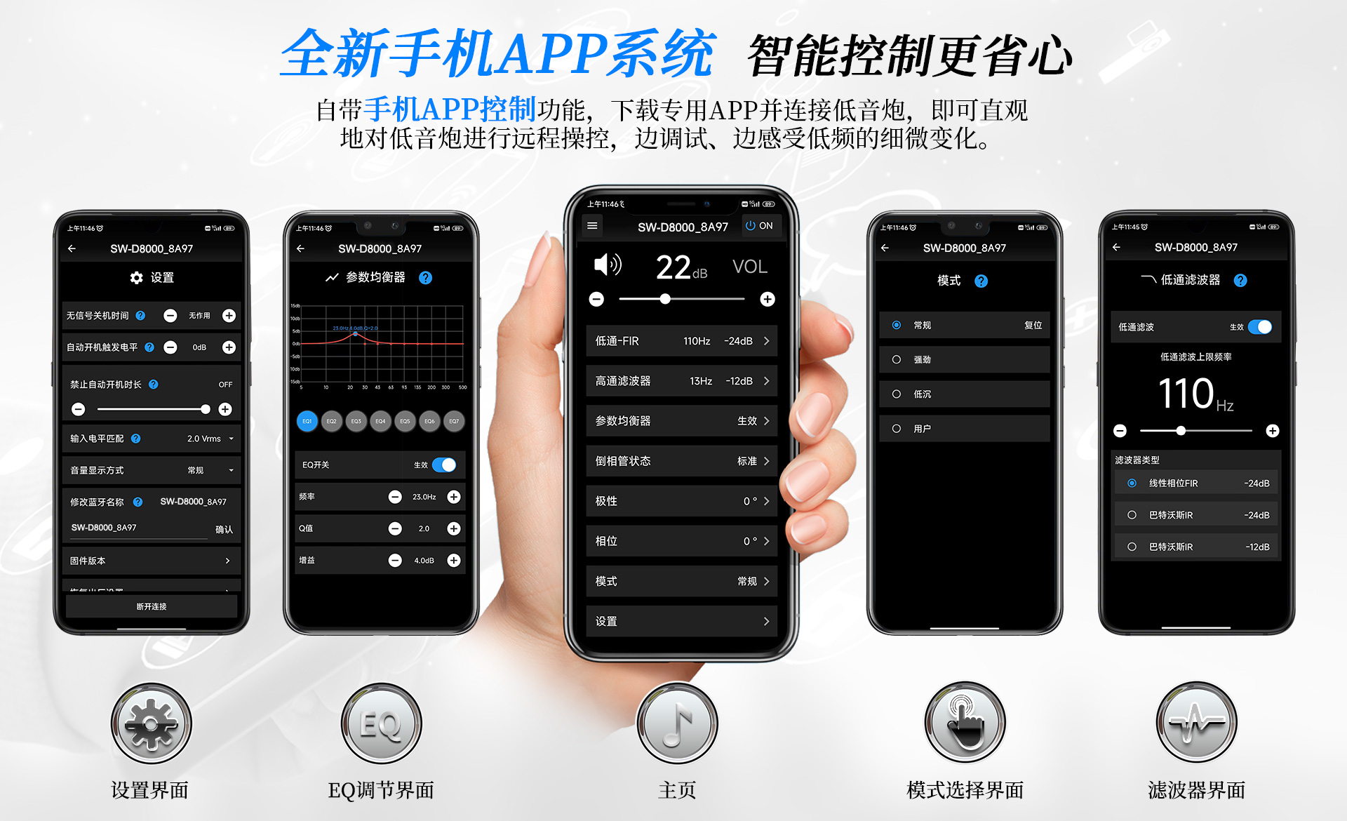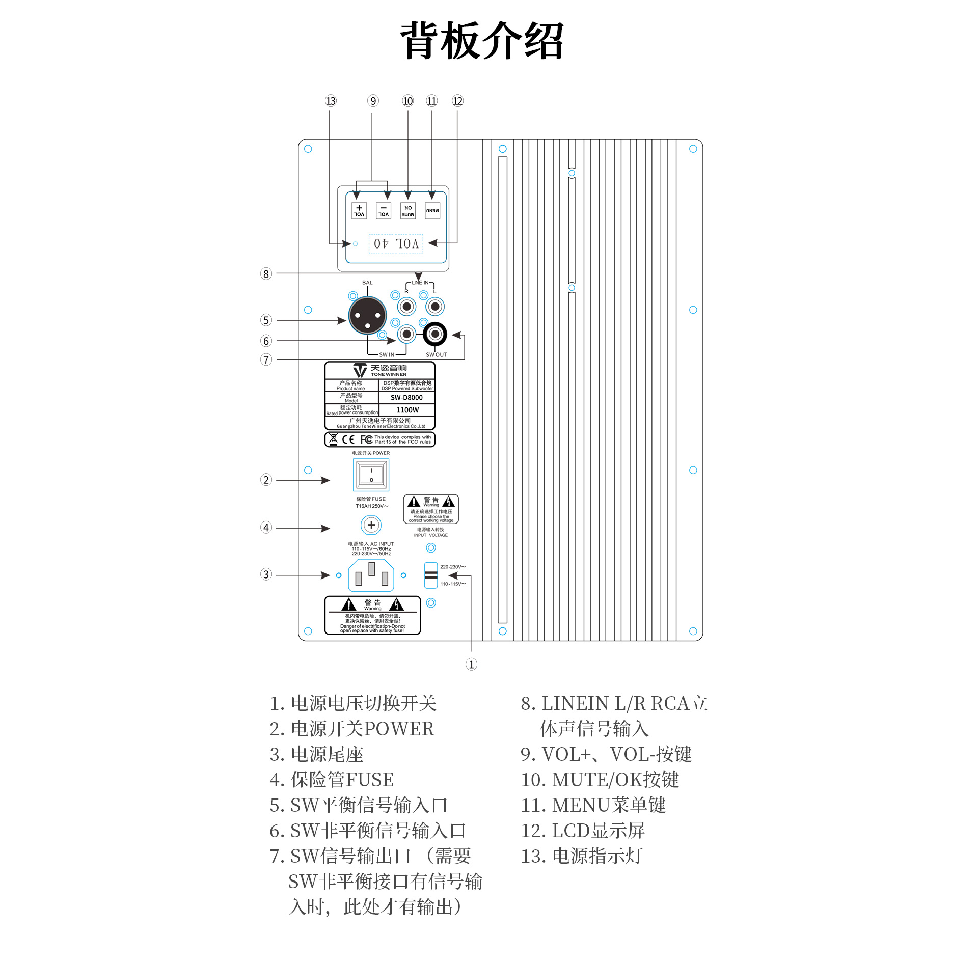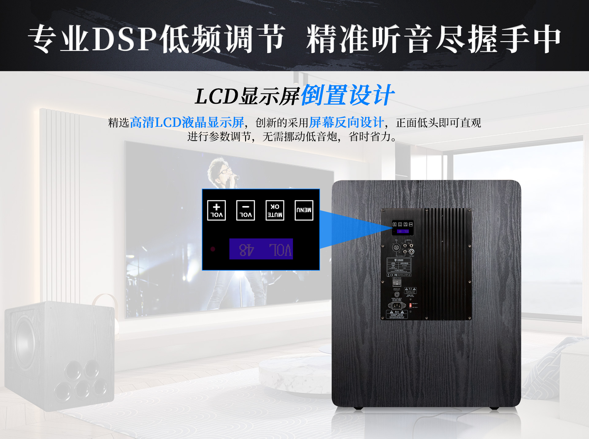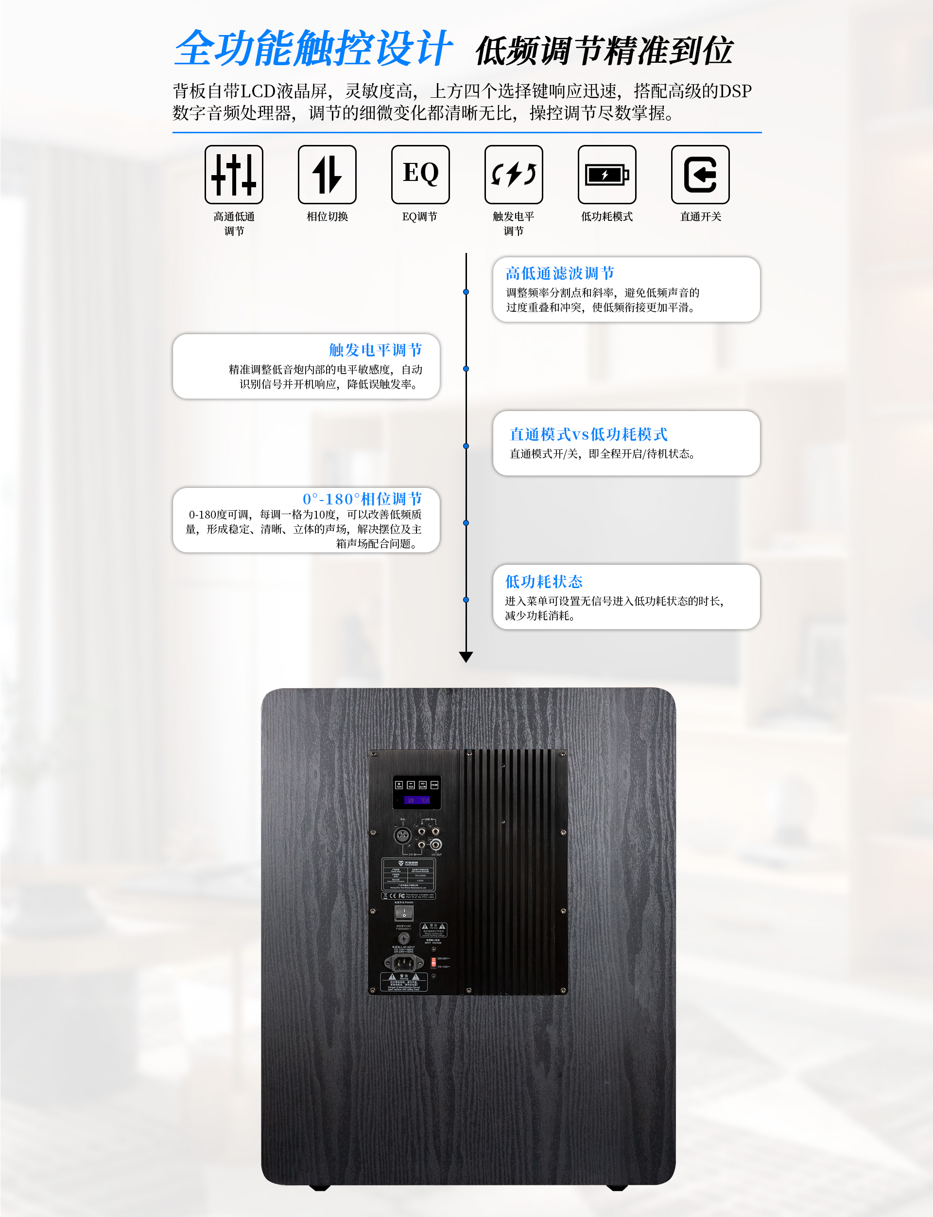 一、 功能特點(diǎn) 1. 采有高效低噪D類放大電路內(nèi)置DSP數(shù)字處理器,7段參量均衡(EQ) 任意調(diào)節(jié) 2. 雙15英寸、長(zhǎng)沖程、強(qiáng)磁、大功率喇叭單元,具有低失真、高動(dòng)態(tài)長(zhǎng)沖程等特點(diǎn); 3. 雙磁鋼設(shè)計(jì),喇叭輻射效率更高更穩(wěn)定; 4. 采用觸摸按鍵配合LCD液晶顯示屏,全功能觸控設(shè)計(jì),調(diào)校一目了然; 5. 實(shí)現(xiàn)APP遠(yuǎn)程控制,操作更便捷; 6. 實(shí)現(xiàn)APP無(wú)線操作程序升級(jí); 7. 四種低頻模式,根據(jù)聽音偏好進(jìn)行個(gè)性化調(diào)節(jié) 8. 內(nèi)置高低通濾波器,頻率范圍可調(diào)節(jié); 9. 內(nèi)置相位開關(guān),0°/180°相位切換; 10. 峰值功率P-P輸出可達(dá)8000W,重量高達(dá)68公斤; 11. 支持無(wú)信號(hào)待機(jī)功能; 12. 支持平衡、非平衡、RCA立體聲信號(hào); 13. 前置五個(gè)倒相孔,支持倒相箱、閉箱設(shè)計(jì);