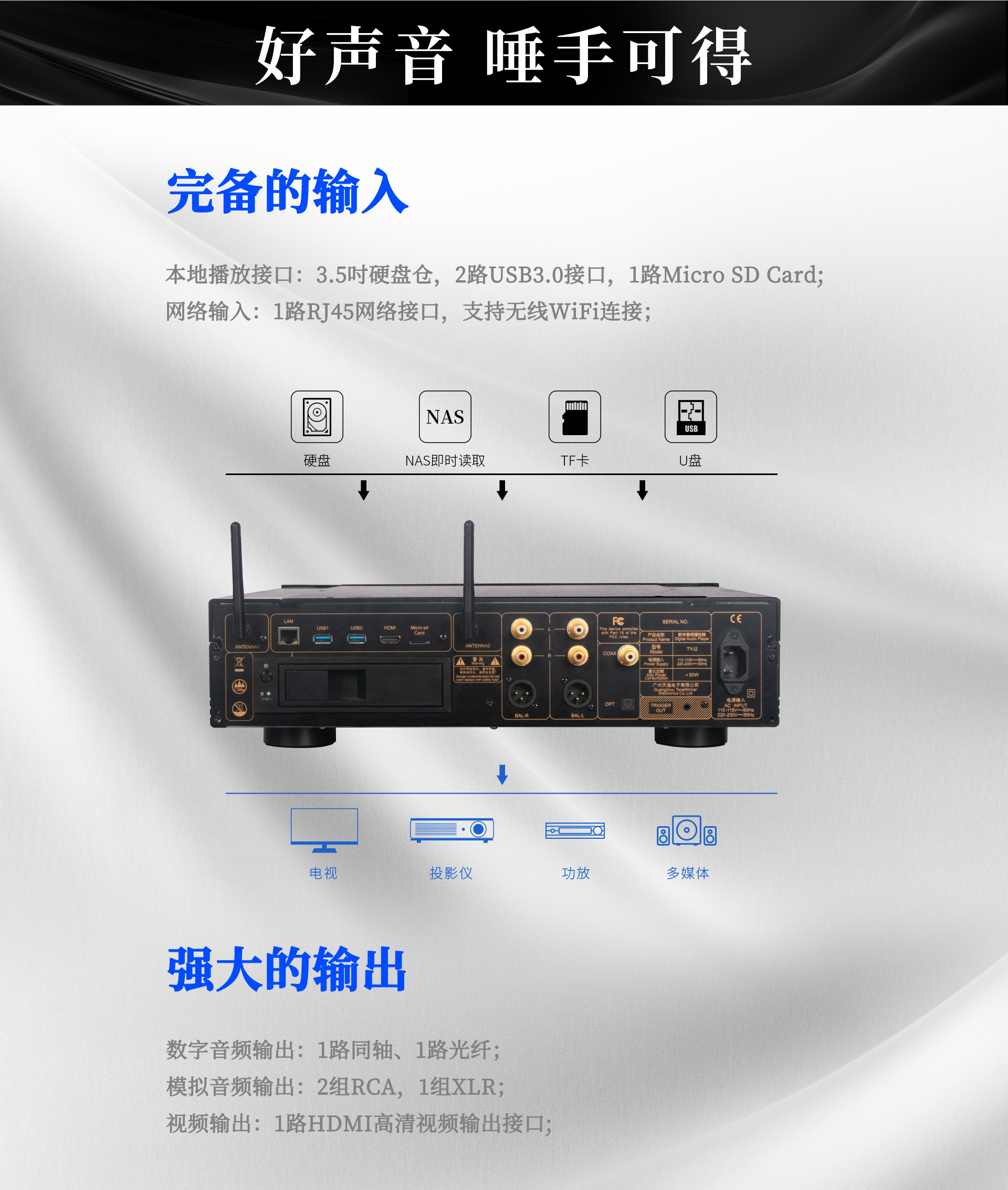三、功能特點 1. 音頻全局源碼直出,完全繞開系統SRC對采樣率和時鐘的限制; 2.支持16T HDD硬盤、4T移動硬盤、2T U盤、2T TF卡本地播放; 3. 支持千兆以太網,支持WiFi6高速傳輸,及應用在線下載; 4. 支持NAS服務器訪問與播放,支持SMB協議,支持局域網共享音樂播放; 5.支持無線投屏推送功能; 6.支持DSD(DSF、DFF、DIFF最高至512)、MP3、APE、WAV、FLAC、AIFF、SACD、CUE、DTS; 7. 支持手機APP操控,支持紅外遙控; 8. 支持HDMI連接至大屏電視同步顯示; 9. 支持機器觸控屏、手機APP、電視搭載遙控三頻互聯; 10. 支持掃描本地歌曲,根據專輯、歌手、風格等進行分類,可建立個人收藏文件夾,對海量音樂進行管理; 11. 支持系統在線升級與USB升級。