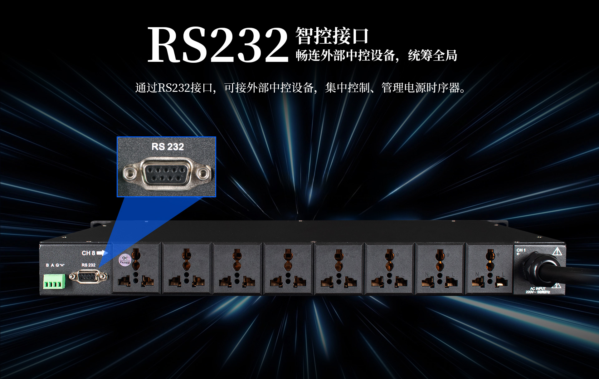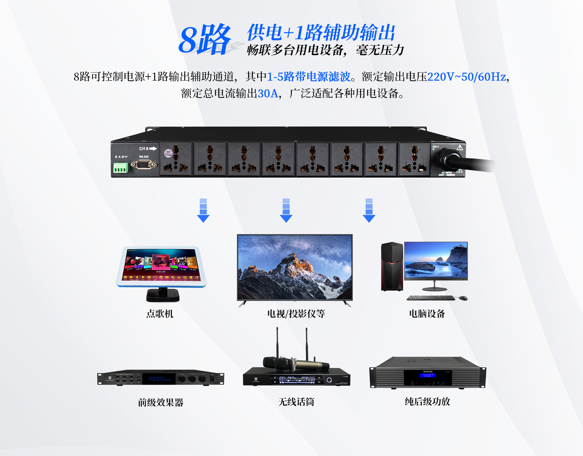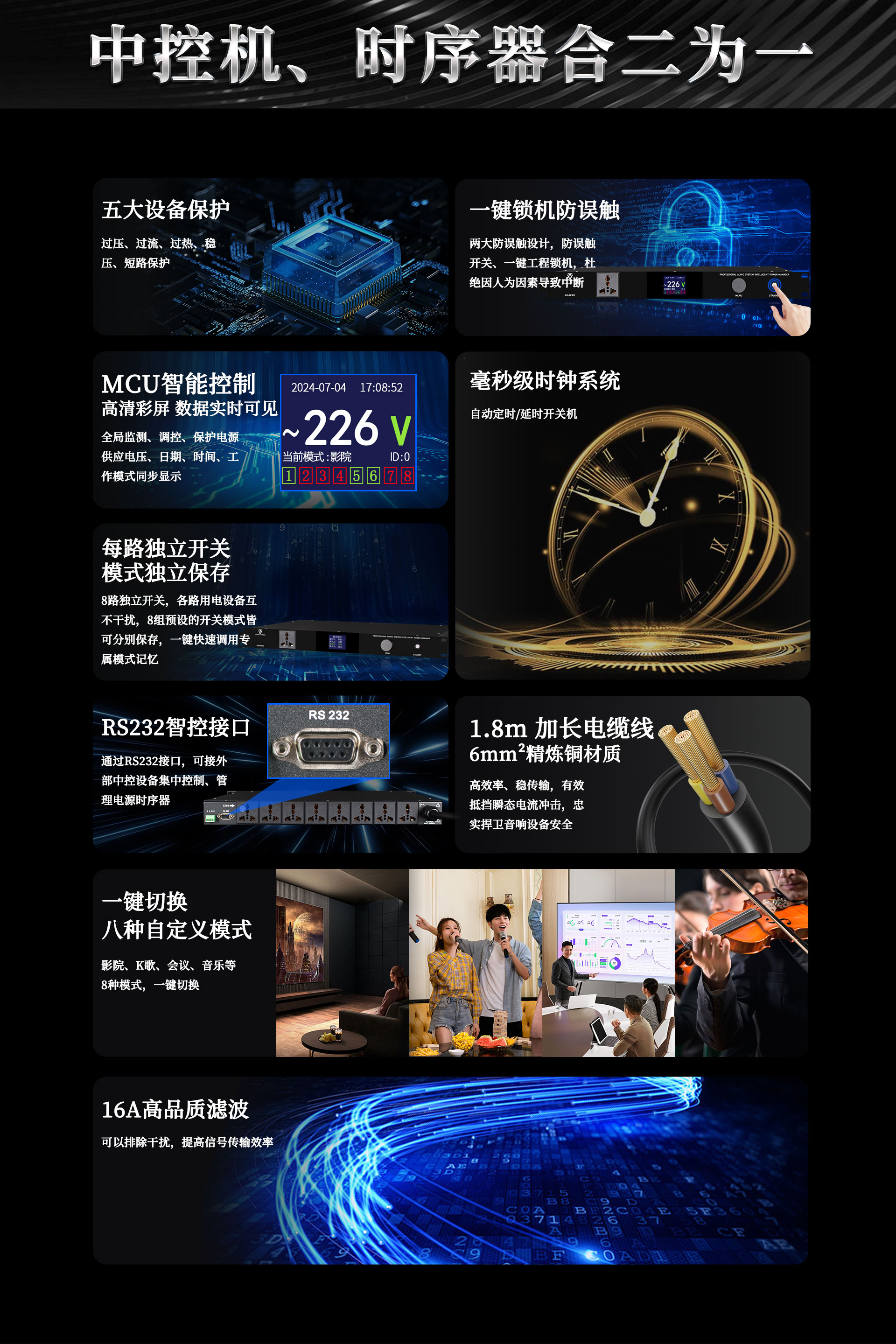 一、功能特點: 1. 一鍵切換影、K等模式; 2. RS232智能控制,支持外部中控設備控制; 3. 大功率HI-FI級電源濾波; 4. 每路獨立開關,支持8組設備開關場景數據單獨保存,一鍵快速調用; 5. 內置高精度時鐘芯片,自動開關機設定,可自由設置自動定時開關機功能; 6. 每路獨立延時開關機設定,延時開關時間0-999秒自由設置; 7. 過壓、欠壓預設定,為所有設備前置保護措施; 8. 超壓、欠壓本機自動保護,及時切斷異常電壓,保護設備不受損毀; 9. 多臺設備級順序聯控制,級聯自動檢測設置; 10. 高清彩色顯示屏,實時顯示當前電壓、日期、時間、工作模式等信息; 11. 自研MCU控制電路,精準設置和控制調用每一項獨特功能; 12. 防誤碰開關設計,降低因不當操作導致的設備工作中斷; 13. 一鍵工程鎖機,有效防止誤操作; 14. 1.8米長,6mm2精煉銅電纜線。