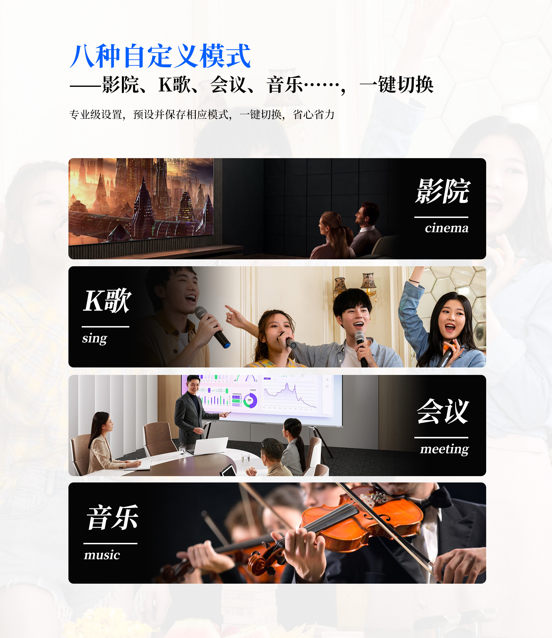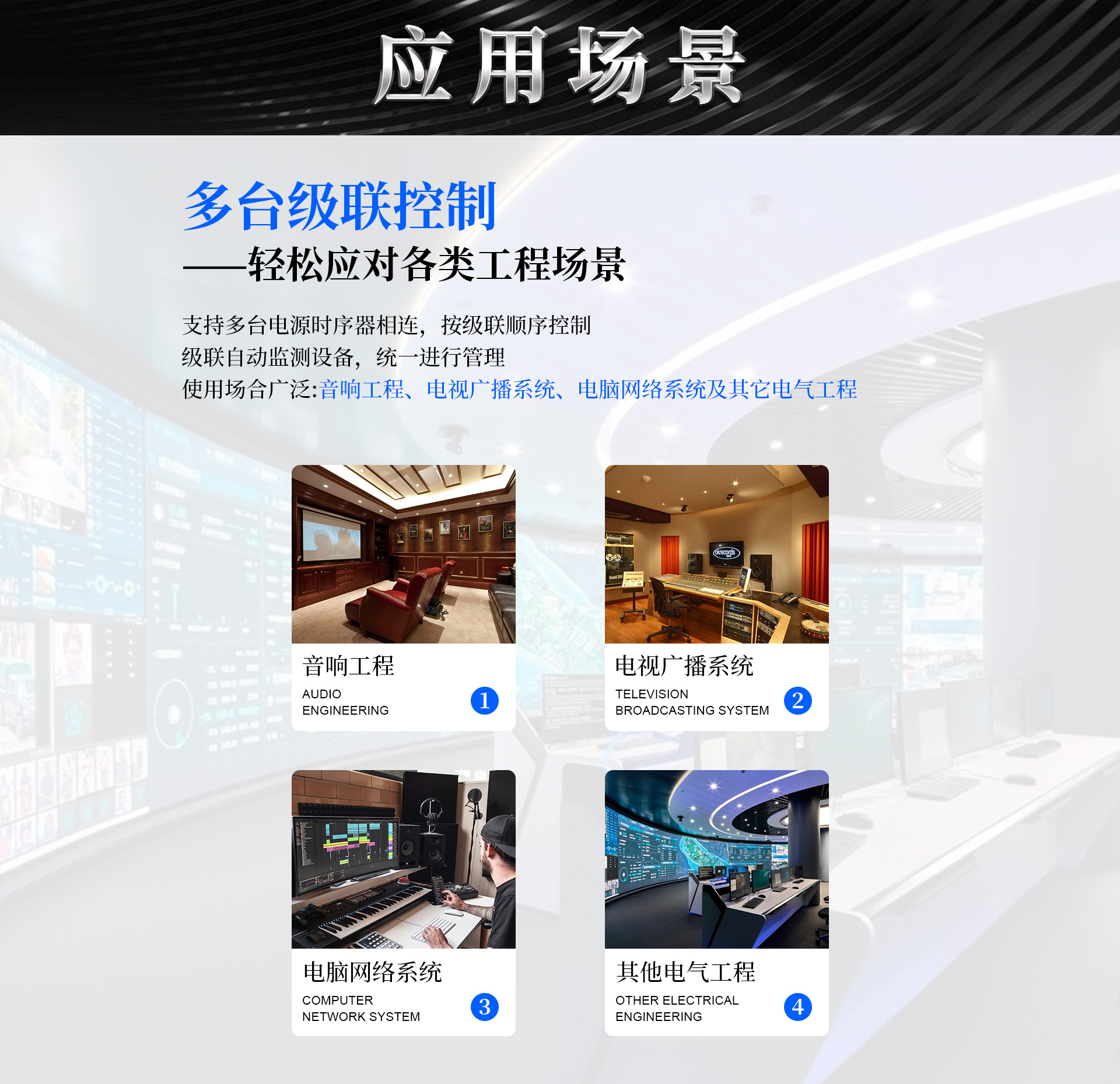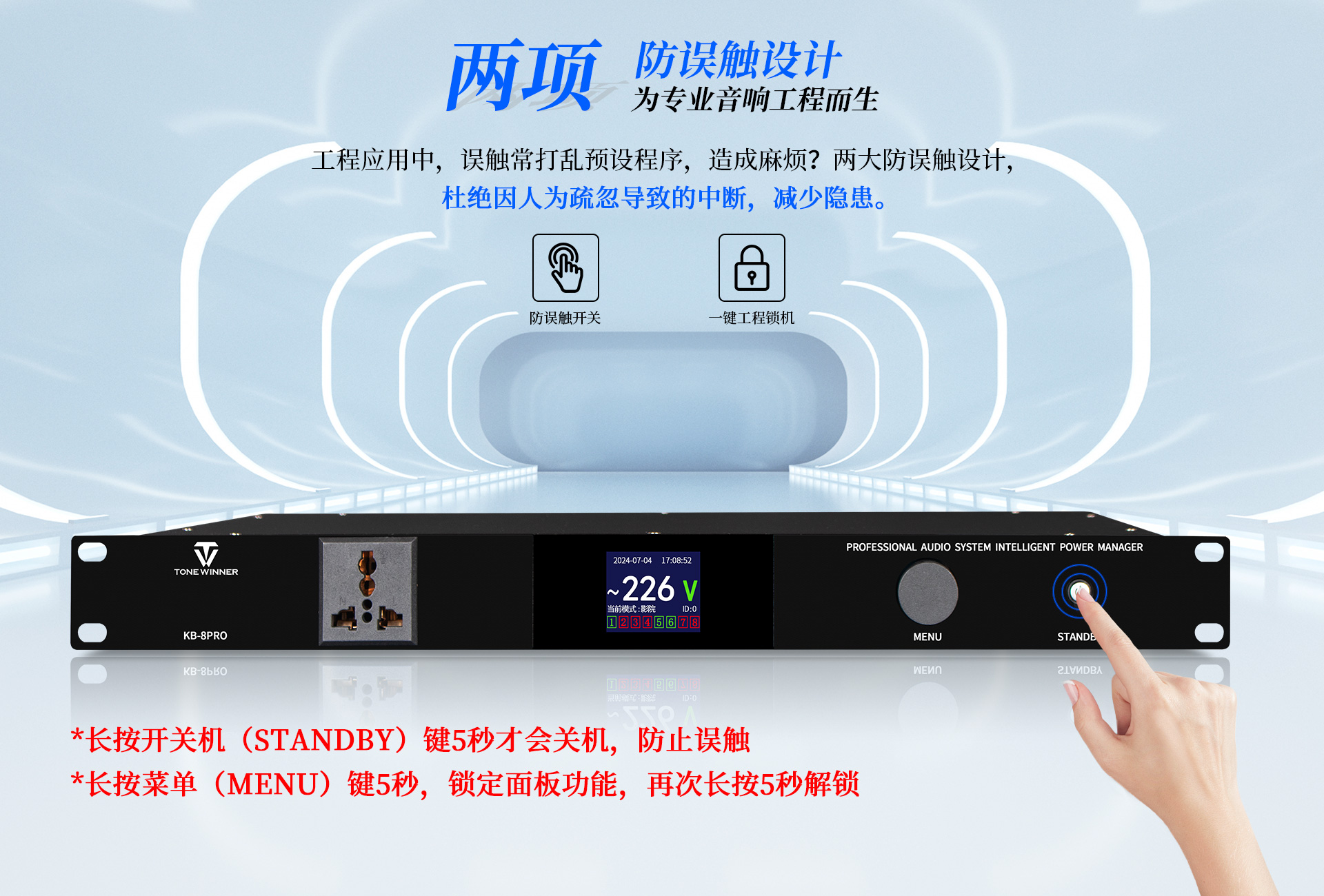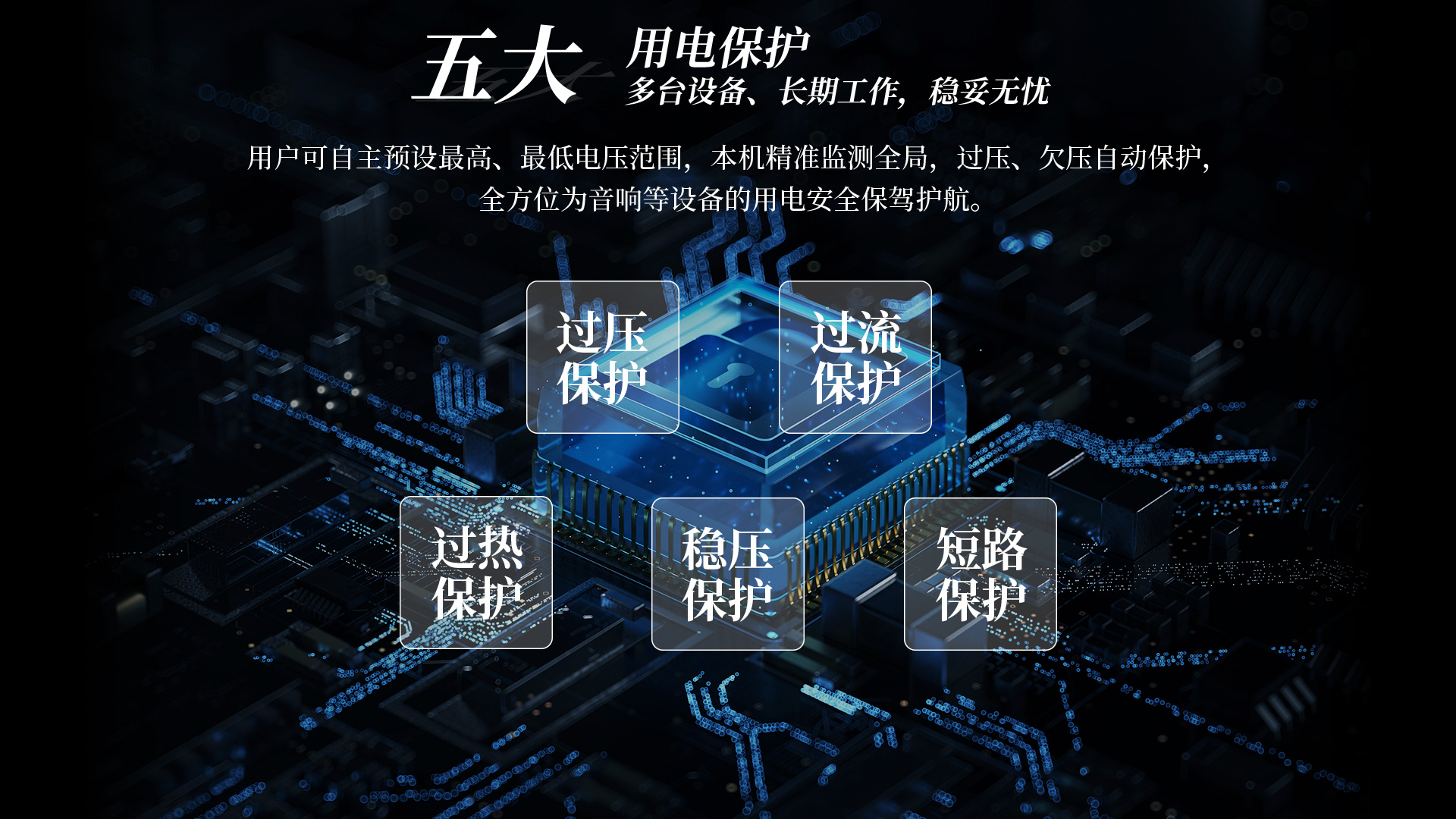 一、功能特點: 1. 一鍵切換影、K等模式; 2. RS232智能控制,支持外部中控設備控制; 3. 大功率HI-FI級電源濾波; 4. 每路獨立開關,支持8組設備開關場景數據單獨保存,一鍵快速調用; 5. 內置高精度時鐘芯片,自動開關機設定,可自由設置自動定時開關機功能; 6. 每路獨立延時開關機設定,延時開關時間0-999秒自由設置; 7. 過壓、欠壓預設定,為所有設備前置保護措施; 8. 超壓、欠壓本機自動保護,及時切斷異常電壓,保護設備不受損毀; 9. 多臺設備級順序聯控制,級聯自動檢測設置; 10. 高清彩色顯示屏,實時顯示當前電壓、日期、時間、工作模式等信息; 11. 自研MCU控制電路,精準設置和控制調用每一項獨特功能; 12. 防誤碰開關設計,降低因不當操作導致的設備工作中斷; 13. 一鍵工程鎖機,有效防止誤操作; 14. 1.8米長,6mm2精煉銅電纜線。