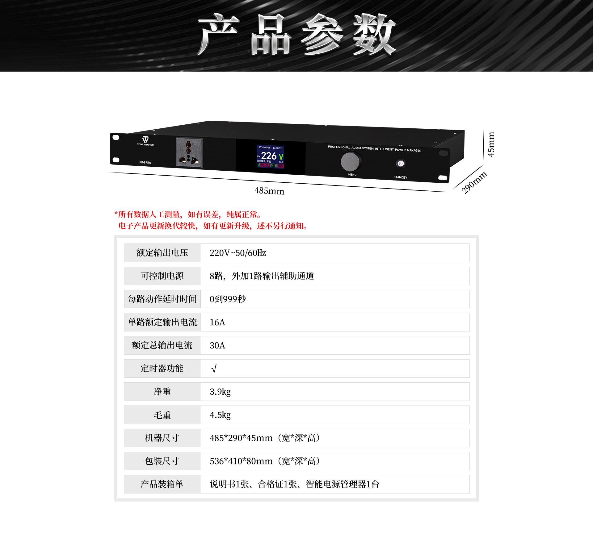 包裝尺寸:536*410*80mm(寬*深*高) | 產品裝箱單:說明書1張、合格證1張、KB-8PRO智能電源管理器1臺 |