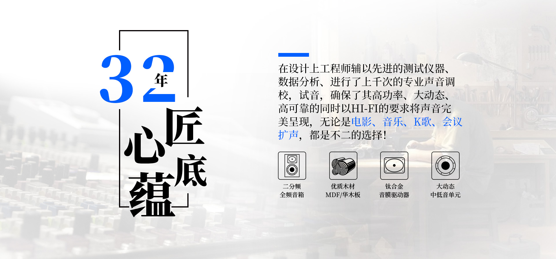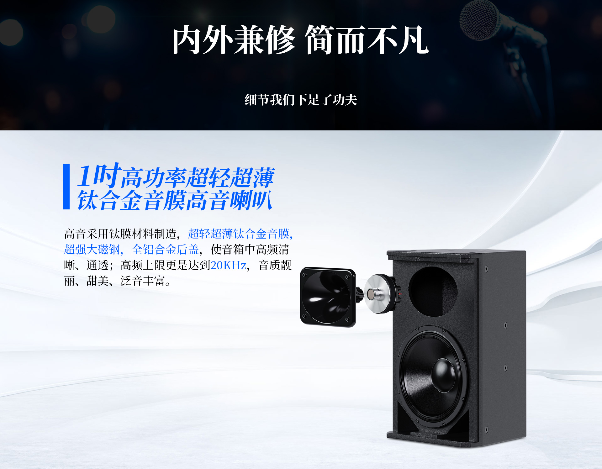 選用指向性55X100度高音號角,使音箱中高頻清晰、通透;高頻上限達更是達到18KHz,音質靚麗、甜美、泛音豐富;