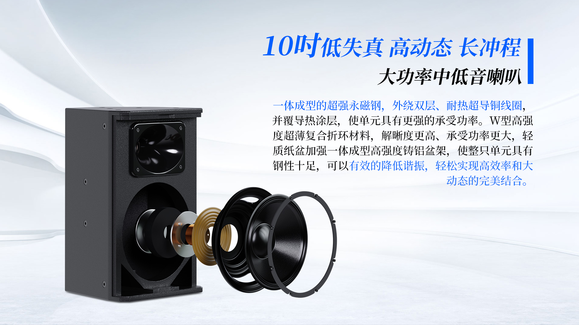 7、中低音采用140磁50芯10英寸喇叭單元;外繞雙層、耐熱超導銅線圈,并覆導熱涂層,一體成型的超強永磁鋼,使單元具有更大、更強的承受功率;W型布邊、高解晰度、緊壓、輕質紙盆、一體成型高強度鑄鋁盆架,使整只單元具有極高的鋼性,可以有效的降低諧振,輕松實現高效率和大動態的完美結合,使該低音單元具有低失真,高動態、長沖程、大功率等明顯優點,喇叭低頻下潛深厚、彈性十足。