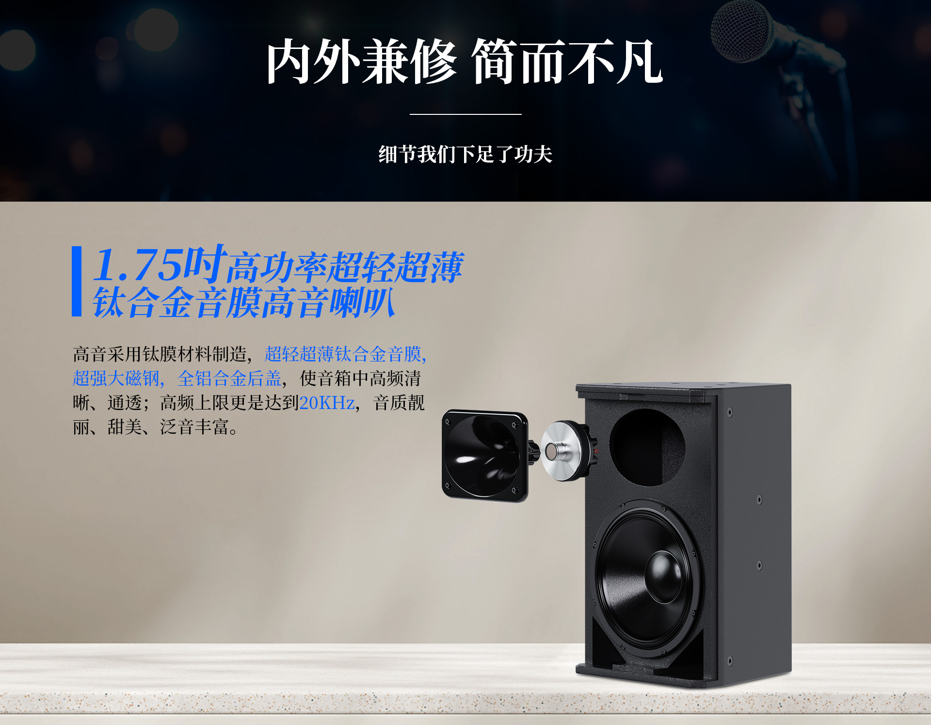 特別設(shè)計(jì)指向性55X100度高音號角,使音箱中高頻清晰、通透;高頻上限達(dá)更是達(dá)到18KHz,音質(zhì)靚麗、甜美、泛音豐富;