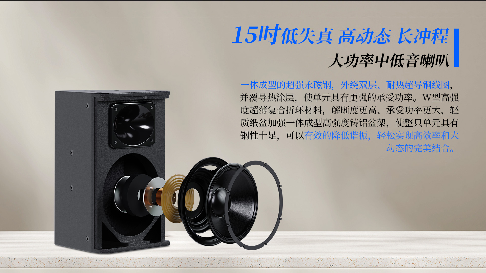 7、中低音采用190磁75芯15英寸喇叭單元;外繞雙層、耐熱超導(dǎo)銅線圈,并覆導(dǎo)熱涂層,一體成型的超強(qiáng)永磁鋼,使單元具有更大、更強(qiáng)的承受功率;W型布邊、高解晰度、緊壓、輕質(zhì)紙盆、一體成型高強(qiáng)度鑄鋁盆架,使整只單元具有極高的鋼性,可以有效的降低諧振,輕松實(shí)現(xiàn)高效率和大動(dòng)態(tài)的完美結(jié)合,使該低音單元具有低失真,高動(dòng)態(tài)、長沖程、大功率等明顯優(yōu)點(diǎn),喇叭低頻下潛深厚、彈性十足。