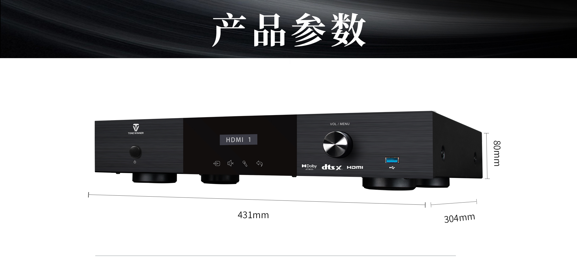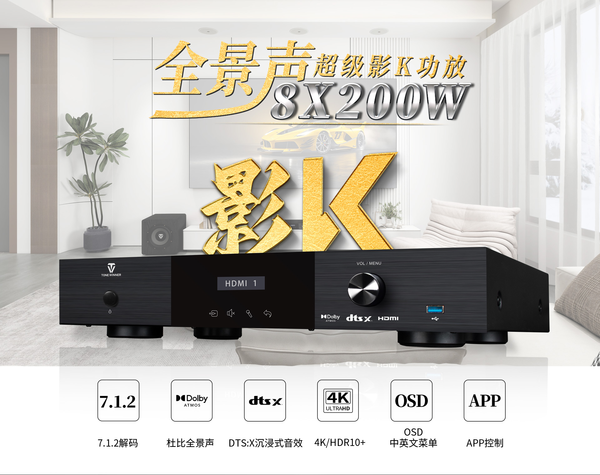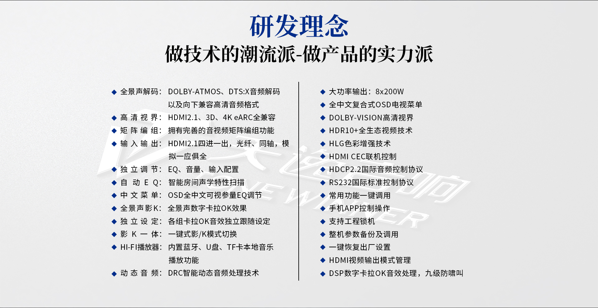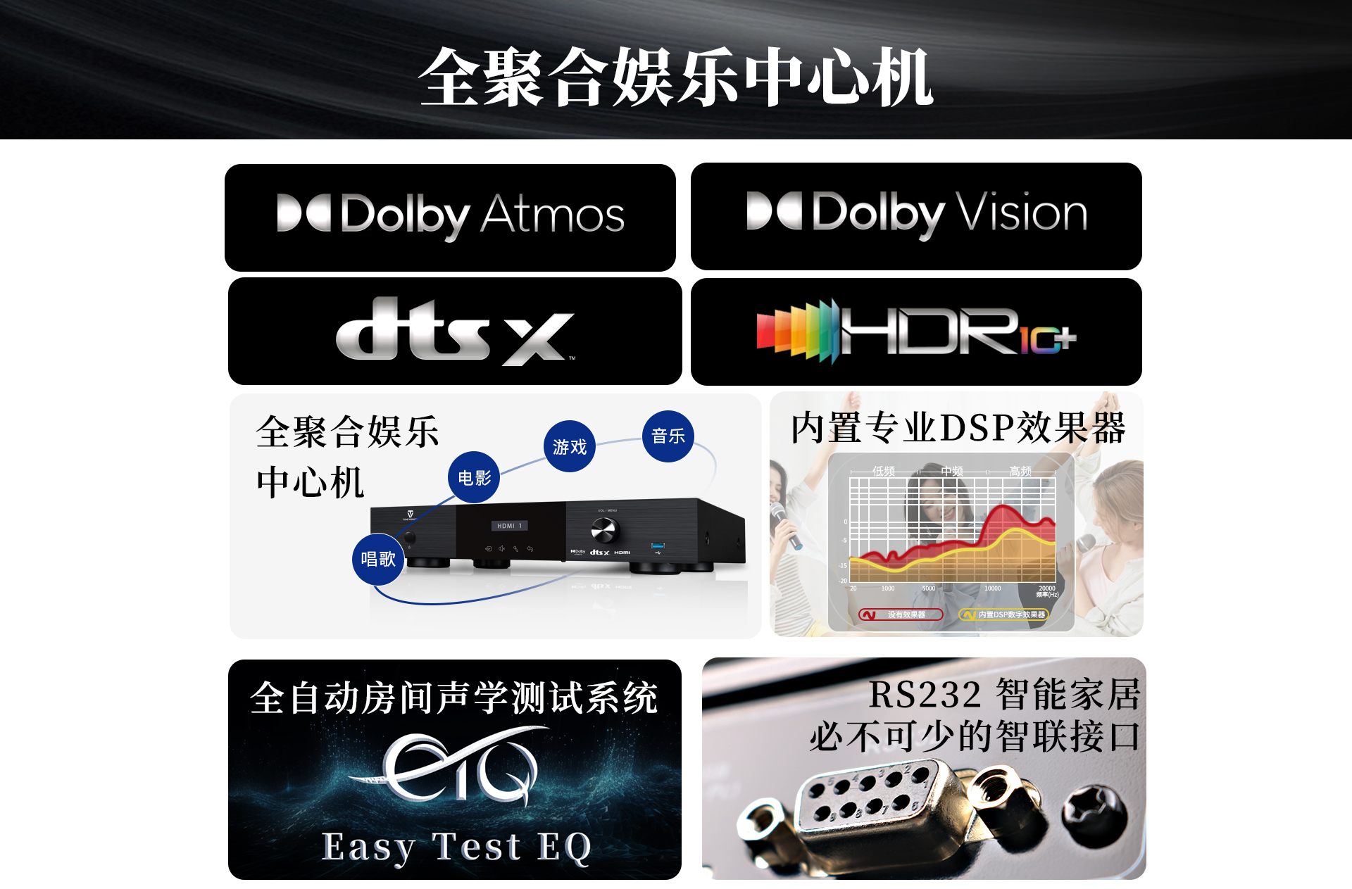 二、功能特點 1、支持DolbyAtmos、DolbyTrue-HD、DTS:X、DTS-Master及向下兼容所有音頻編碼文件;支持HDMI2.1,支持HDCP2.2加密協議; 2、支持3D立體電影,支持4K/60HZ,RGB4:4:4等格式; 3、支持Dolby Vision及HDR 10+超高清視頻信號; 4、5.1,5.1.2,5.1.4,7.1,7.1.2多種揚聲器列陣組合任意調整,觀影更震撼,聲場更廣闊720度全景立體包圍,沉浸式聲場,身臨其境般感受; 5、多聲道沉浸式卡拉OK體驗,預設多種演唱風格; 6、支持HDMI eARC音頻回傳;支持CEC控制; 7、支持HDMI4進1出,光纖、同軸接口一應俱全; 8、內置全球五大測試系統之--ETQ房間聲學自動測試校正軟件; 9、支持藍牙/U盤/TF卡無損音樂播放,支持手機APP操作; 10、內置無線發射器,支持最高拓展至5.1.4全景聲; 11、內置8聲道大功率輸出,總輸出功率高達1600W; 12、支持RS232智能控制; 13、支持OSD全中文菜單操作顯示,畫中畫可視調整更直觀; 14、支持按輸入源獨立設置及保存參數的功能; 15、支持音視頻混搭編組; 16、開關機狀態記憶功能; 17、支持整機參數備份及調用; 18、支持用戶參數保存及調用設置; 19、7~11段參數EQ滿足個性聲音喜好調節; 20、內置多種觀影模式及K歌模式,輕松調用; 21、預設多種揚聲器布局方式,一鍵調用,輕松設置; 22、面板簡潔時尚,觸摸式樣功能鍵。