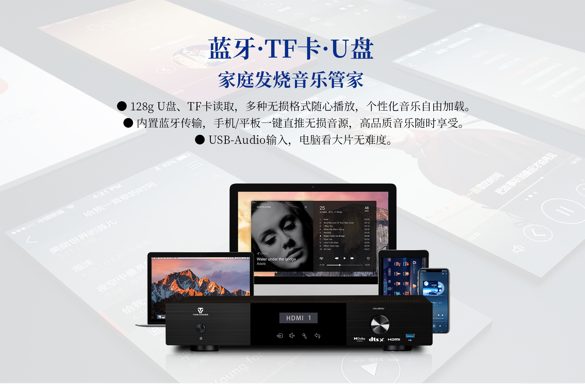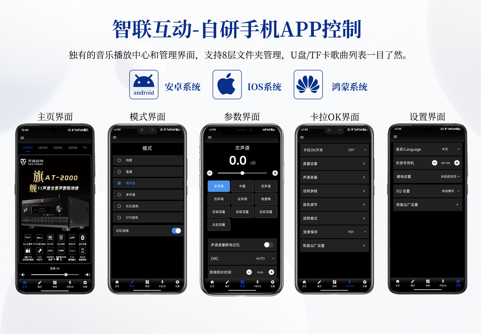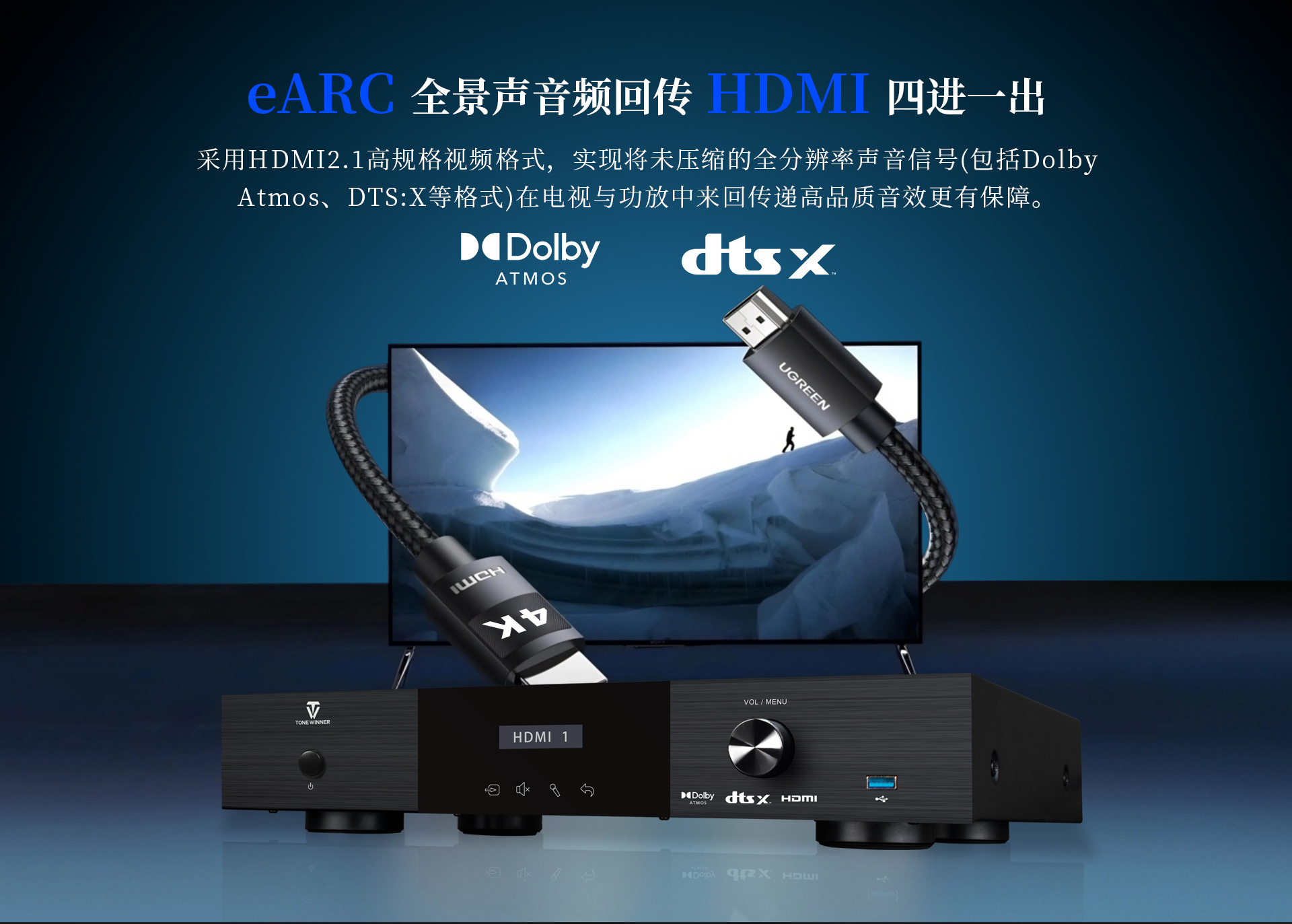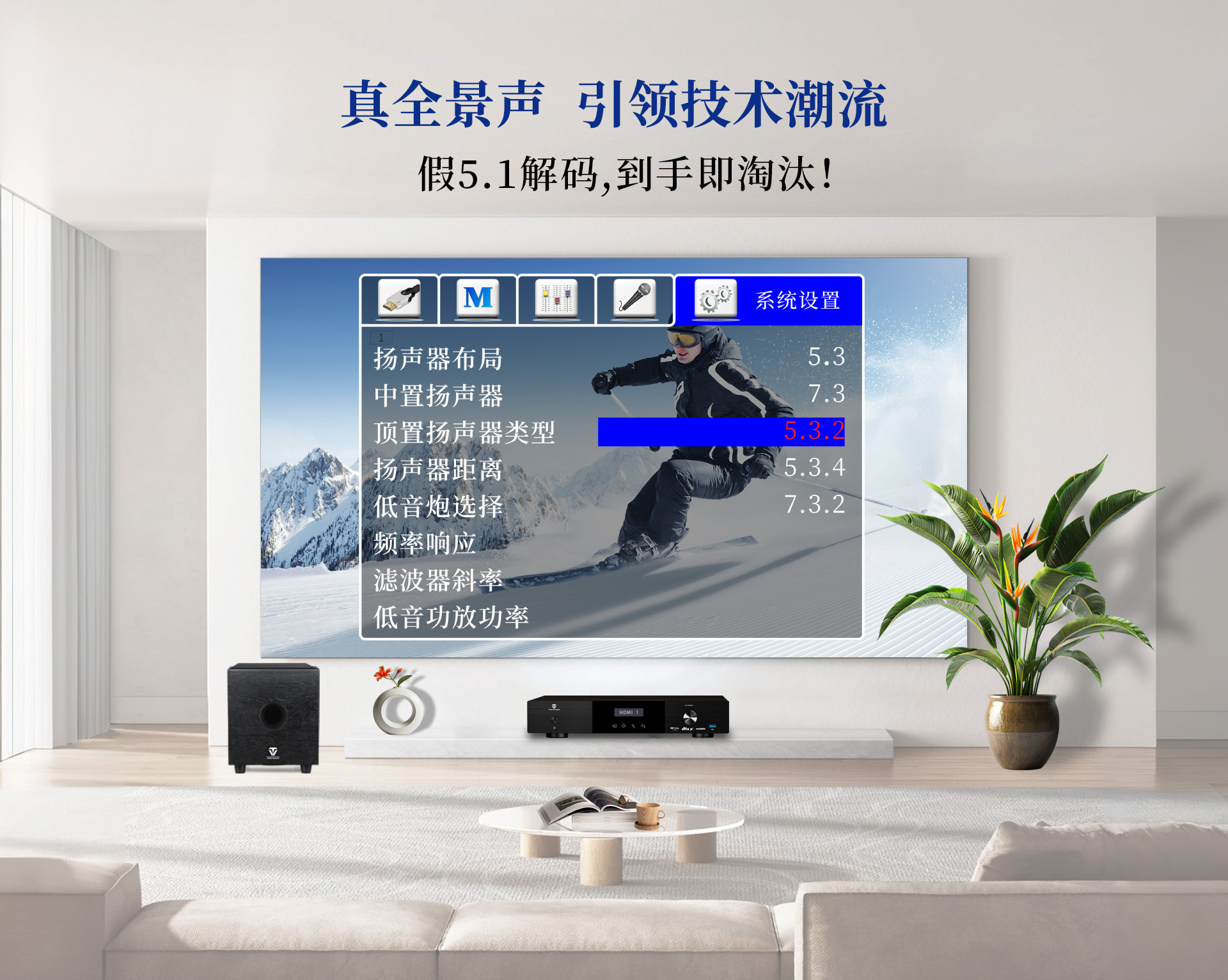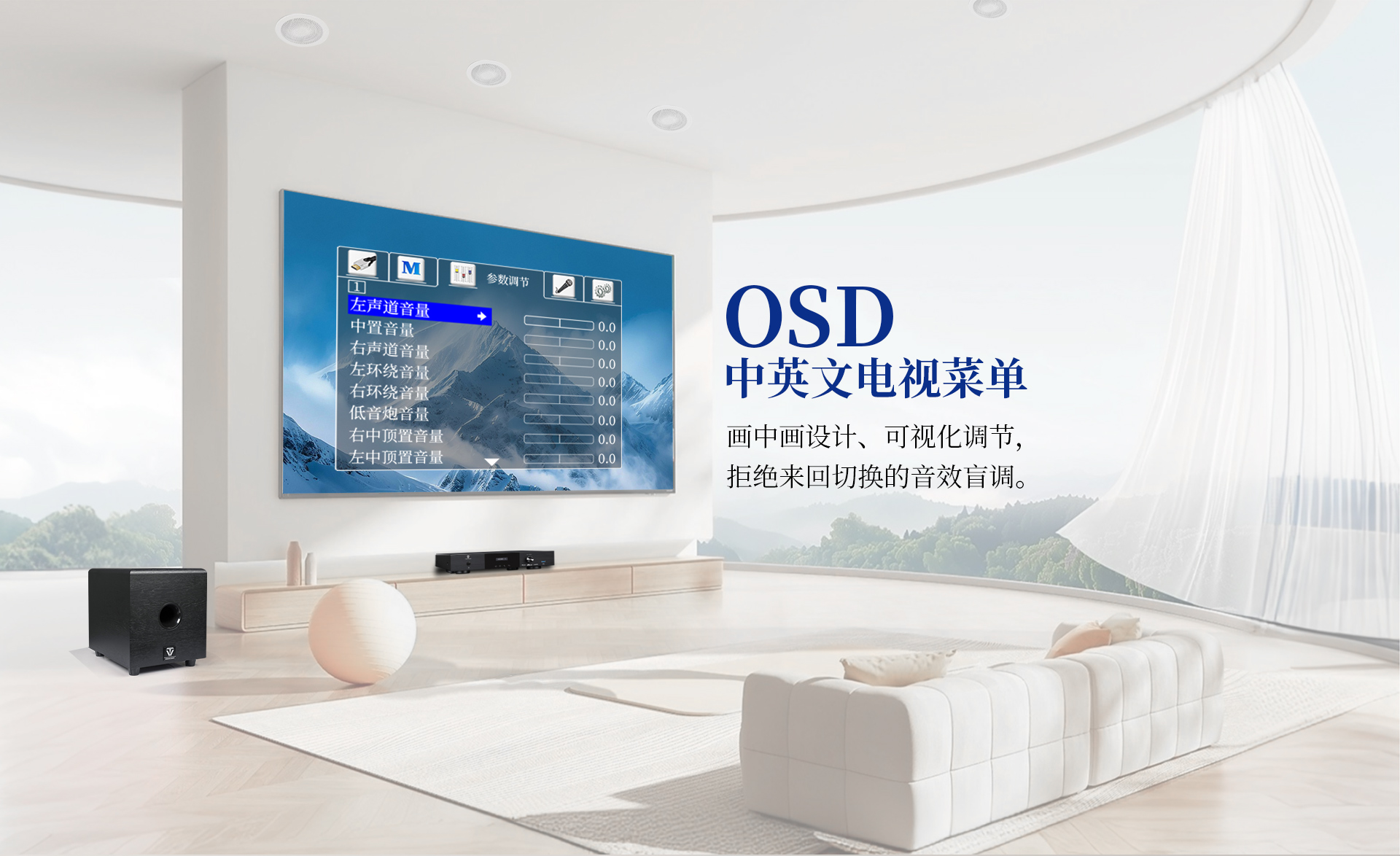 二、功能特點 1、支持DolbyAtmos、DolbyTrue-HD、DTS:X、DTS-Master及向下兼容所有音頻編碼文件;支持HDMI2.1,支持HDCP2.2加密協議; 2、支持3D立體電影,支持4K/60HZ,RGB4:4:4等格式; 3、支持Dolby Vision及HDR 10+超高清視頻信號; 4、5.1,5.1.2,5.1.4,7.1,7.1.2多種揚聲器列陣組合任意調整,觀影更震撼,聲場更廣闊720度全景立體包圍,沉浸式聲場,身臨其境般感受; 5、多聲道沉浸式卡拉OK體驗,預設多種演唱風格; 6、支持HDMI eARC音頻回傳;支持CEC控制; 7、支持HDMI4進1出,光纖、同軸接口一應俱全; 8、內置全球五大測試系統之--ETQ房間聲學自動測試校正軟件; 9、支持藍牙/U盤/TF卡無損音樂播放,支持手機APP操作; 10、內置無線發射器,支持最高拓展至5.1.4全景聲; 11、內置8聲道大功率輸出,總輸出功率高達1600W; 12、支持RS232智能控制; 13、支持OSD全中文菜單操作顯示,畫中畫可視調整更直觀; 14、支持按輸入源獨立設置及保存參數的功能; 15、支持音視頻混搭編組; 16、開關機狀態記憶功能; 17、支持整機參數備份及調用; 18、支持用戶參數保存及調用設置; 19、7~11段參數EQ滿足個性聲音喜好調節; 20、內置多種觀影模式及K歌模式,輕松調用; 21、預設多種揚聲器布局方式,一鍵調用,輕松設置; 22、面板簡潔時尚,觸摸式樣功能鍵。
