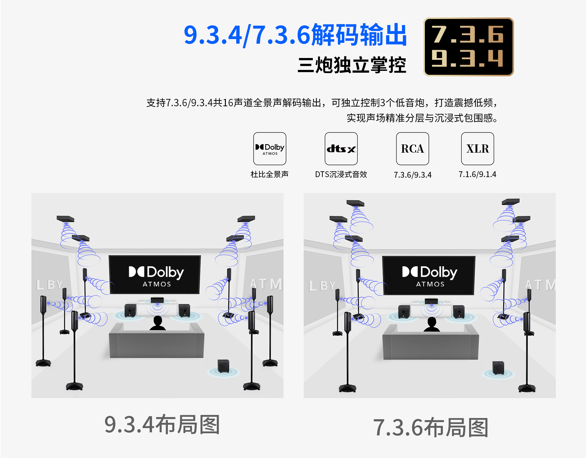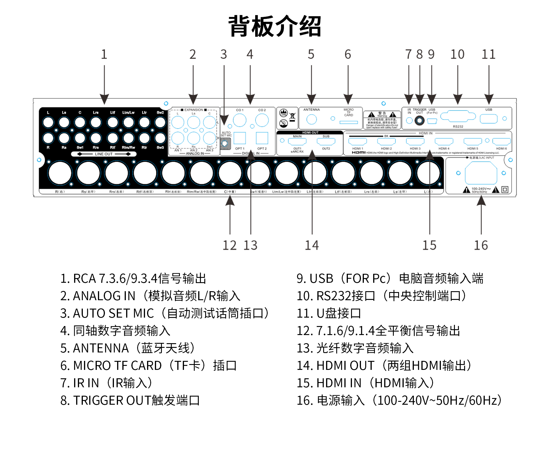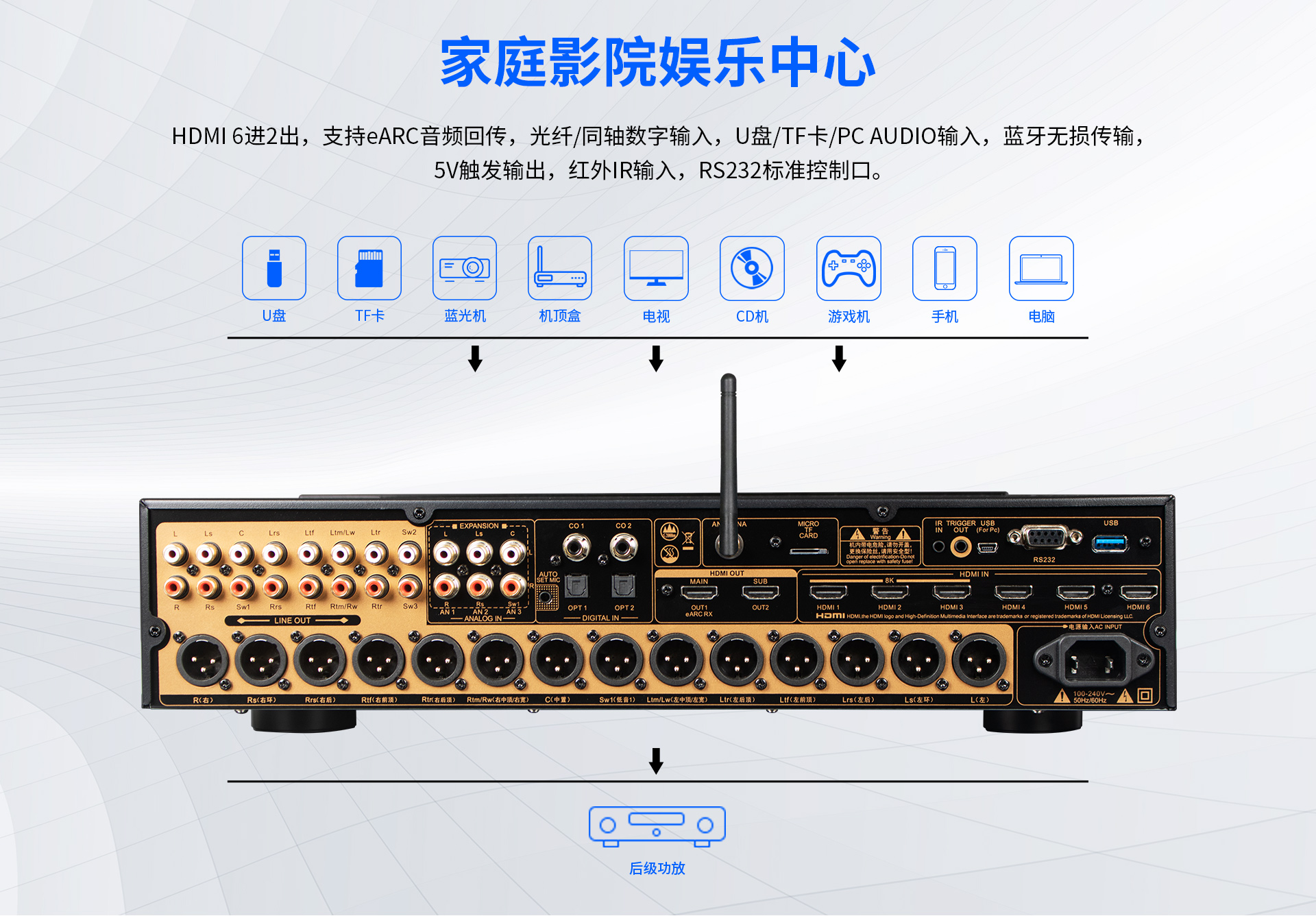 二、功能特點(diǎn) 1.支持Dolby Atmos、DolbyTrue-HD及向下兼容所有杜比音頻編碼文件; 2.支持DTS:X、DTS-Master及向下兼容所有DTS音頻編碼文件; 3.支持HDMI2.1,支持HDCP2.3; 4.支持8K,YUV4:4:4,40GHz全帶寬高清視頻信號; 5.支持Dolbyvision、HLG、HDR 10、HDR 10+高清視頻信號; 6.全平衡7.1.6/9.1.4杜比全景聲信號輸出,非平衡7.3.6/9.3.4杜比全景聲信號輸出; 7.房間EQ、揚(yáng)聲器距離、延時(shí)、聲壓的自動測試及補(bǔ)償,一鍵式操作,全自動校正,同時(shí)支持用戶手動調(diào)節(jié); 8.內(nèi)置高品質(zhì)音樂播放器,支持TF卡及U盤音頻文件播放,支持FLAC、APE、WAV、MP3.WMA等多種無損及有損壓縮音頻格式,支持多層文件夾管理; 9.內(nèi)置藍(lán)牙數(shù)字音頻接收器; 10.支持手機(jī)APP操作,支持紅外遙控,藍(lán)牙遙控; 11.雙2.8英寸高清顯示屏,各種信息一目了然; 12.全中英文音視頻疊加式0SD屏幕顯示菜單; 13.支持本地音樂信息手機(jī)及電視可同步讀取顯示; 14.支持從2.0聲道到7.3.6/9.3,4聲道等多種揚(yáng)聲器配置; 15.支持HDMI 6進(jìn)2出(HDMI1、HDMI2、HDMI3支持8K),2組同軸、2組光纖數(shù)碼音頻輸入,3組模擬音頻輸入; 16.支持5.1聲道外部混音輸入,可外接混響器; 17.支持RS232集中控制器; 18.支持HDMI eARC音頻回傳,支持CEC控制; 19.支持高達(dá)1000ms時(shí)長的唇音同步調(diào)節(jié); 20.每聲道多達(dá)5-11段參數(shù)EQ; 21.支持音頻編組輸出; 22.選用美國ADI新一代雙核DSP處理器; 23.支持按輸入源獨(dú)立設(shè)置及保存參數(shù)的功能; 24.輸入源獨(dú)立EQ選擇,獨(dú)立音量調(diào)節(jié); 25.支持5V觸發(fā)輸出功能; 26.支持紅外IR輸入功能。
