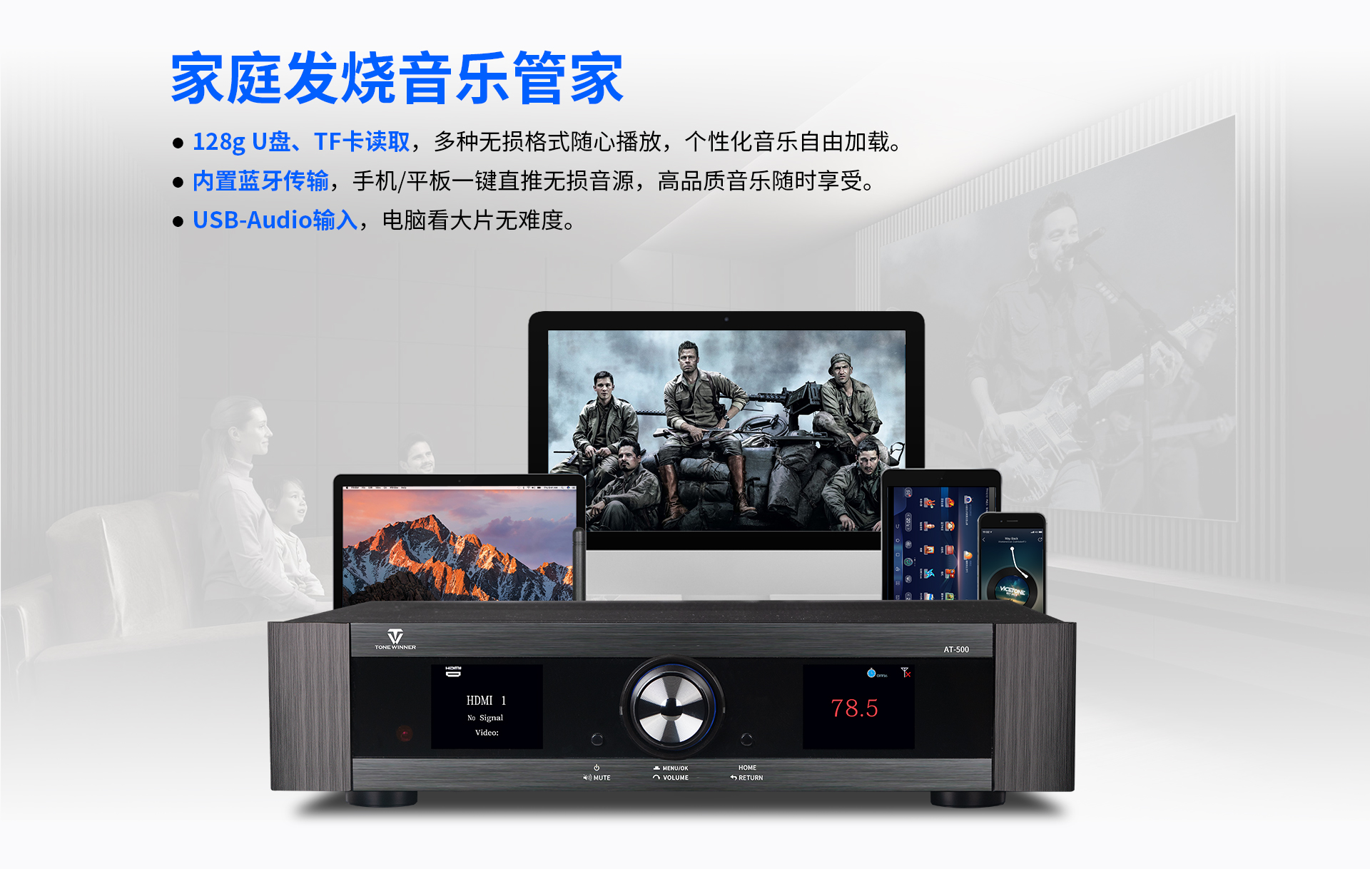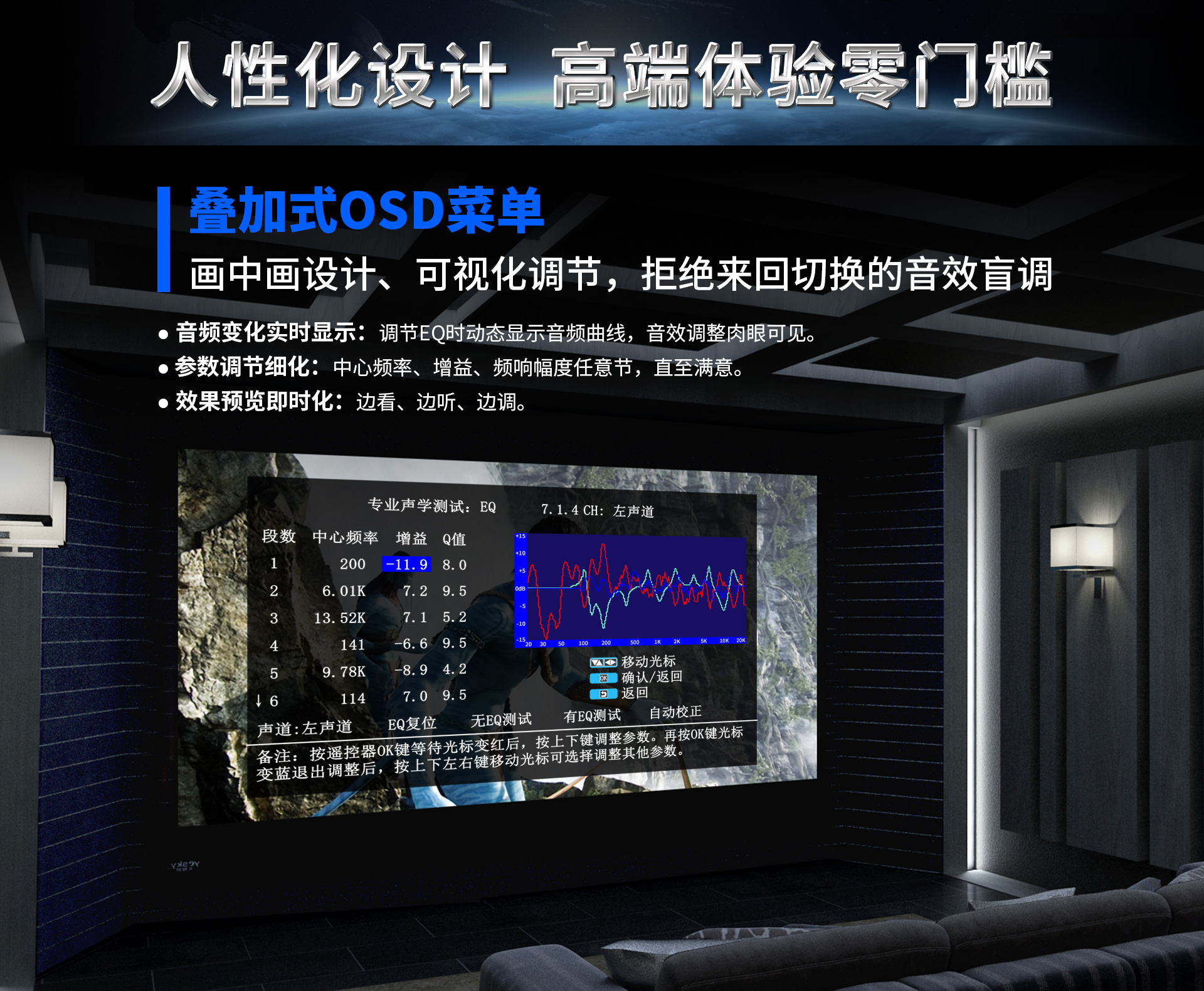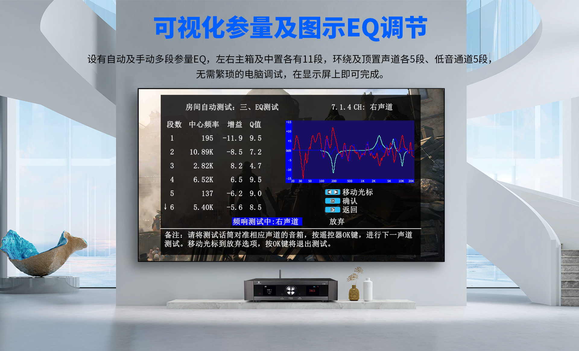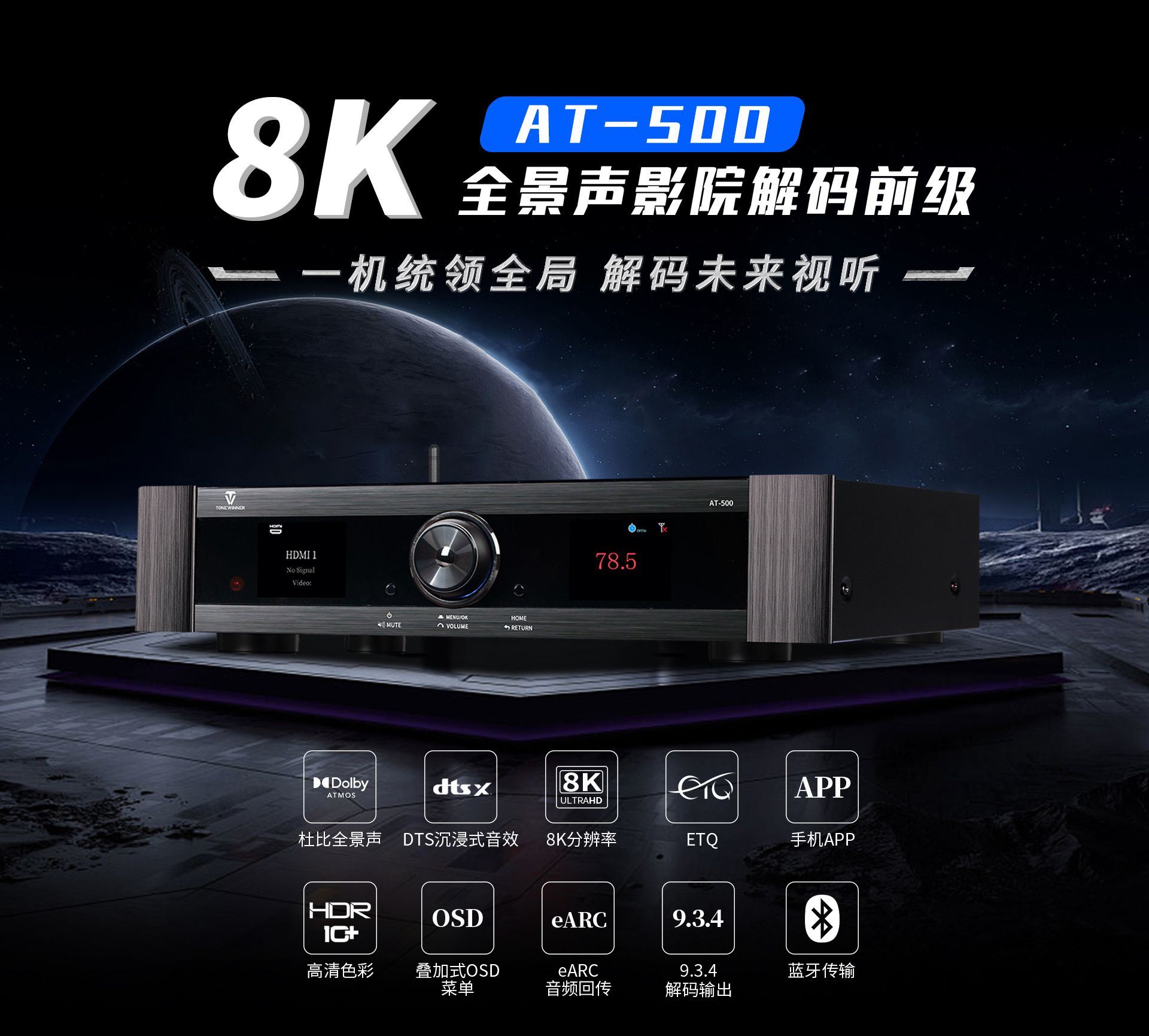 二、功能特點(diǎn) 1.支持Dolby Atmos、DolbyTrue-HD及向下兼容所有杜比音頻編碼文件; 2.支持DTS:X、DTS-Master及向下兼容所有DTS音頻編碼文件; 3.支持HDMI2.1,支持HDCP2.3; 4.支持8K,YUV4:4:4,40GHz全帶寬高清視頻信號; 5.支持Dolbyvision、HLG、HDR 10、HDR 10+高清視頻信號; 6.全平衡7.1.6/9.1.4杜比全景聲信號輸出,非平衡7.3.6/9.3.4杜比全景聲信號輸出; 7.房間EQ、揚(yáng)聲器距離、延時(shí)、聲壓的自動測試及補(bǔ)償,一鍵式操作,全自動校正,同時(shí)支持用戶手動調(diào)節(jié); 8.內(nèi)置高品質(zhì)音樂播放器,支持TF卡及U盤音頻文件播放,支持FLAC、APE、WAV、MP3.WMA等多種無損及有損壓縮音頻格式,支持多層文件夾管理; 9.內(nèi)置藍(lán)牙數(shù)字音頻接收器; 10.支持手機(jī)APP操作,支持紅外遙控,藍(lán)牙遙控; 11.雙2.8英寸高清顯示屏,各種信息一目了然; 12.全中英文音視頻疊加式0SD屏幕顯示菜單; 13.支持本地音樂信息手機(jī)及電視可同步讀取顯示; 14.支持從2.0聲道到7.3.6/9.3,4聲道等多種揚(yáng)聲器配置; 15.支持HDMI 6進(jìn)2出(HDMI1、HDMI2、HDMI3支持8K),2組同軸、2組光纖數(shù)碼音頻輸入,3組模擬音頻輸入; 16.支持5.1聲道外部混音輸入,可外接混響器; 17.支持RS232集中控制器; 18.支持HDMI eARC音頻回傳,支持CEC控制; 19.支持高達(dá)1000ms時(shí)長的唇音同步調(diào)節(jié); 20.每聲道多達(dá)5-11段參數(shù)EQ; 21.支持音頻編組輸出; 22.選用美國ADI新一代雙核DSP處理器; 23.支持按輸入源獨(dú)立設(shè)置及保存參數(shù)的功能; 24.輸入源獨(dú)立EQ選擇,獨(dú)立音量調(diào)節(jié); 25.支持5V觸發(fā)輸出功能; 26.支持紅外IR輸入功能。