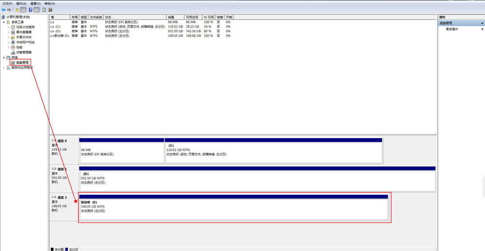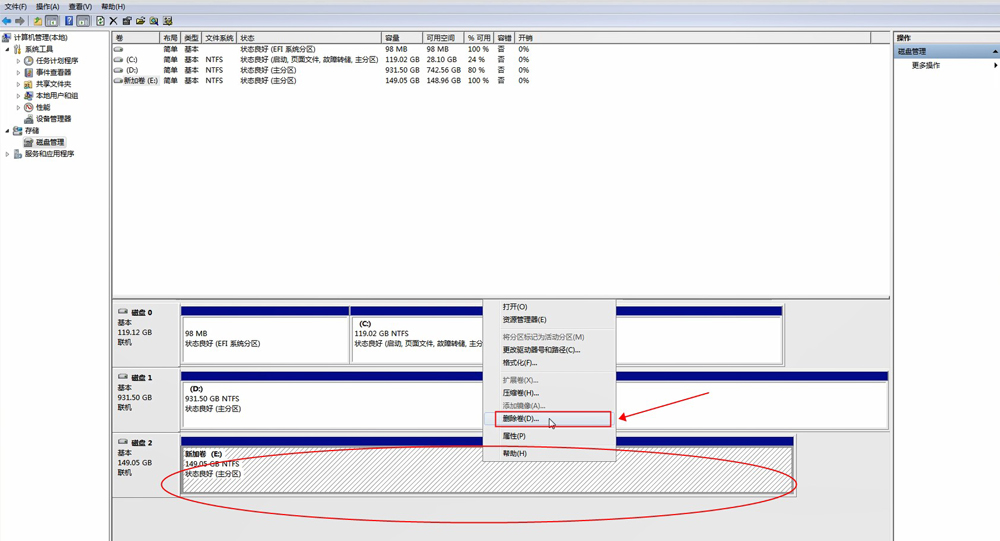 3.點擊選擇需要重新分區的磁盤,將鼠標移至下圖位置,需要先將硬盤內容格式化,點擊鼠標右鍵選擇【刪除卷】,按步驟指示操作完成即可(刪除卷會清除其上所有數據,請在刪除之前備份所有需要保留的數據)。