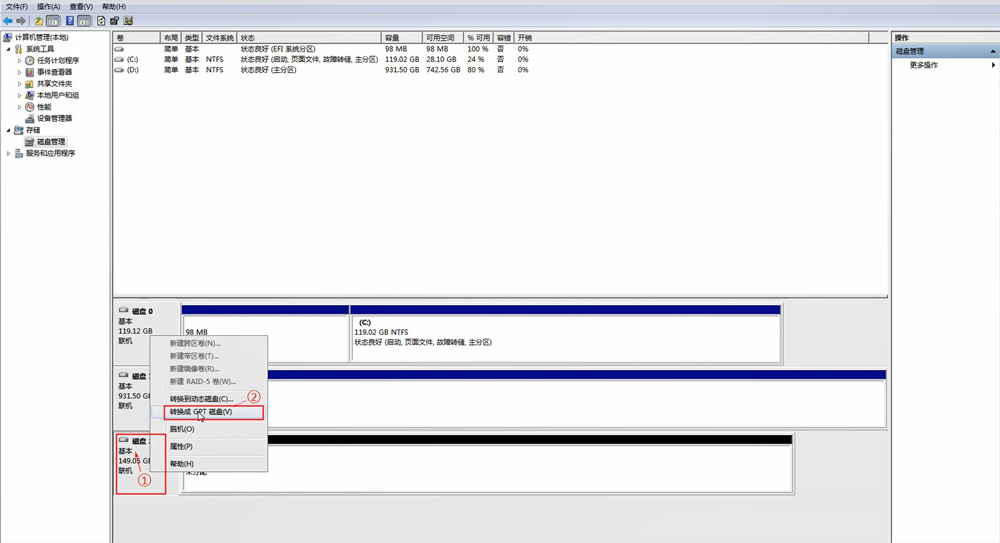 4.點擊圖三①位置,按鼠標右鍵出現對話框,先選擇【轉換成GPT硬盤】,然后按同樣的步驟再點擊一次,出現圖五窗口,選擇【轉換成MBR硬盤】,帶電腦操作完成后,硬盤MBR分區就已經轉換完成了。