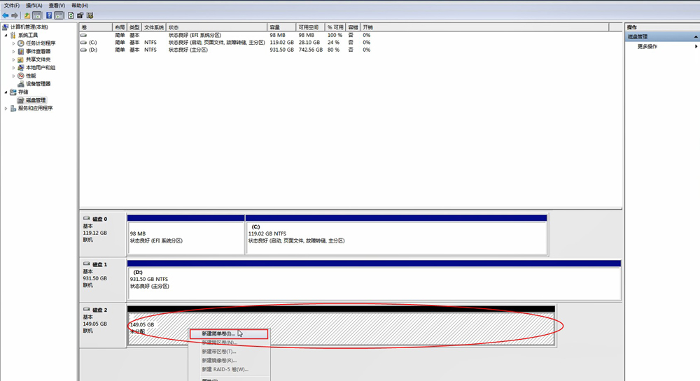 5.最后,如圖六所示,右擊鼠標選擇【新建簡單卷】,根據自己的需求,設置分區大小,將自己喜歡的音樂重新拷貝到分區的硬盤內就完成了。